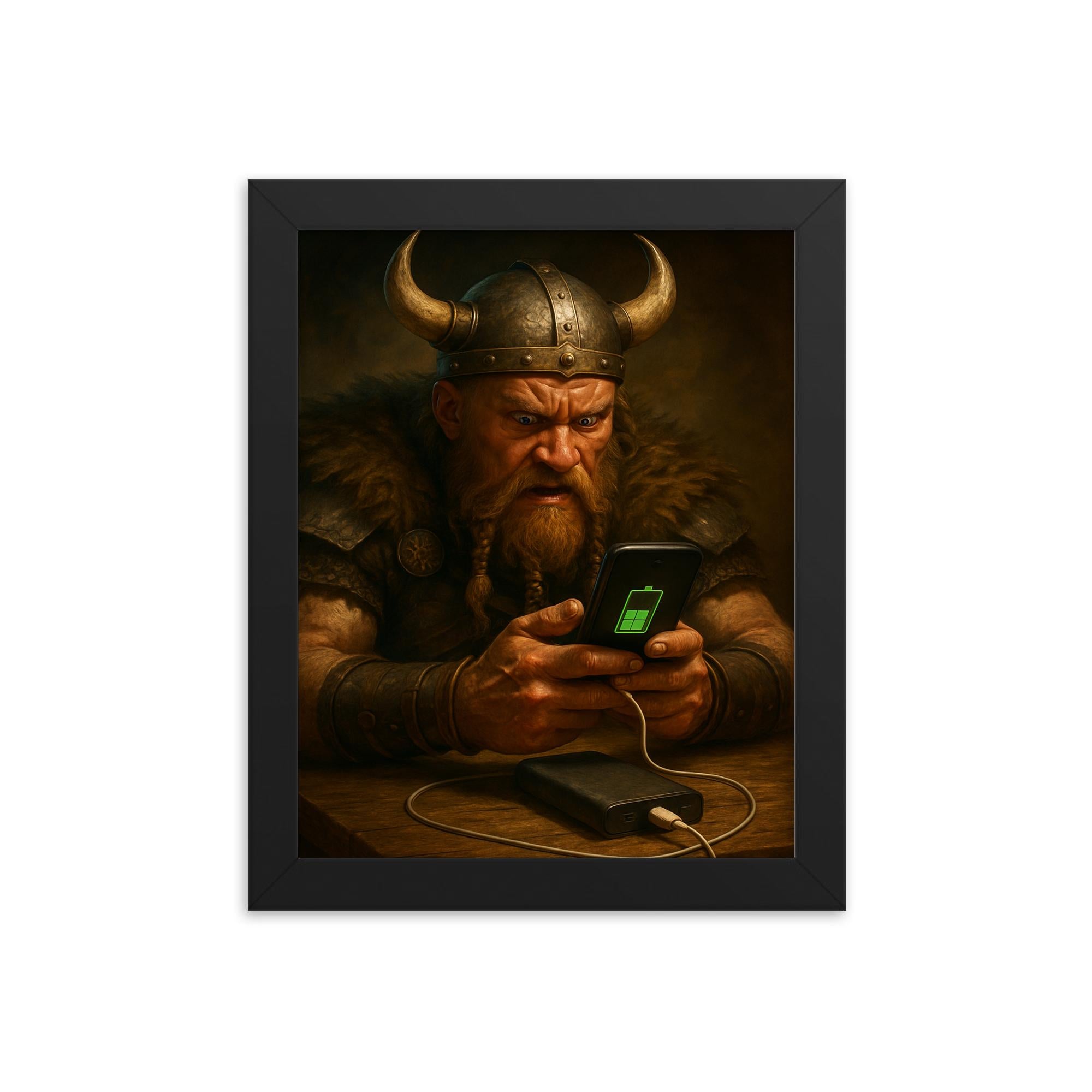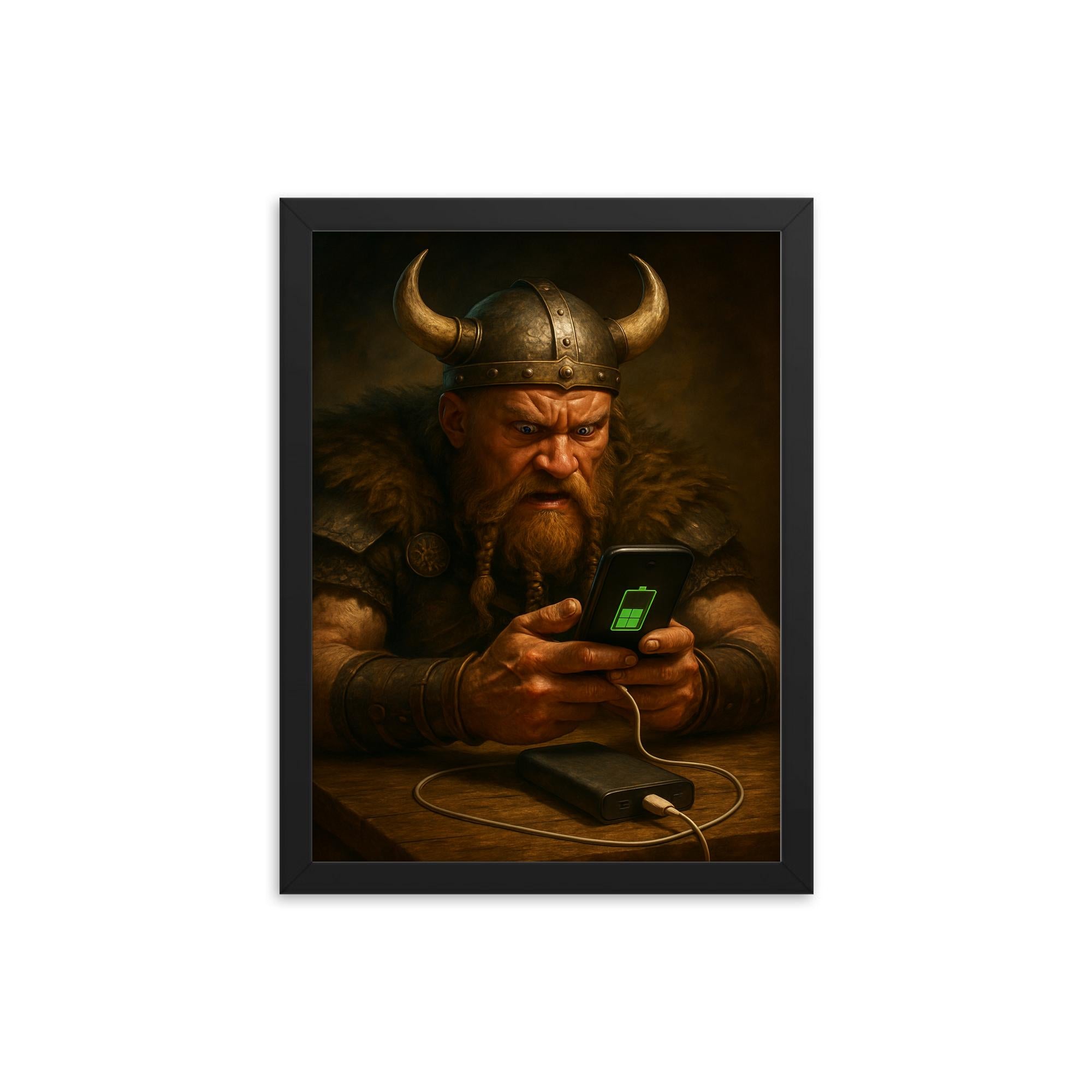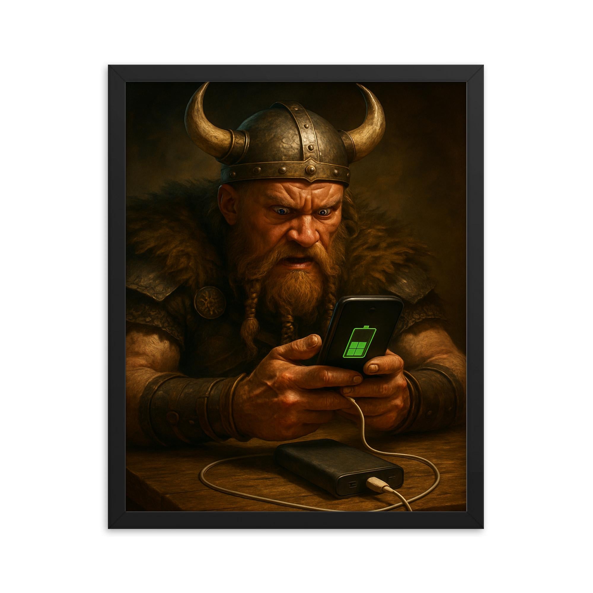 Elevate your space with this striking framed print featuring a fierce Viking warrior intently watching his smartphone charge on a power bank—a bold fusion of ancient valor and modern technology.