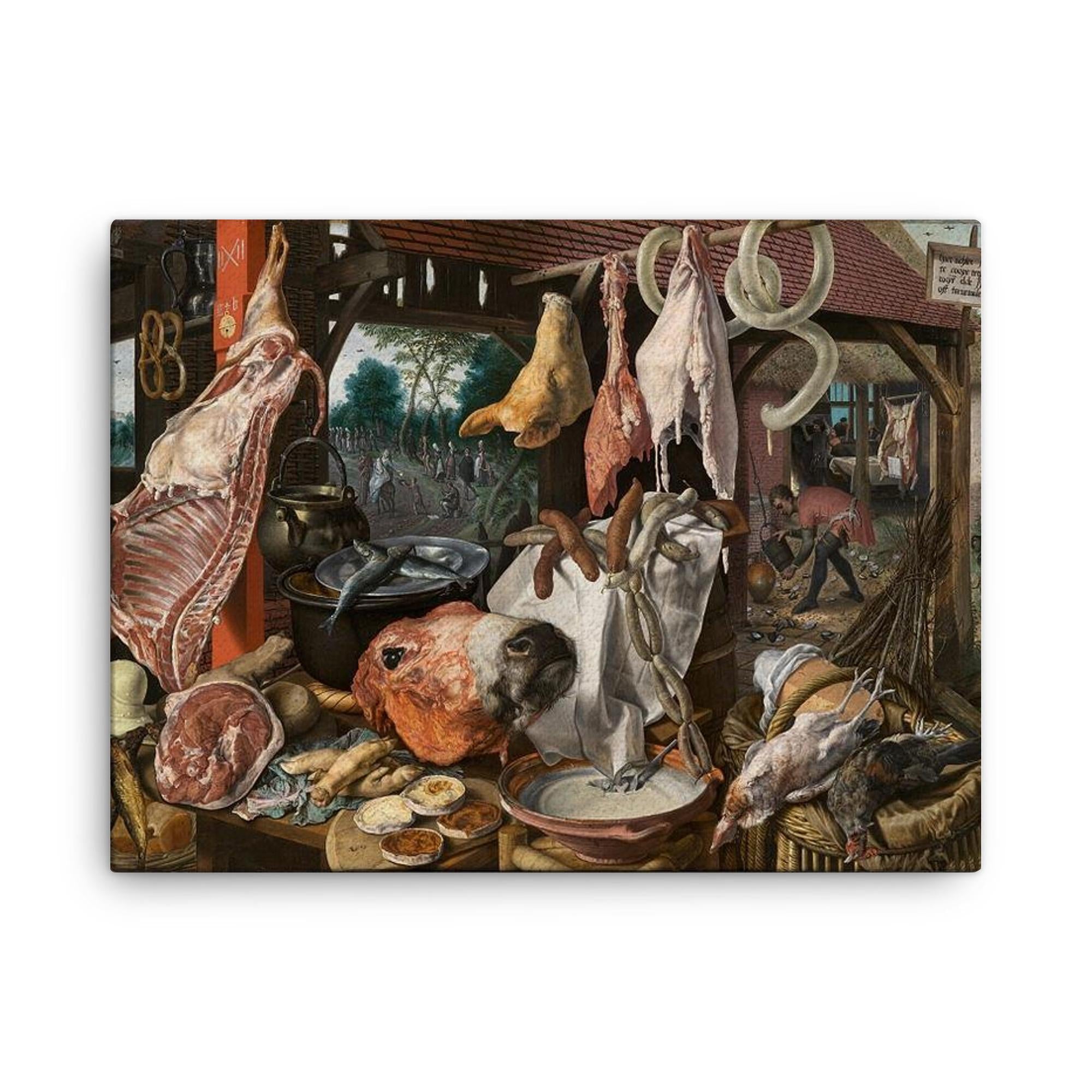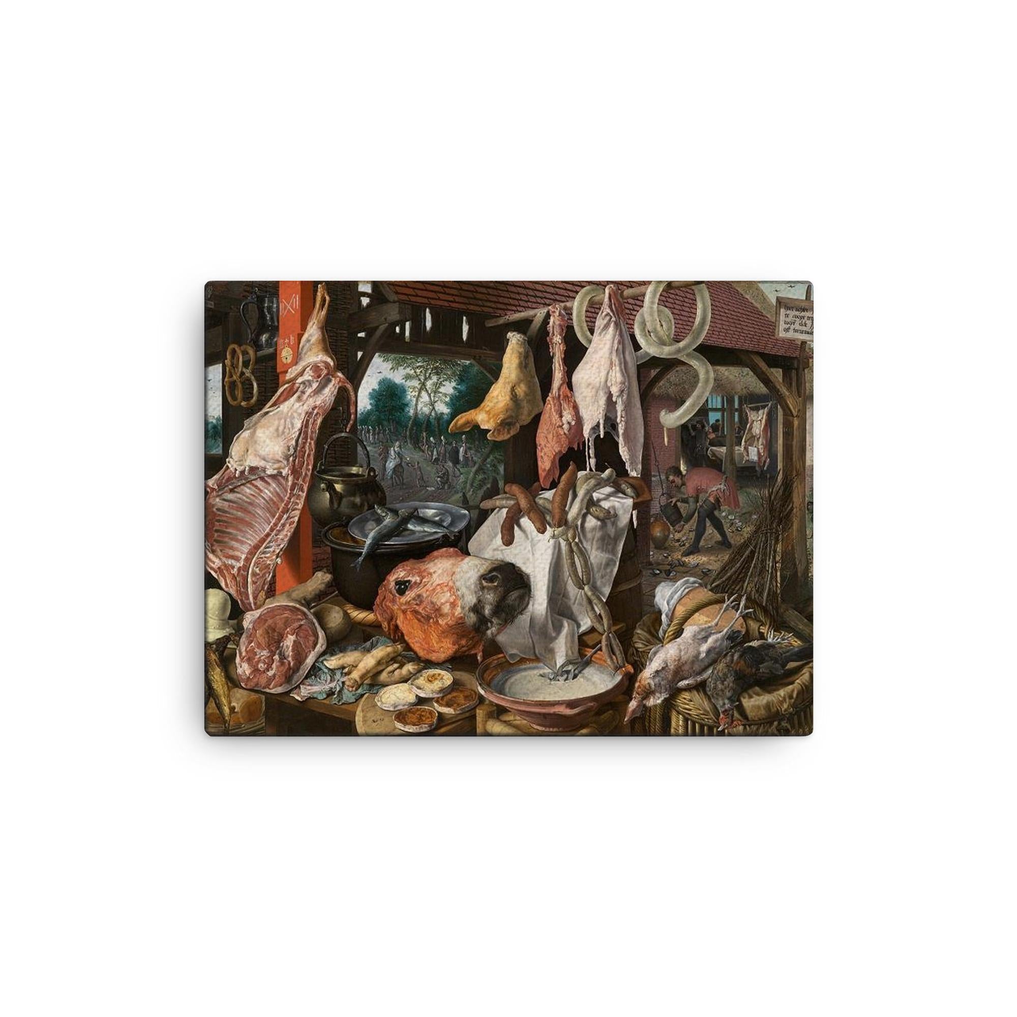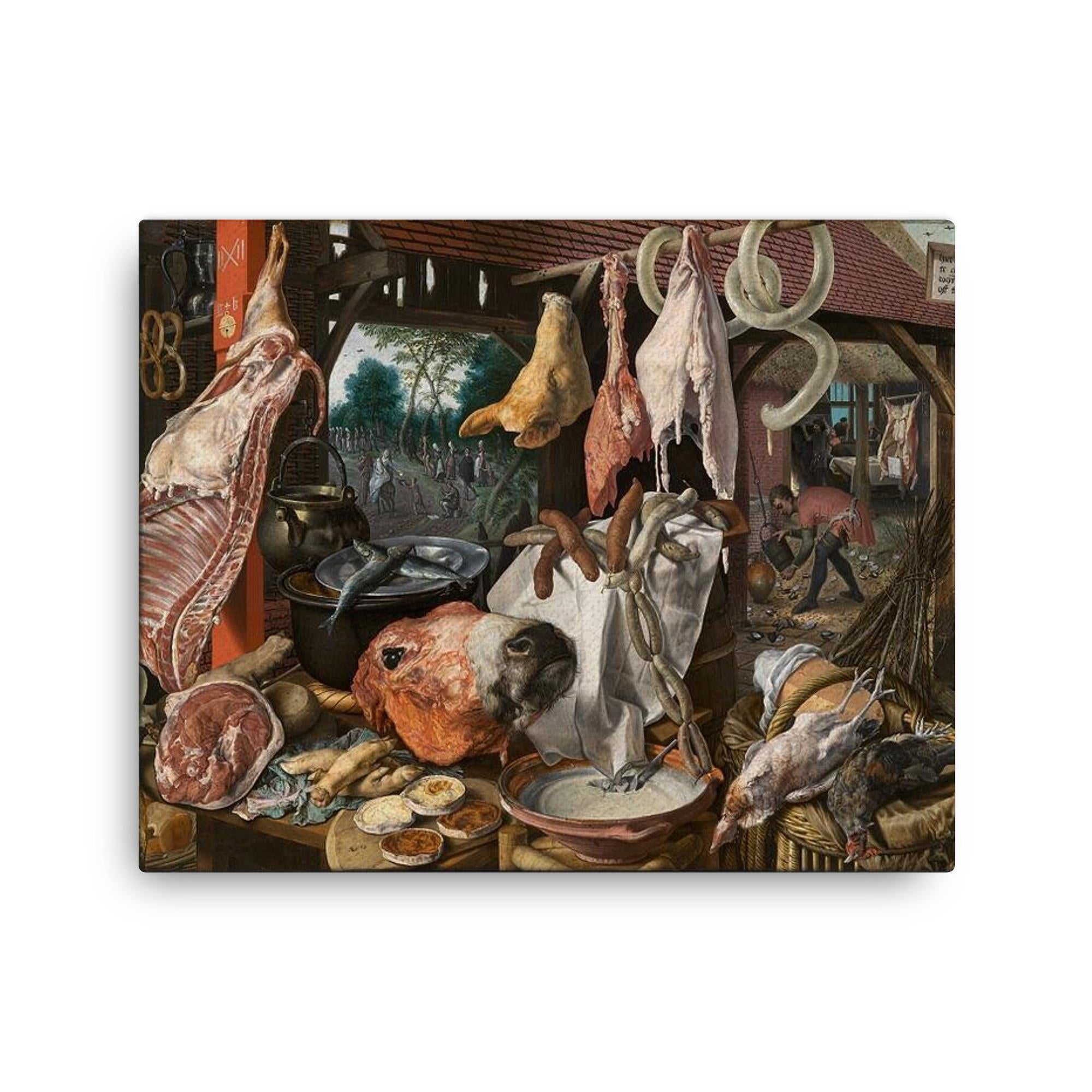 Transform your living space with this stunning canvas print of "A Meat Stall With the Holy Family Giving Alms" by Aertsen, a masterpiece that blends intricate detail and timeless storytelling.