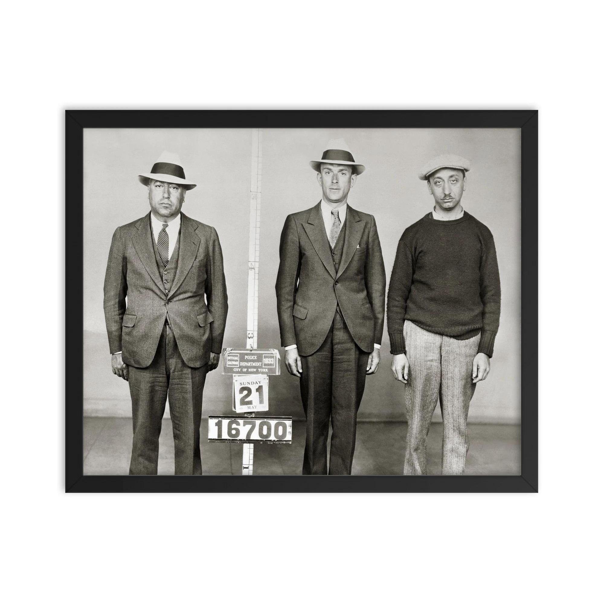 Step back in time with this striking framed print capturing a rare glimpse into New York City’s roaring 1933 underworld. Featuring the iconic police mug shot of notorious gangster and bootlegger Waxey Gordon alongside two associates, this piece of history is now a bold statement of vintage crime and urban intrigue for your wall.