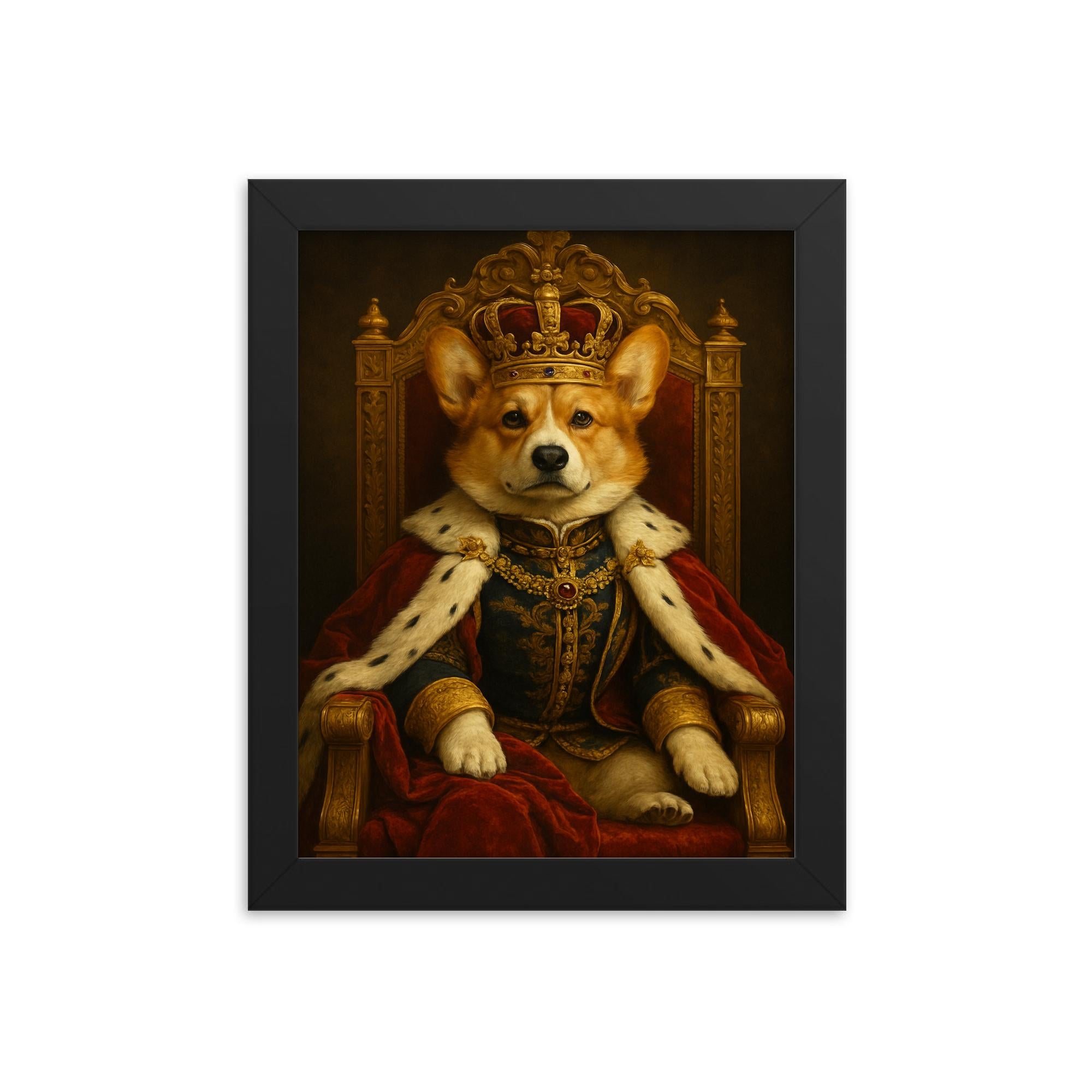 Transform your living space with this striking framed print of a regal Corgi seated on an ornate throne, adorned in full royal regalia and crown.