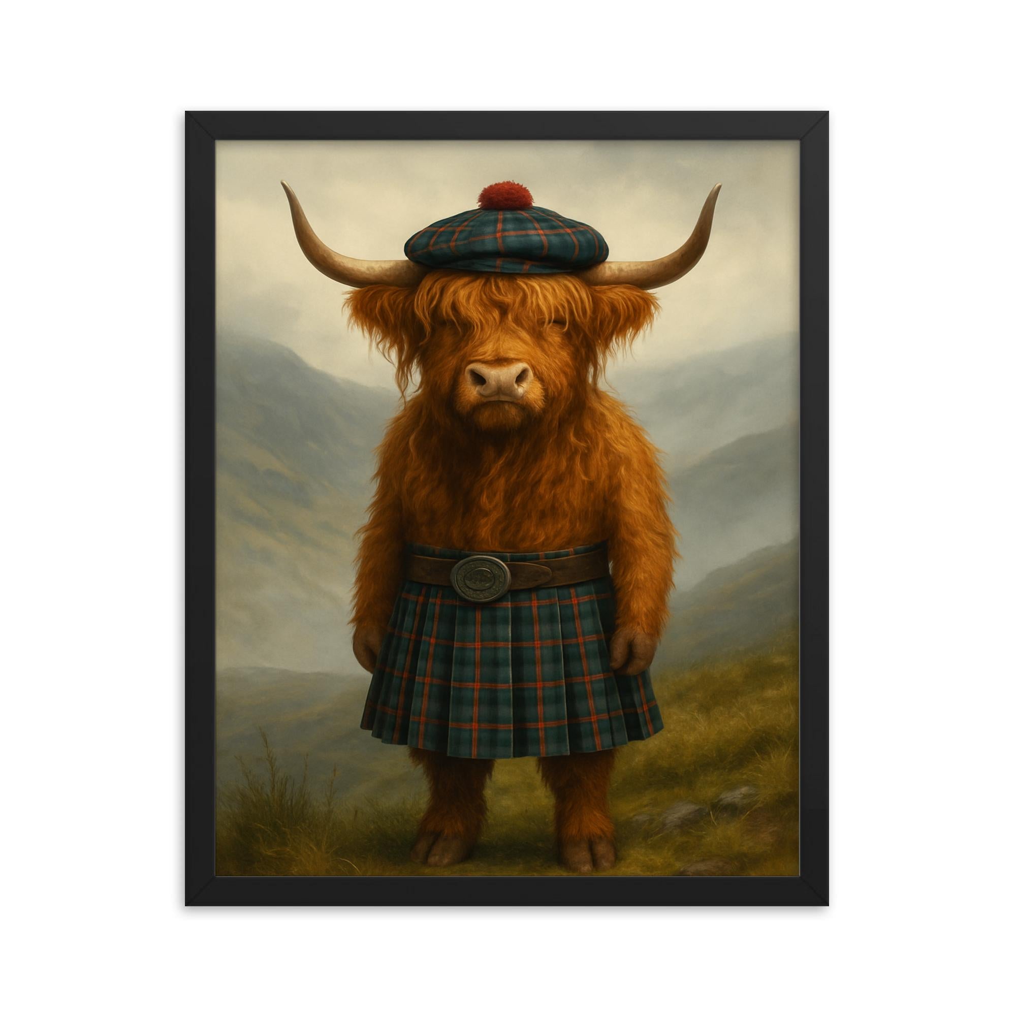 Transform your space with this striking framed print of a Scottish Highland Cow dressed in traditional attire—a kilt and tam o’ shanter—standing proudly on a misty hill.