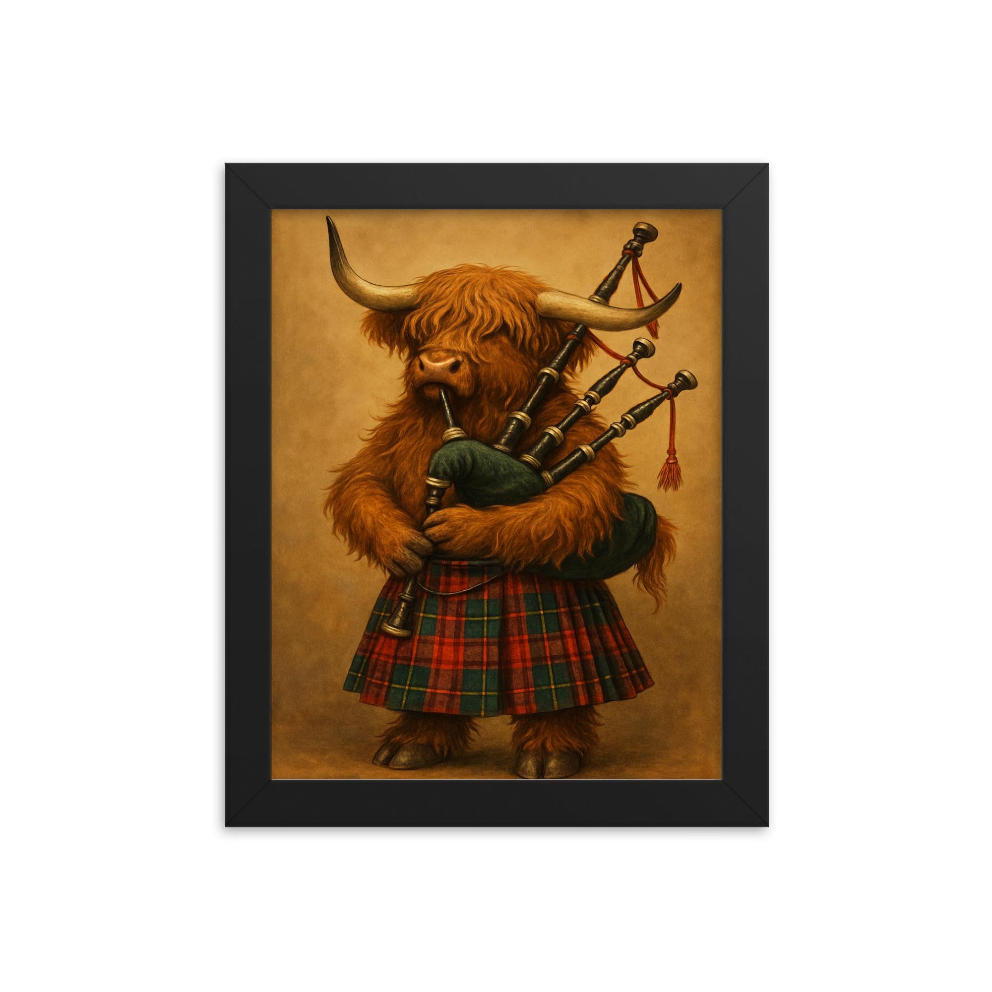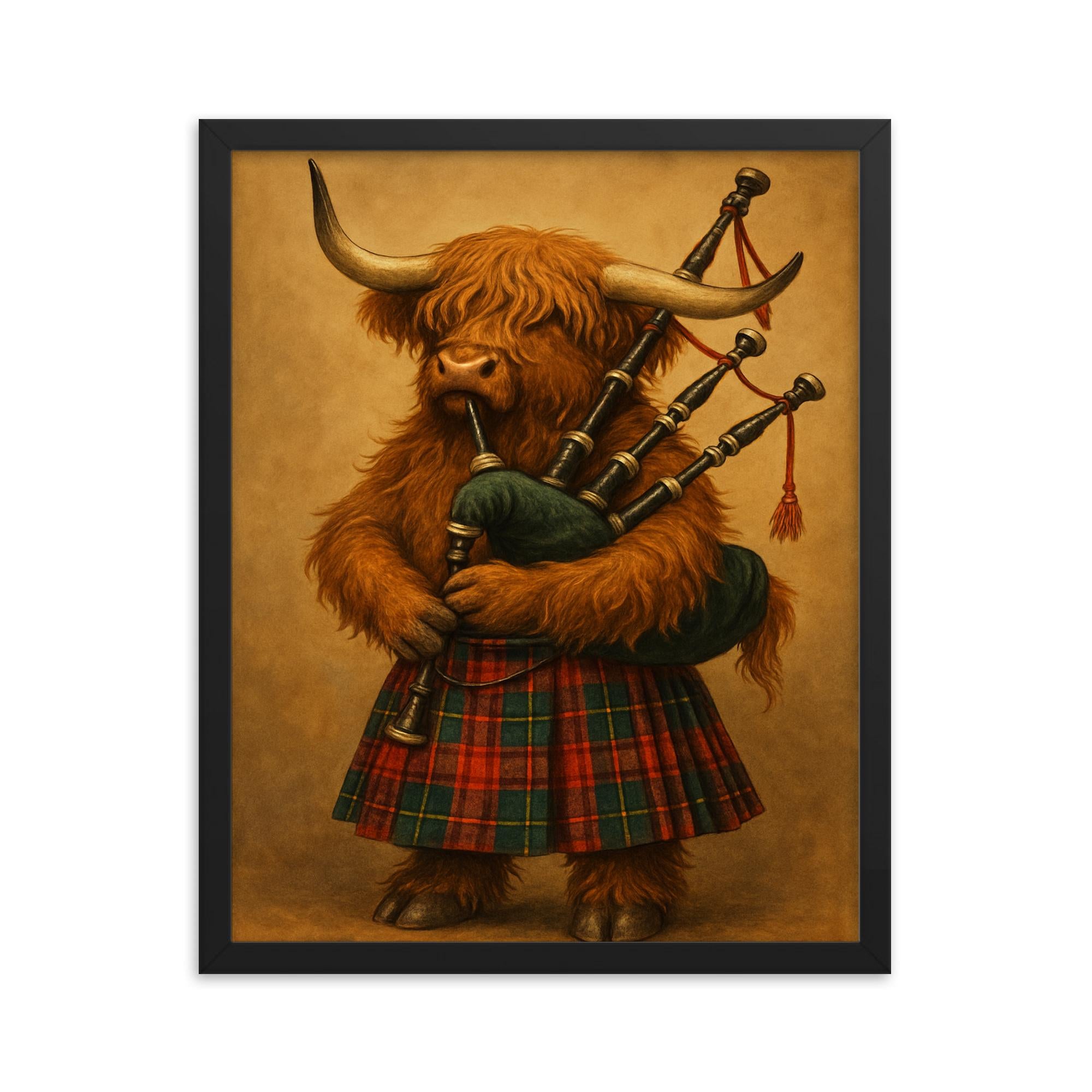 Scottish Highland Cow Wall Art Framed Print – Unique Scottish Bagpiper in Tartan Kilt Home Decor Gift