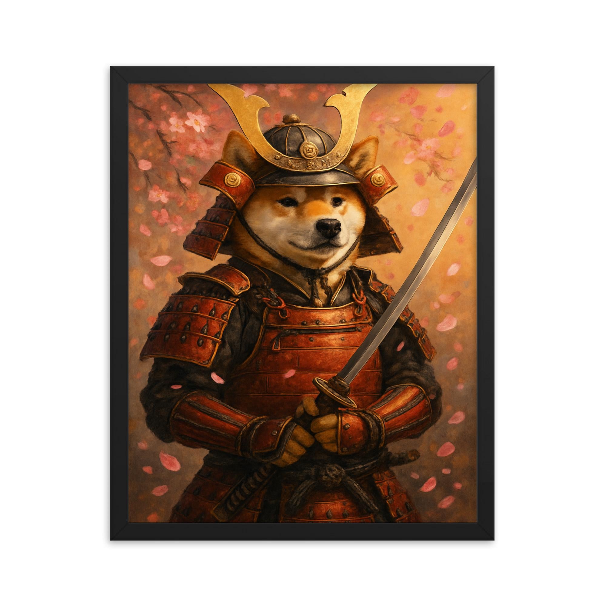 Elevate your space with this stunning framed print featuring a Shiba Inu clad in full samurai armor, gripping a katana amidst a gentle cascade of cherry blossoms.