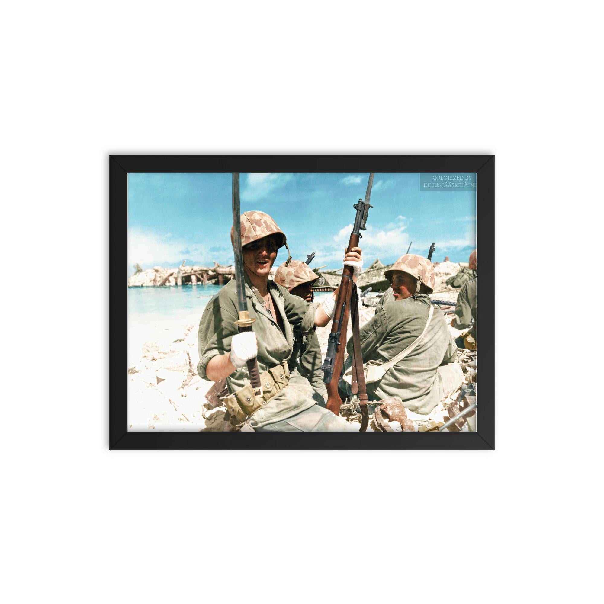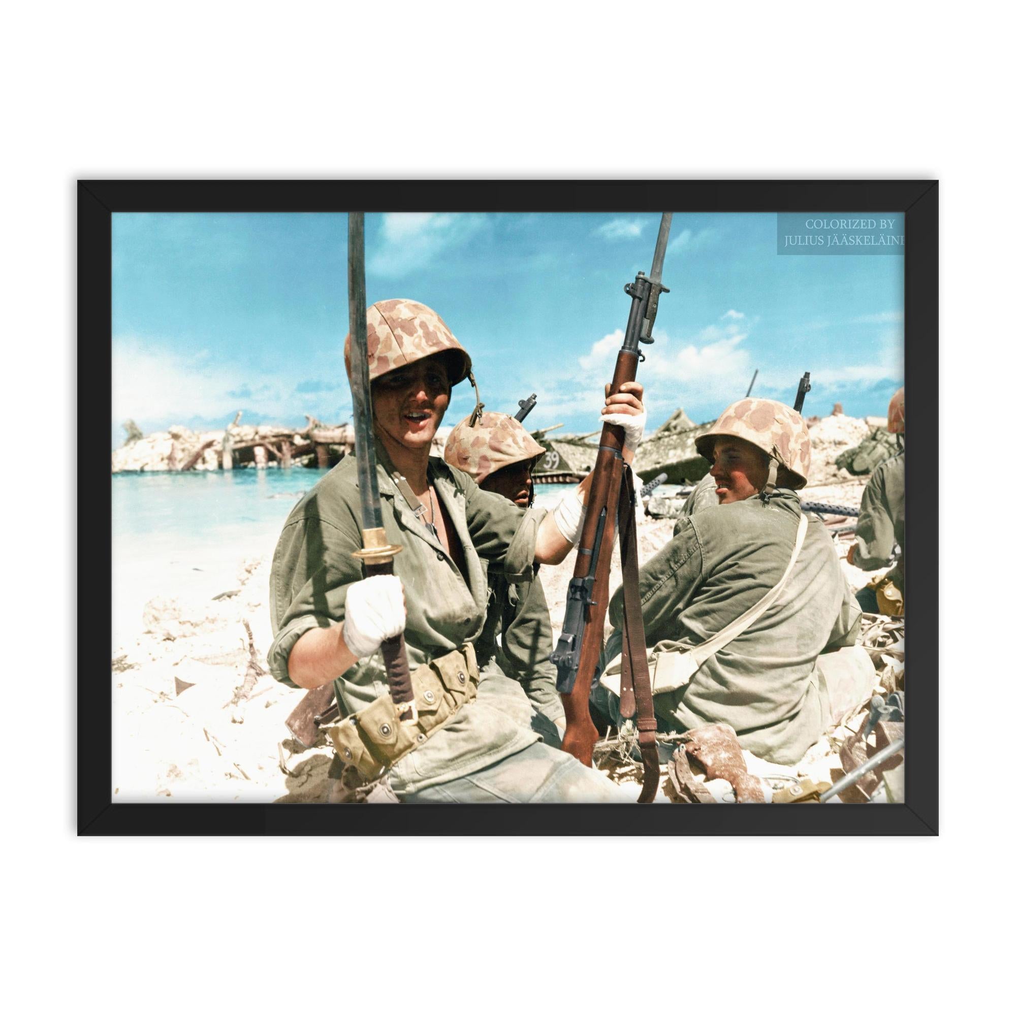 Framed Marine Wall Art – Historic WWII Tarawa Battle, Wounded Hero with Japanese Sword, 1943 Military Photograph Print
