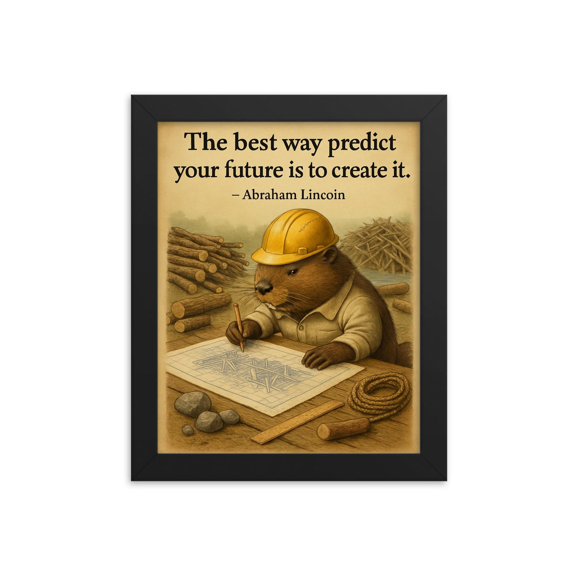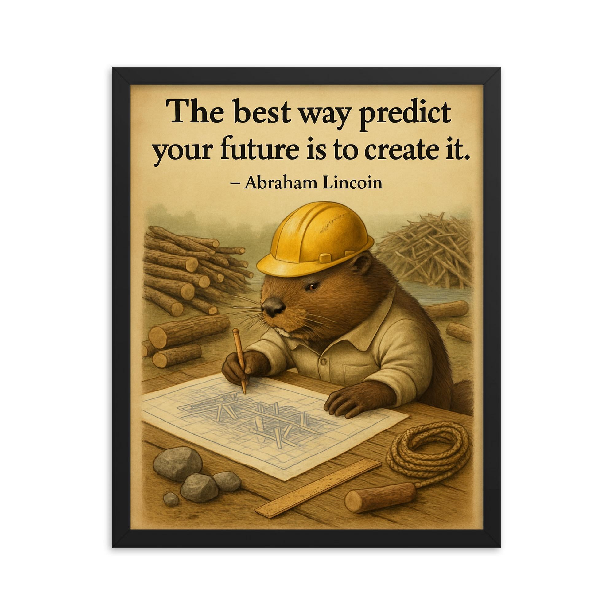 Transform your space with inspiration, motivation, and a touch of whimsy—presenting our framed print featuring the profound Abraham Lincoln quote: "The best way to predict your future is to create it," paired with the unique beaver architect drawing.