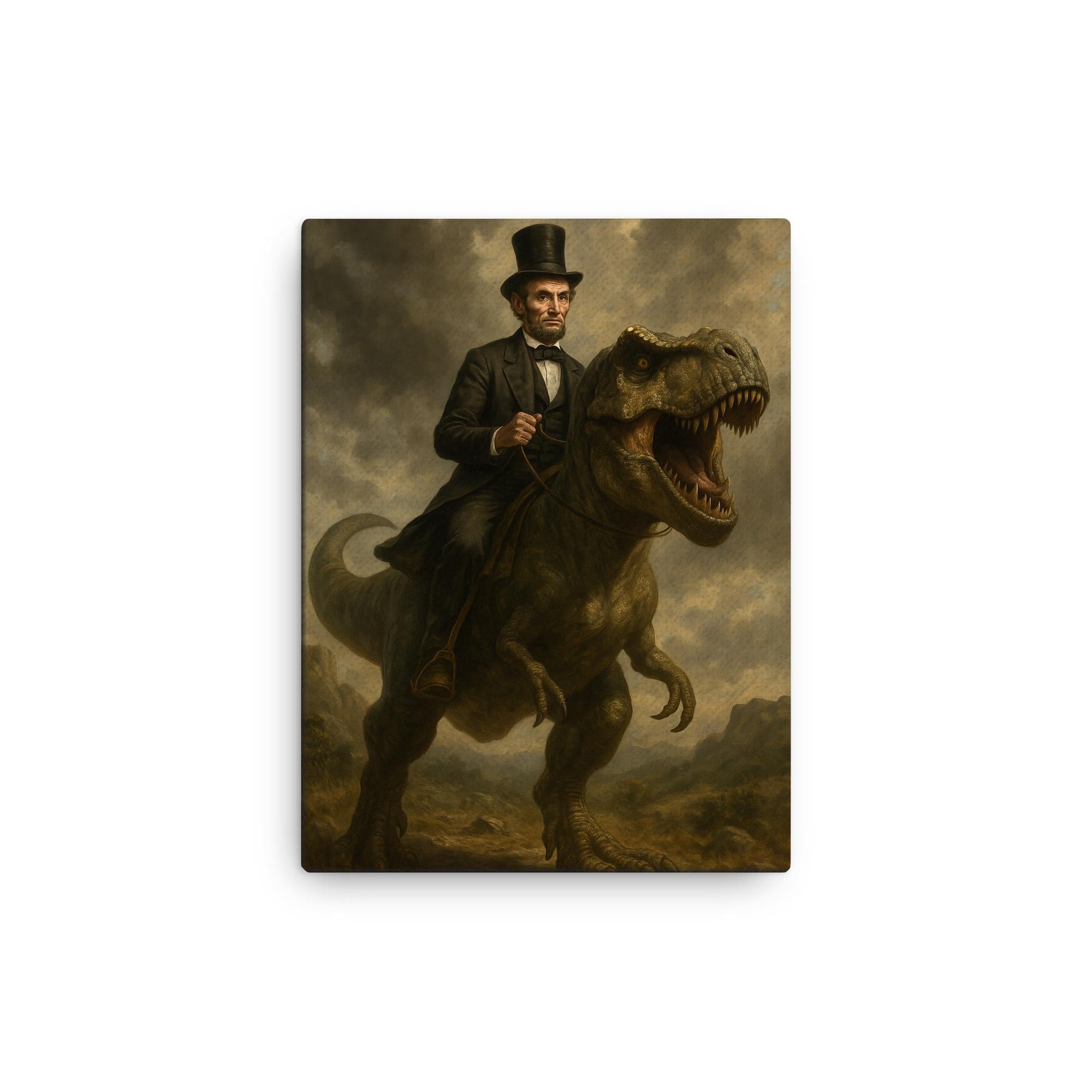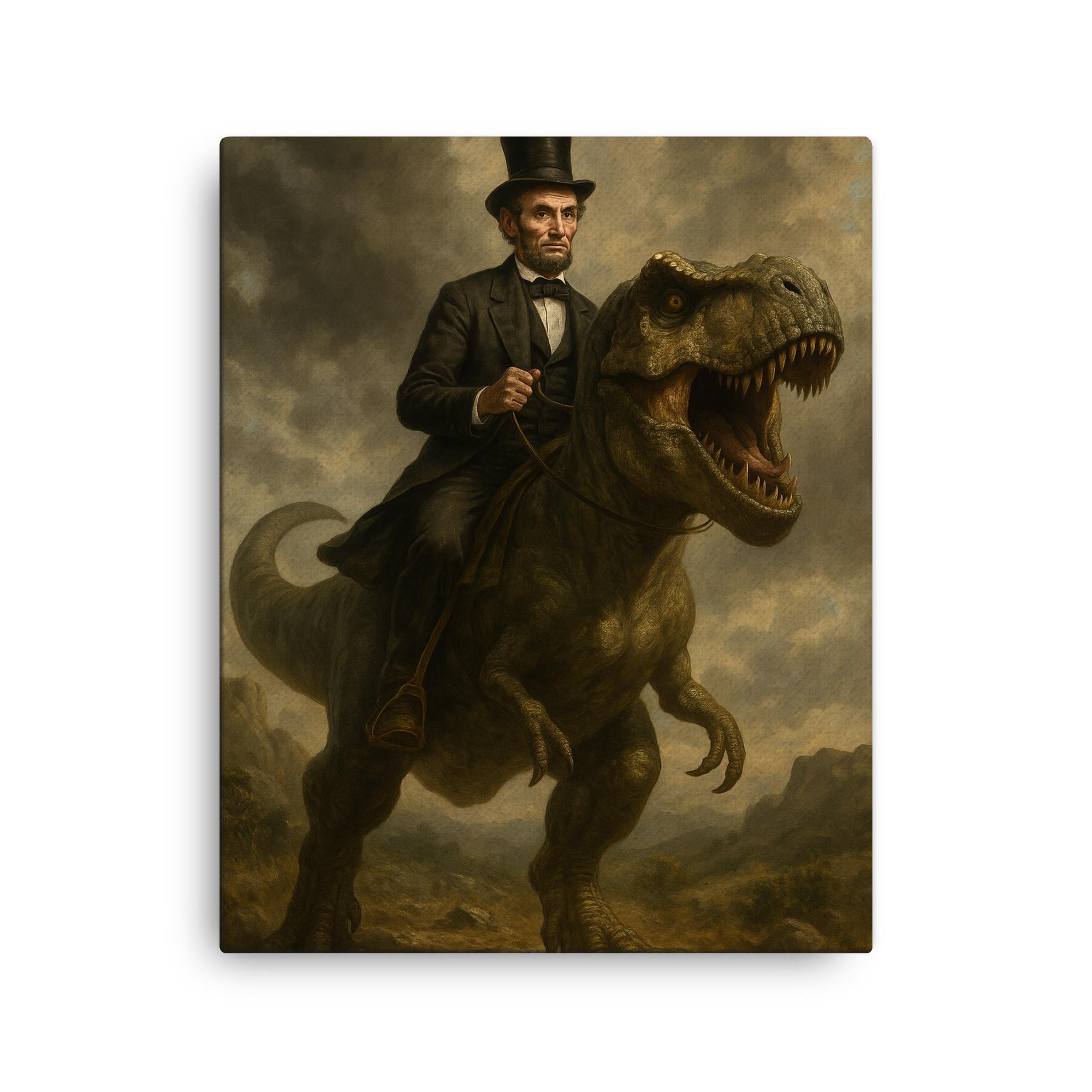 Step into a world where history meets imagination. This Abraham Lincoln Riding a Dinosaur canvas print isn’t just wall art—it’s a conversation starter, a bold declaration of creativity, and the missing piece your space didn’t know it needed.