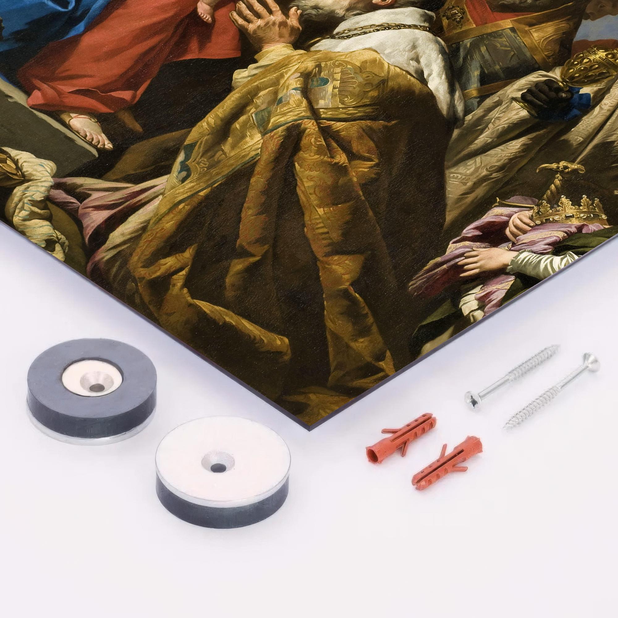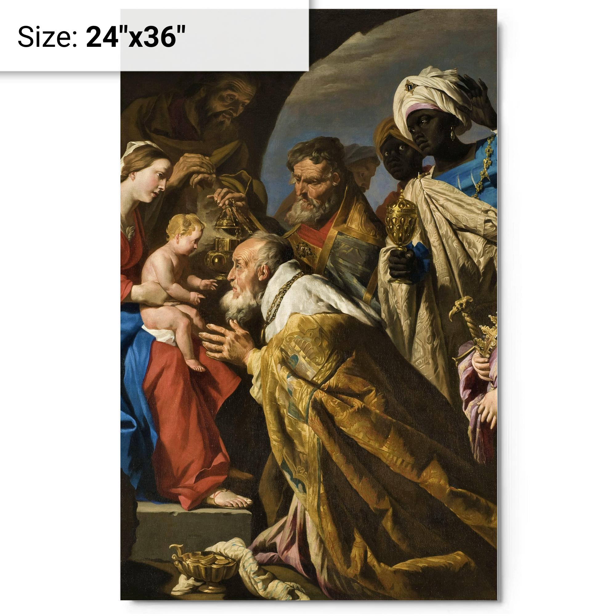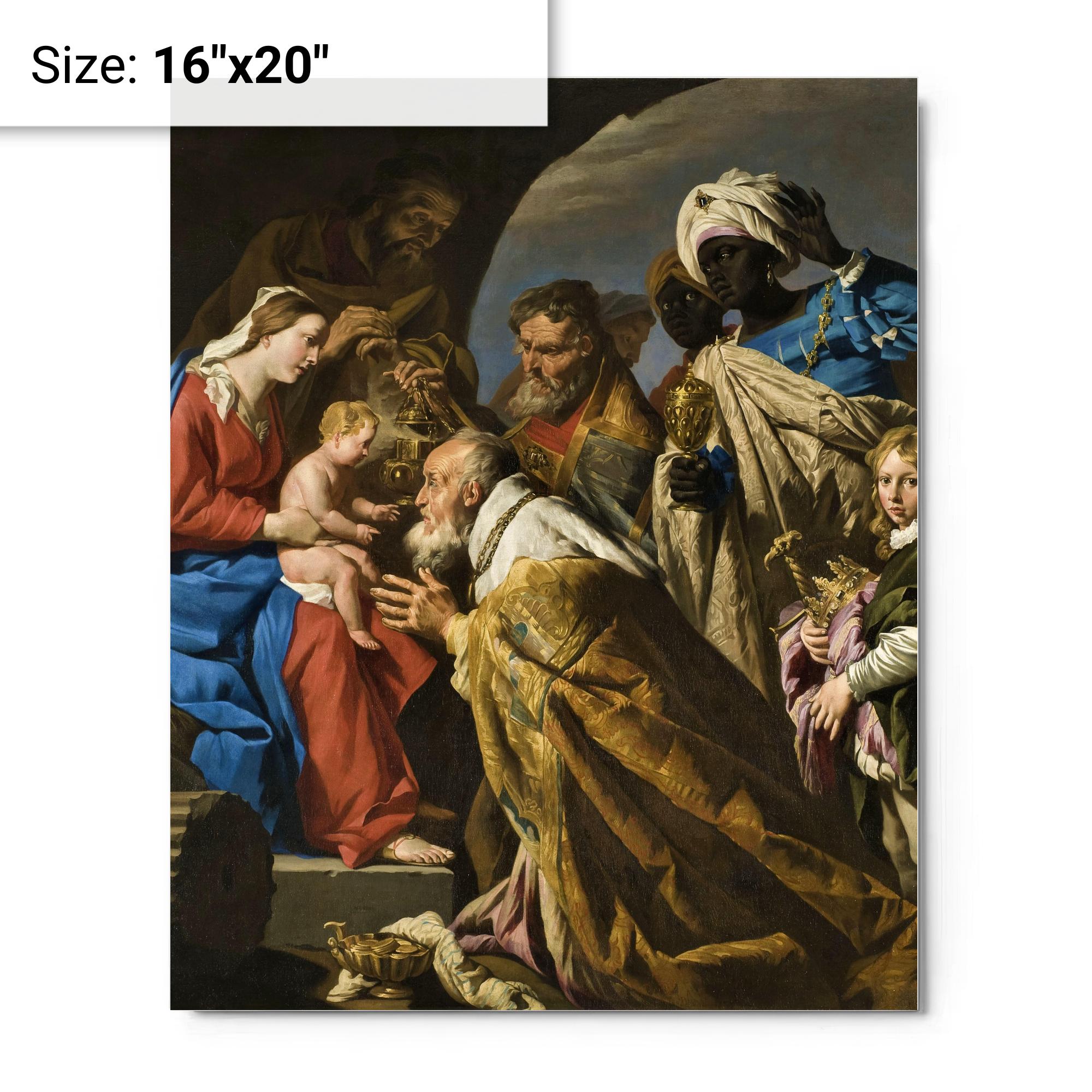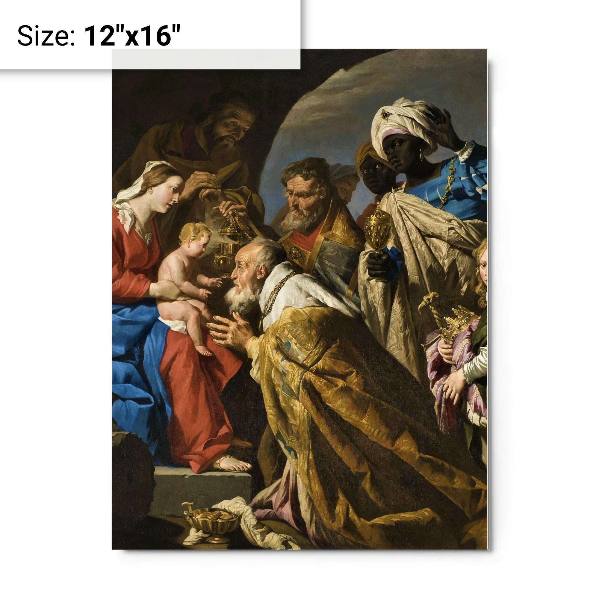 Matthias Stom’s Adoration of the Magi holds a hush — candlelight catching faces turned toward the Christ child — and this metal print brings that intimate drama into your space.