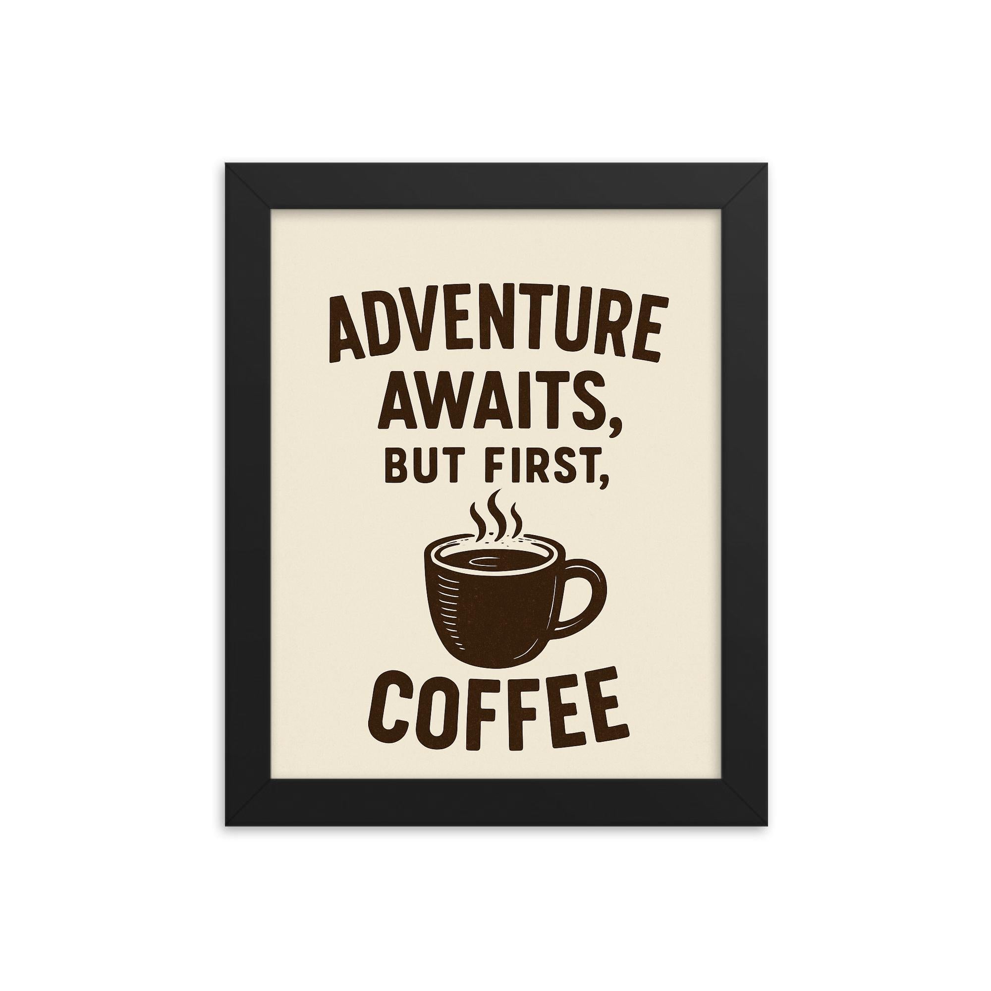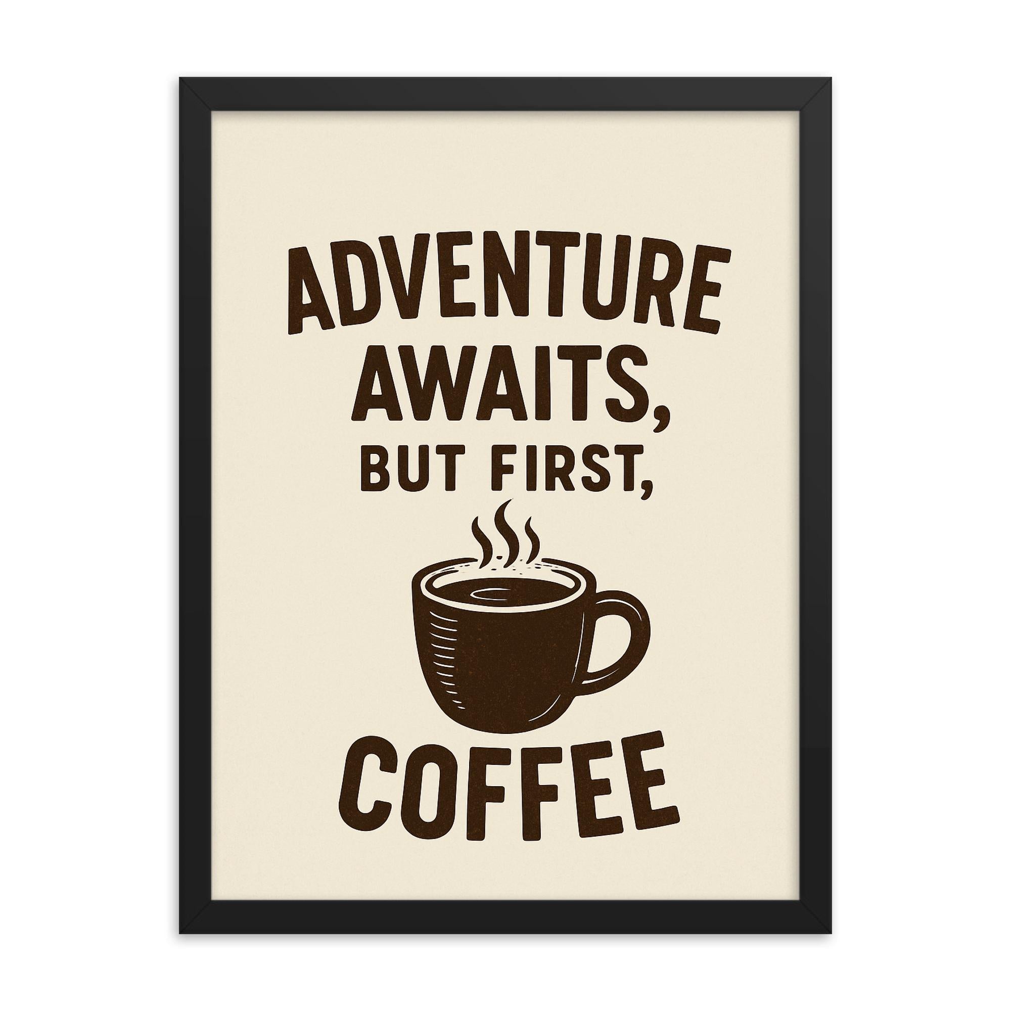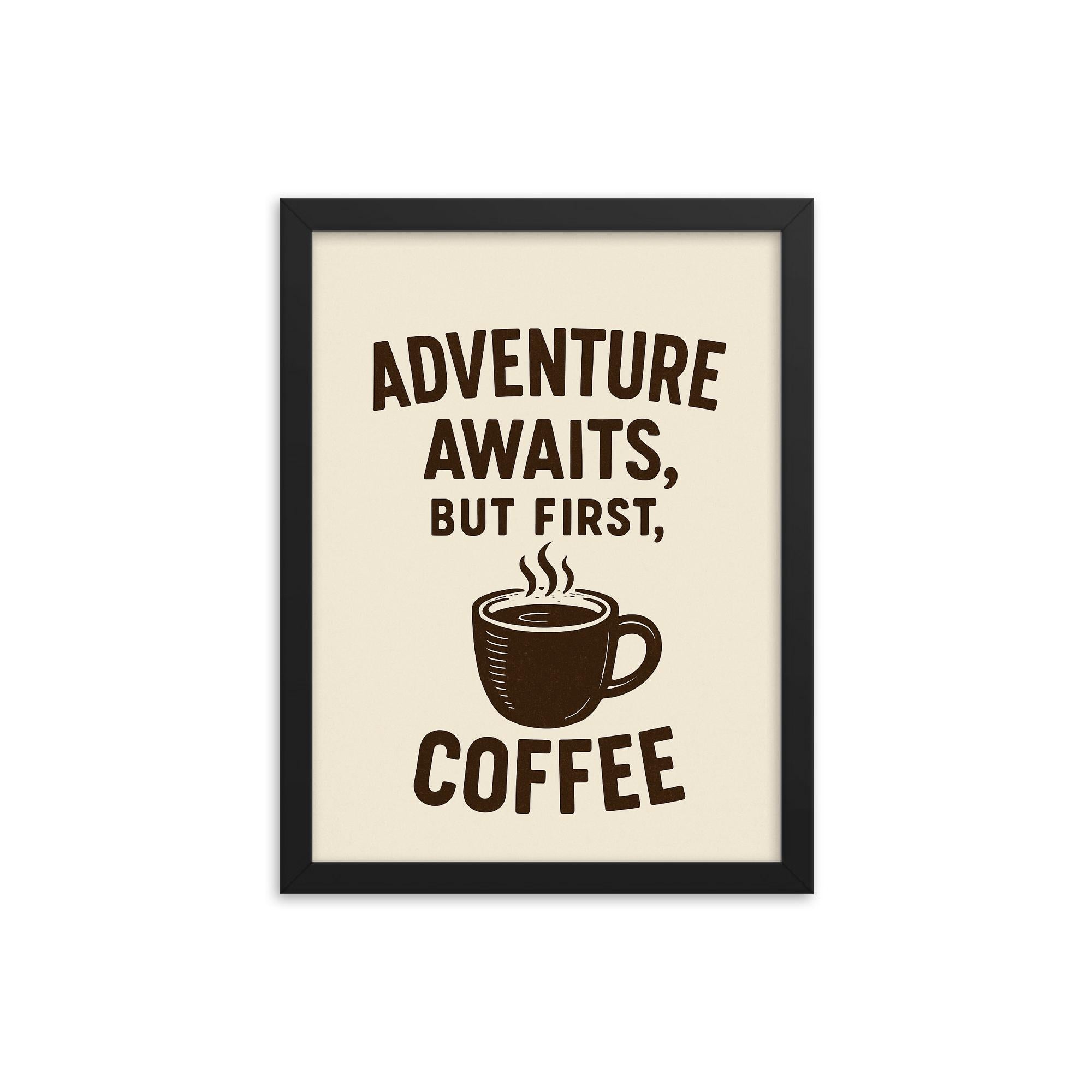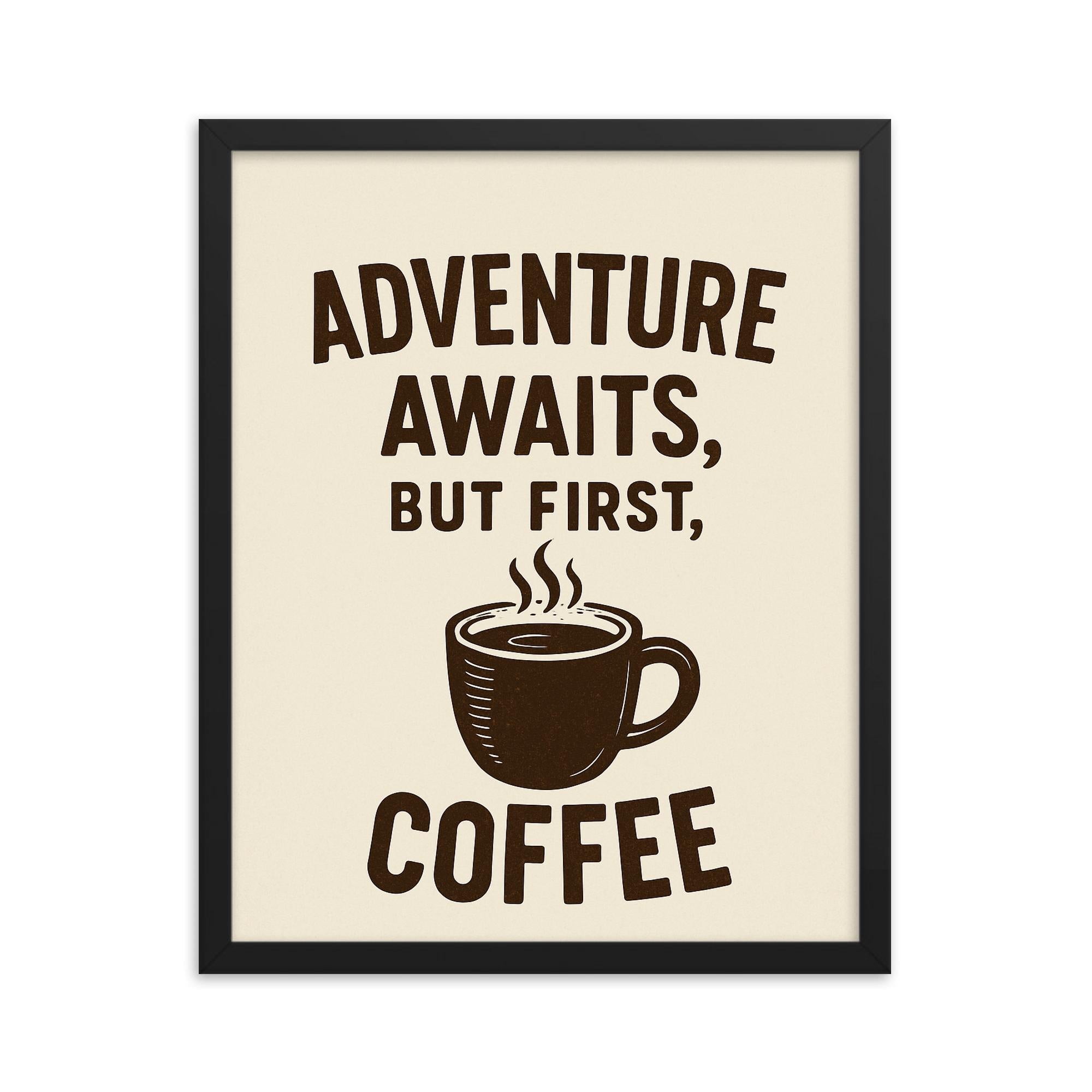 Adventure Awaits But First Coffee Framed Print – Motivational Wall Art, Rustic Home Decor, Unique Gift for Coffee Lovers, Ready to Hang