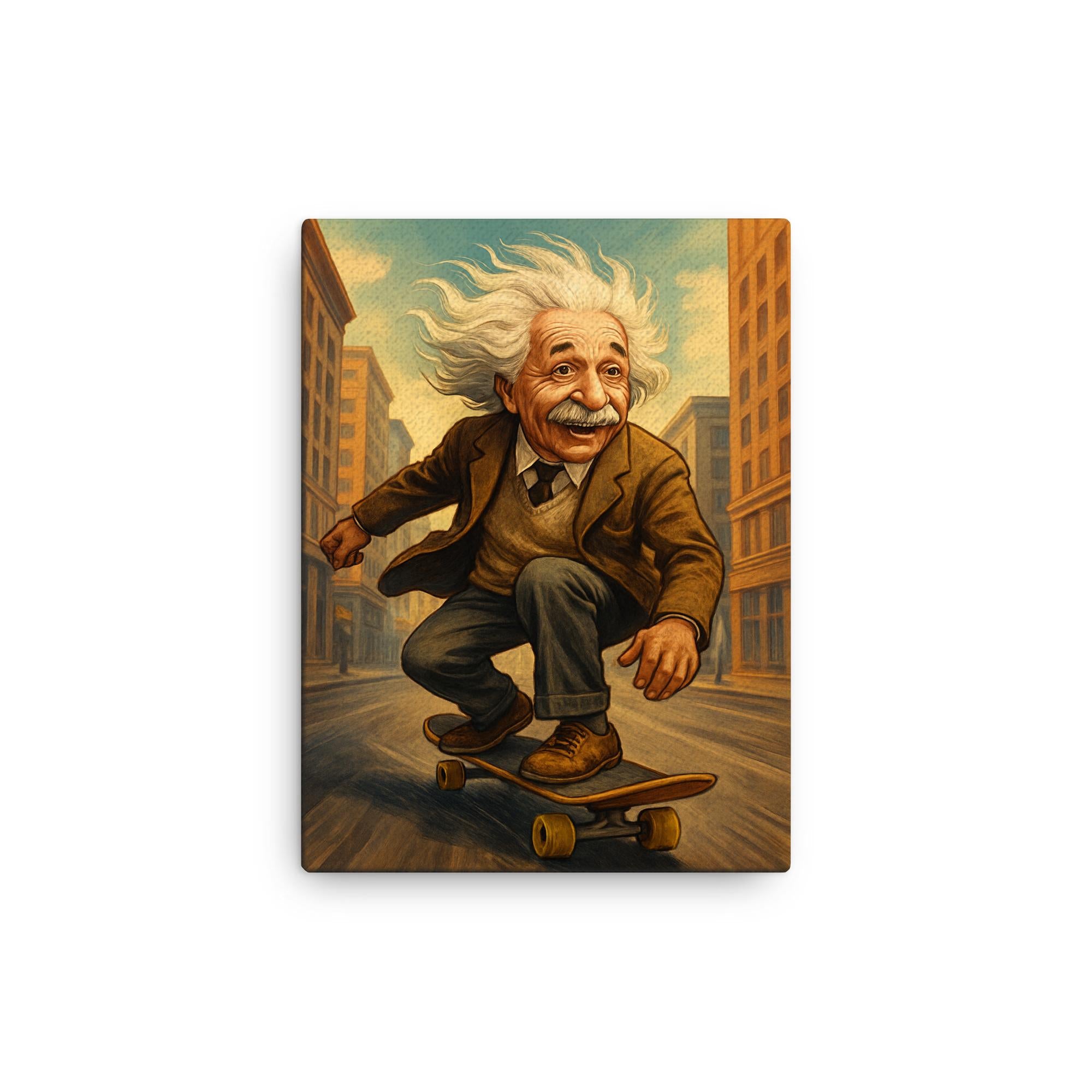 Transform your space with this electrifying canvas print featuring Albert Einstein with his hair flying, riding a skateboard down a city street—a bold fusion of genius and urban energy.