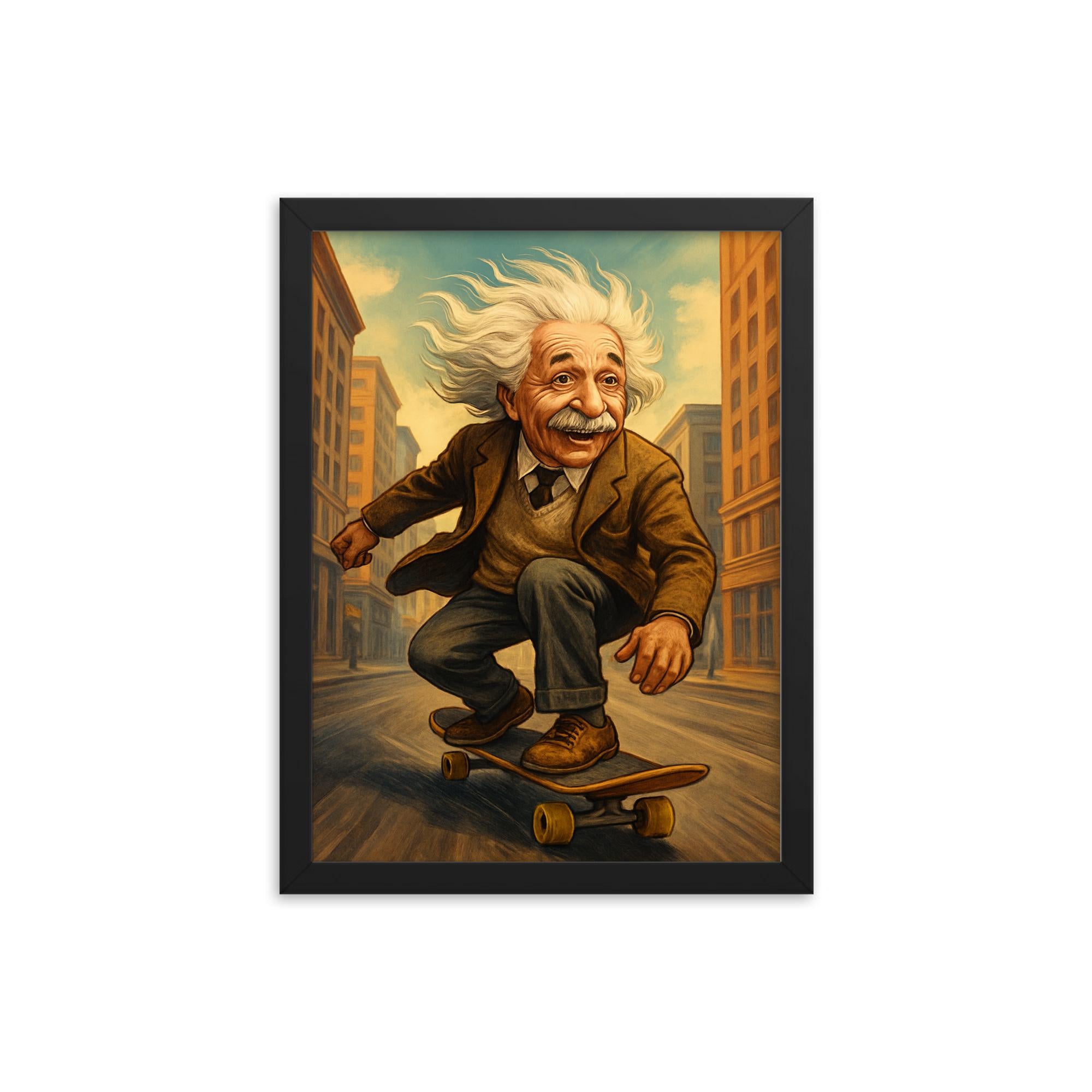 Discover the perfect fusion of brilliance and boldness with this captivating framed print featuring Albert Einstein riding a skateboard down a city street, his hair flying wildly in motion. This striking piece of wall art brings a playful yet inspiring energy to any space — ideal for those who appreciate genius with a twist of adventure.
