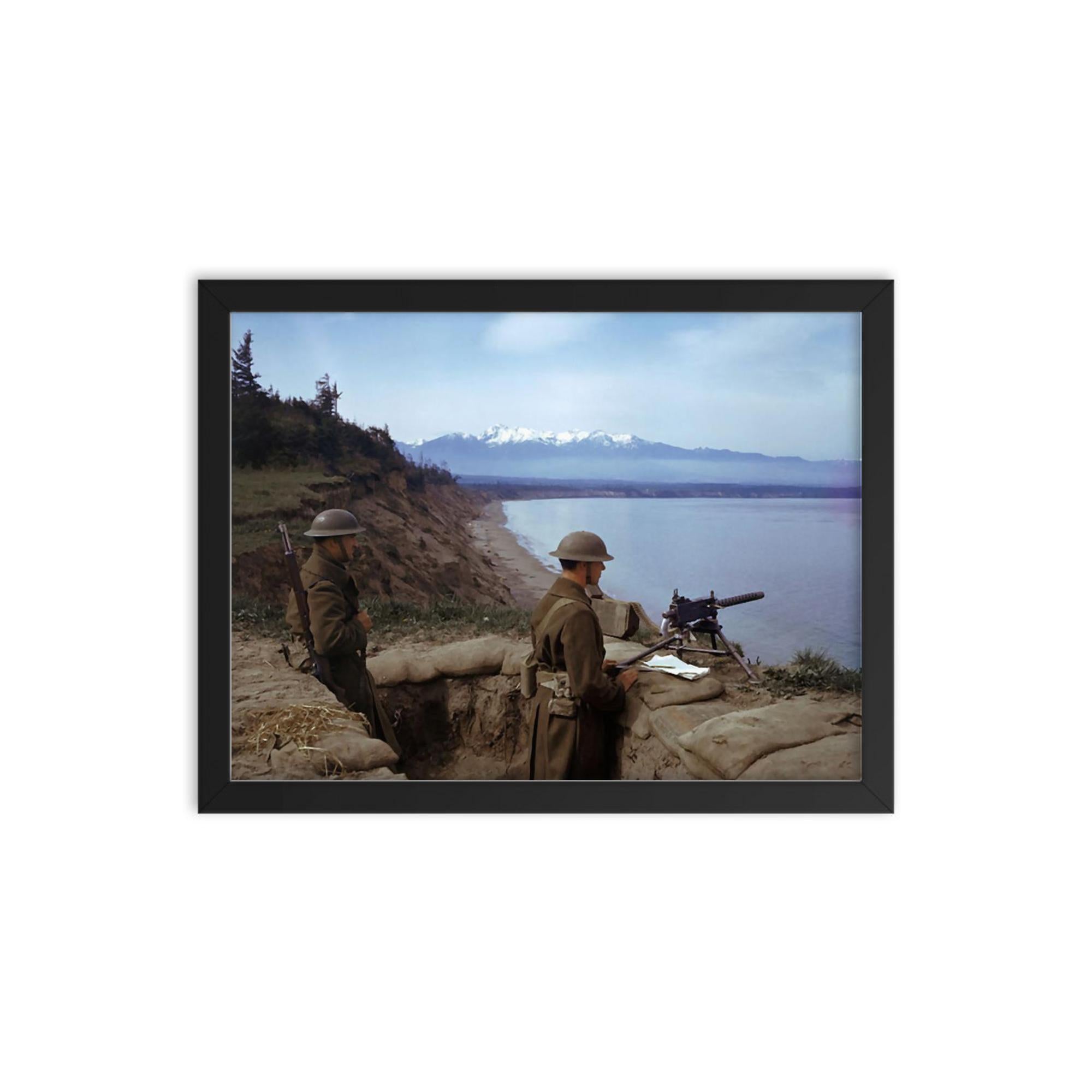 Step into a pivotal moment in American history with this exclusive framed print: American Soldiers Guarding the Coast with an M1919 Machine Gun from a Trench in Astoria, Oregon, 1942.