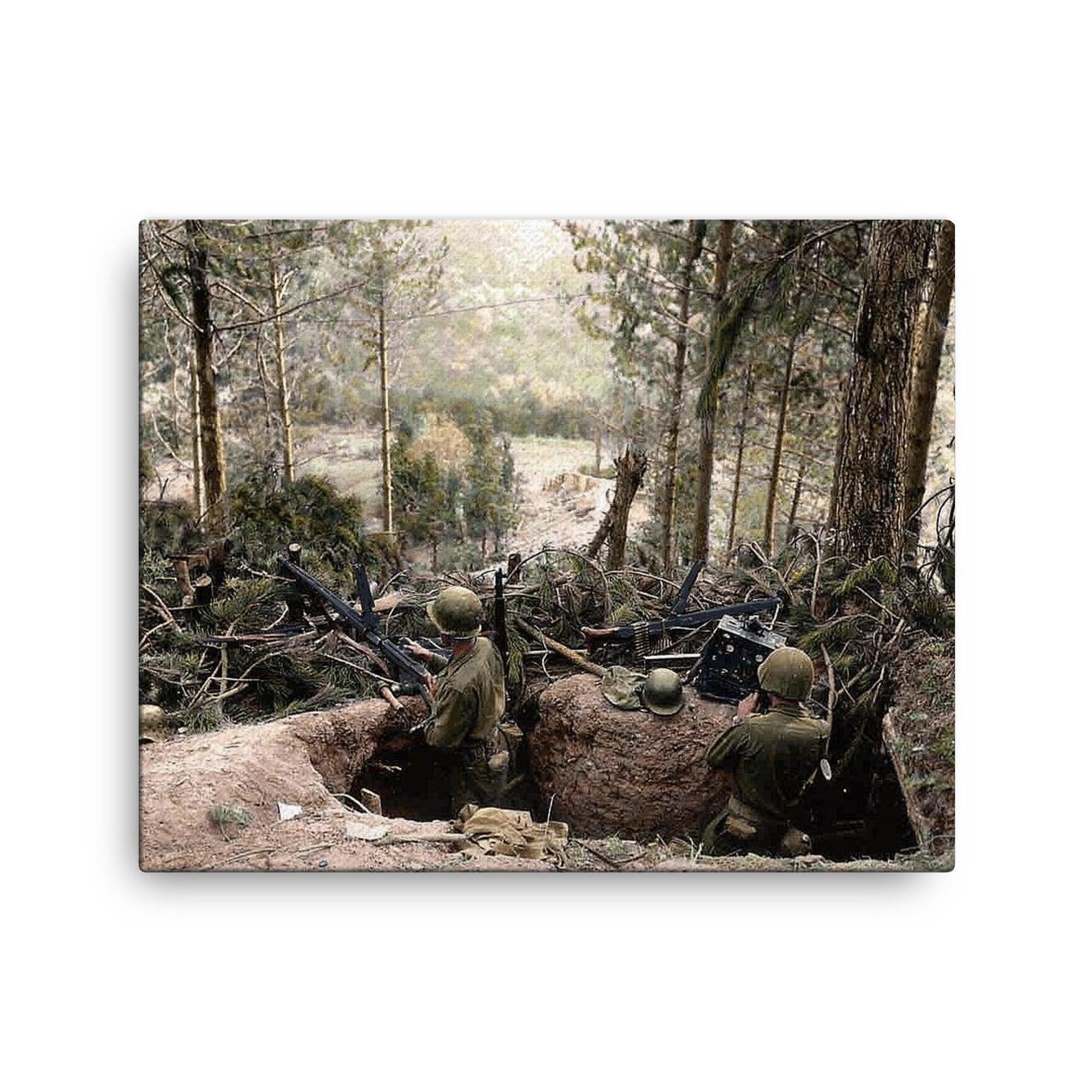 Bring a powerful moment of World War II history to your space with our beautifully crafted canvas print: American Troops Man a Machine Gun in a Captured German Position, Battle of Hurtgen Forest 1944.