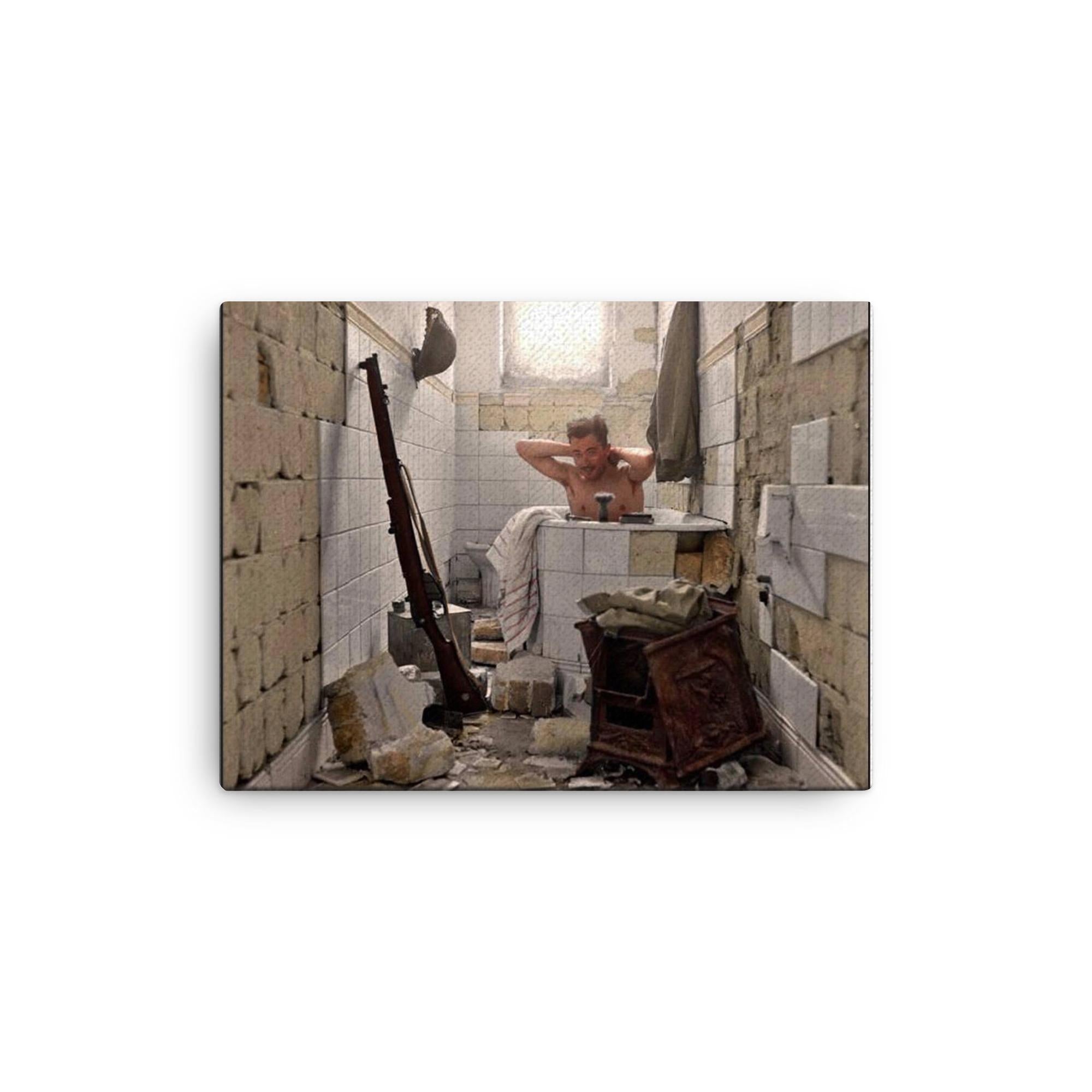 Bring a powerful moment of history into your space with our premium canvas print: Allied Soldier Bathing in Tobruk, Libya, 17 February 1942.