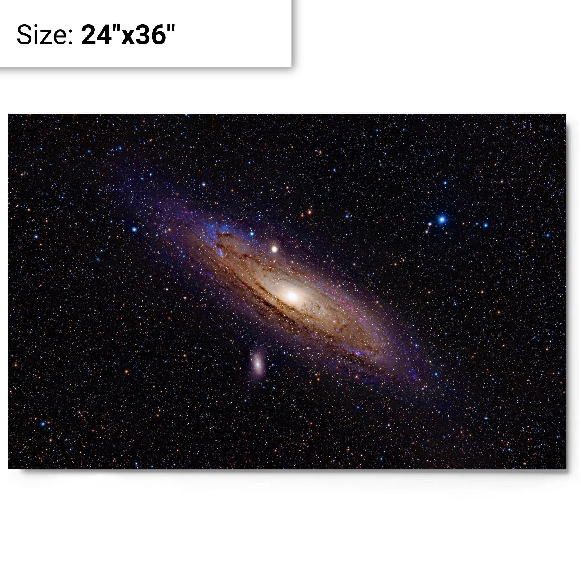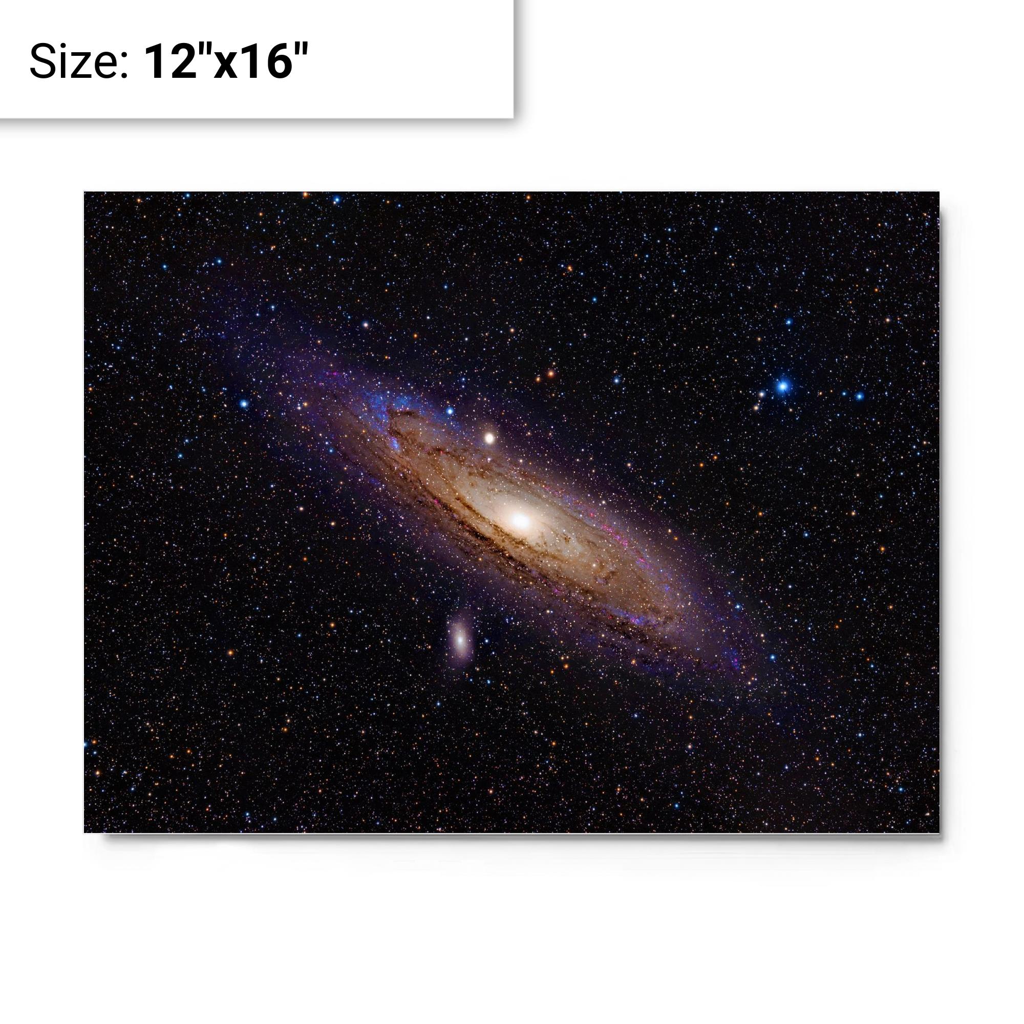 Andromeda's spiral spills across the metal like a distant ocean of light, the kind of image that makes the room fall quiet and your thoughts go wide.