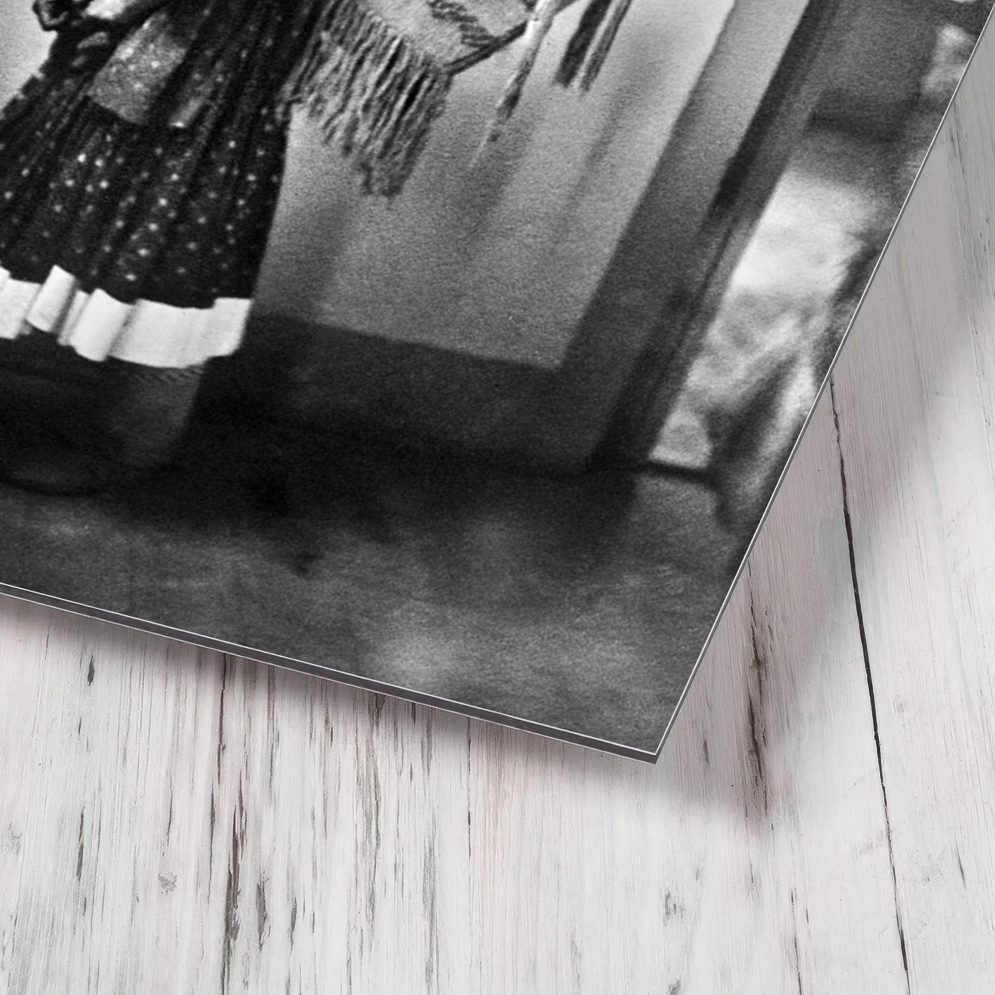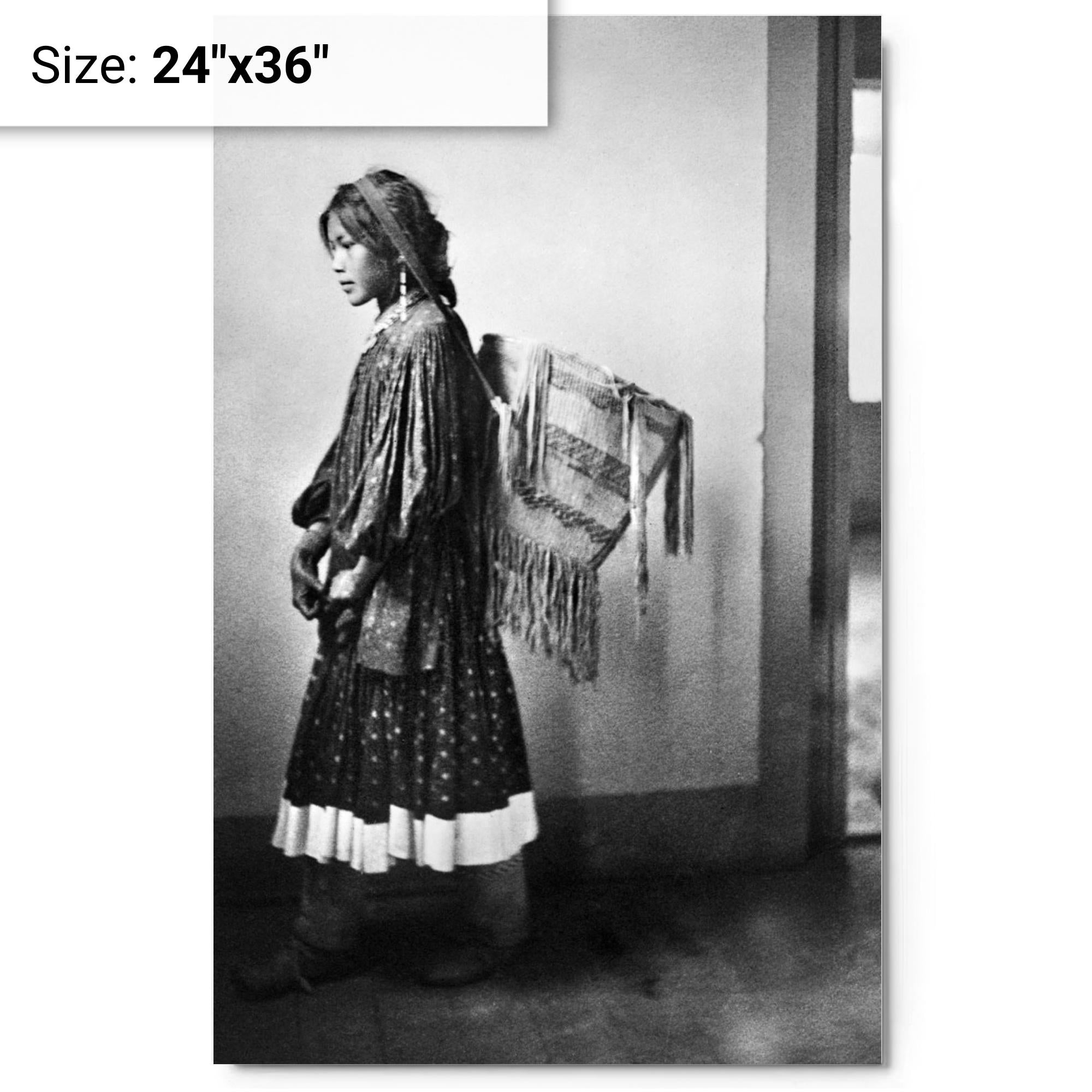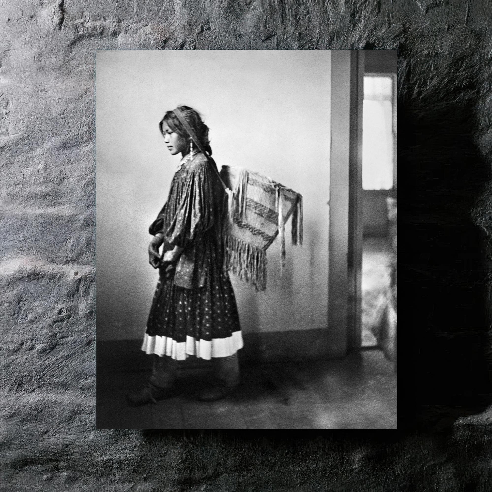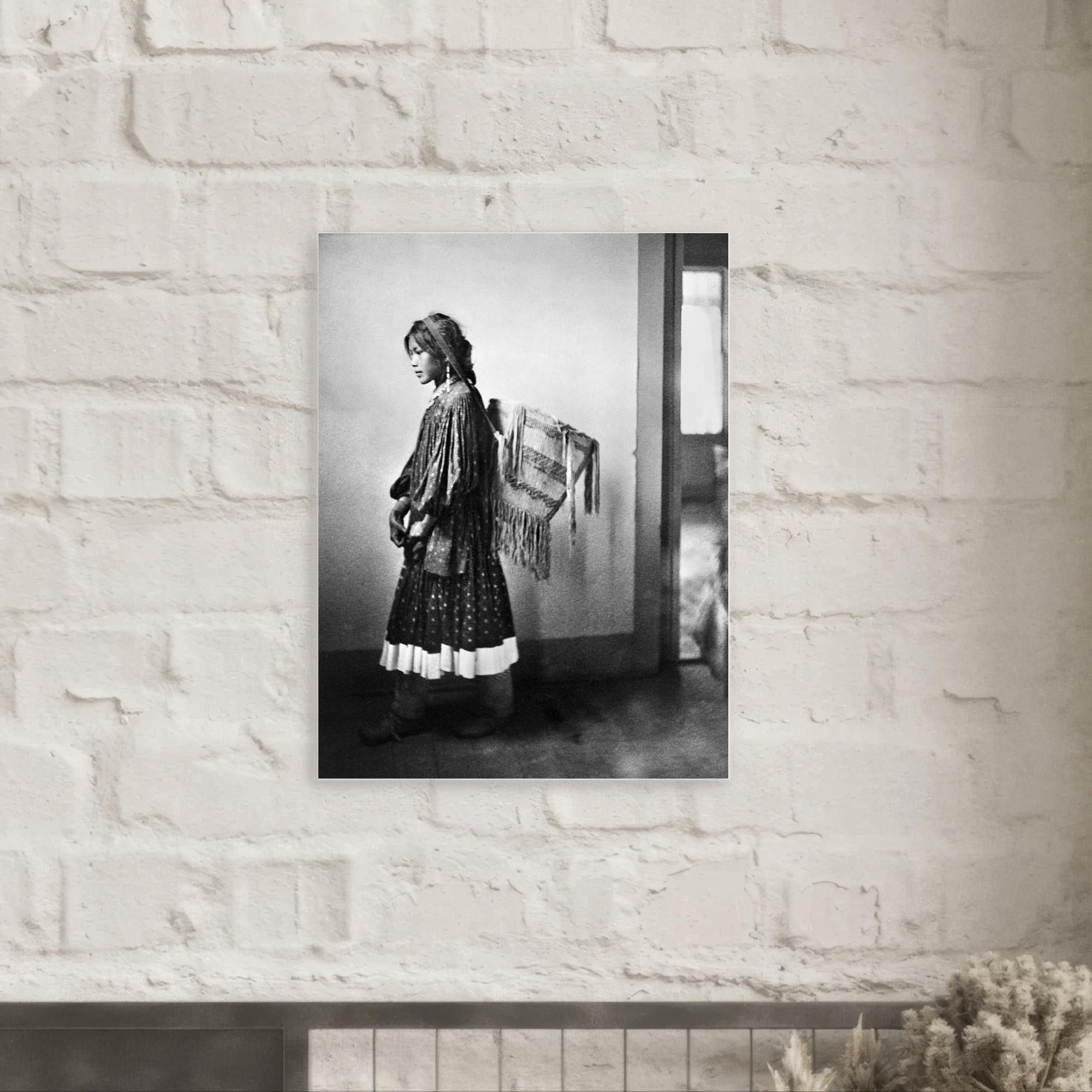 This metal print presents an Apache girl with a basket—a quiet, dignified moment that carries a sense of history and everyday resilience.