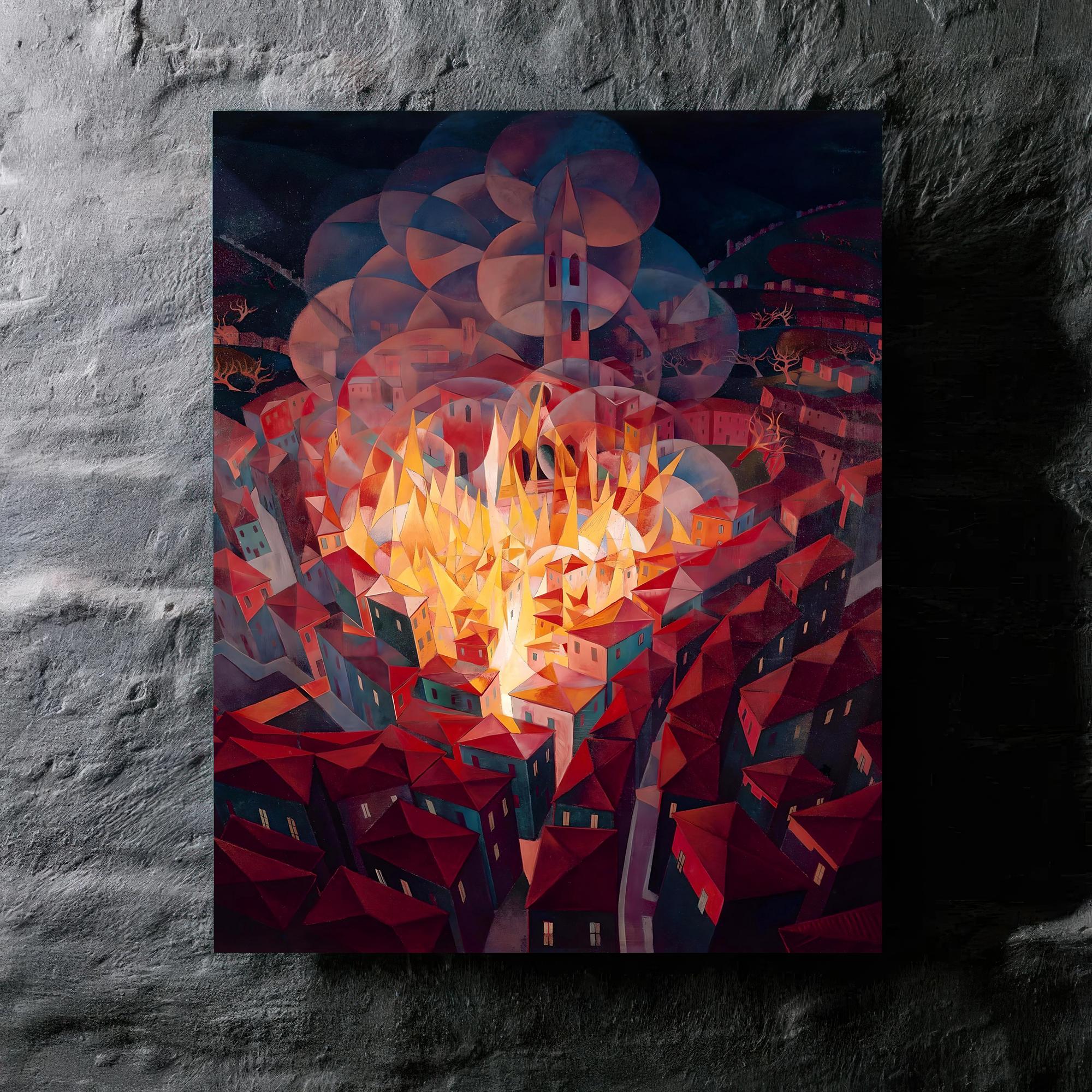 Gerardo Dottori’s "Arson in the City" transforms upheaval into a fierce, unforgettable vision — a futurist pulse captured in a single, wrenching moment.
