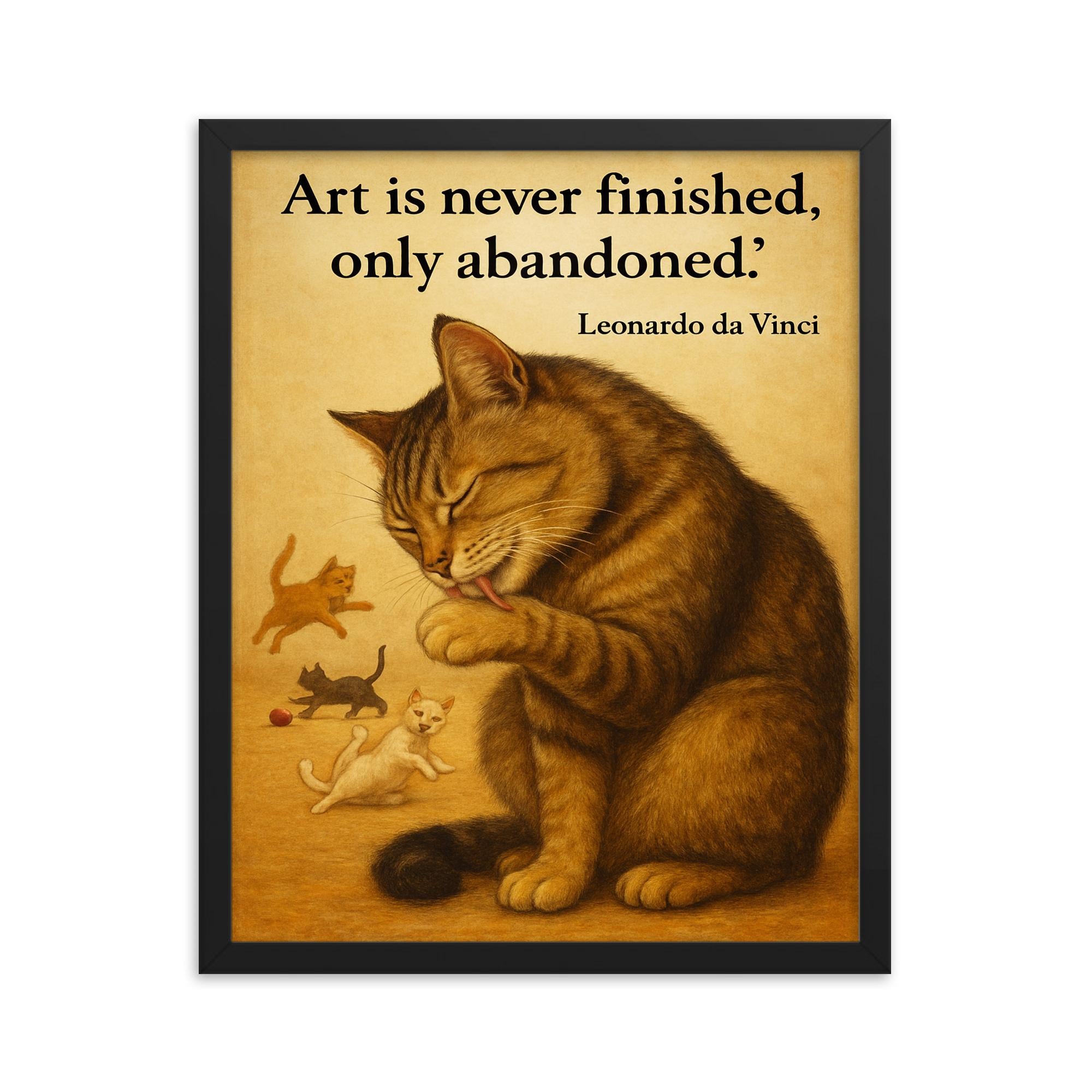 Unlock your daily dose of inspiration with this exclusive framed print: “Art Is Never Finished – Leonardo da Vinci Perfectionist Cat Grooming While Others Play Inspiring Post.”