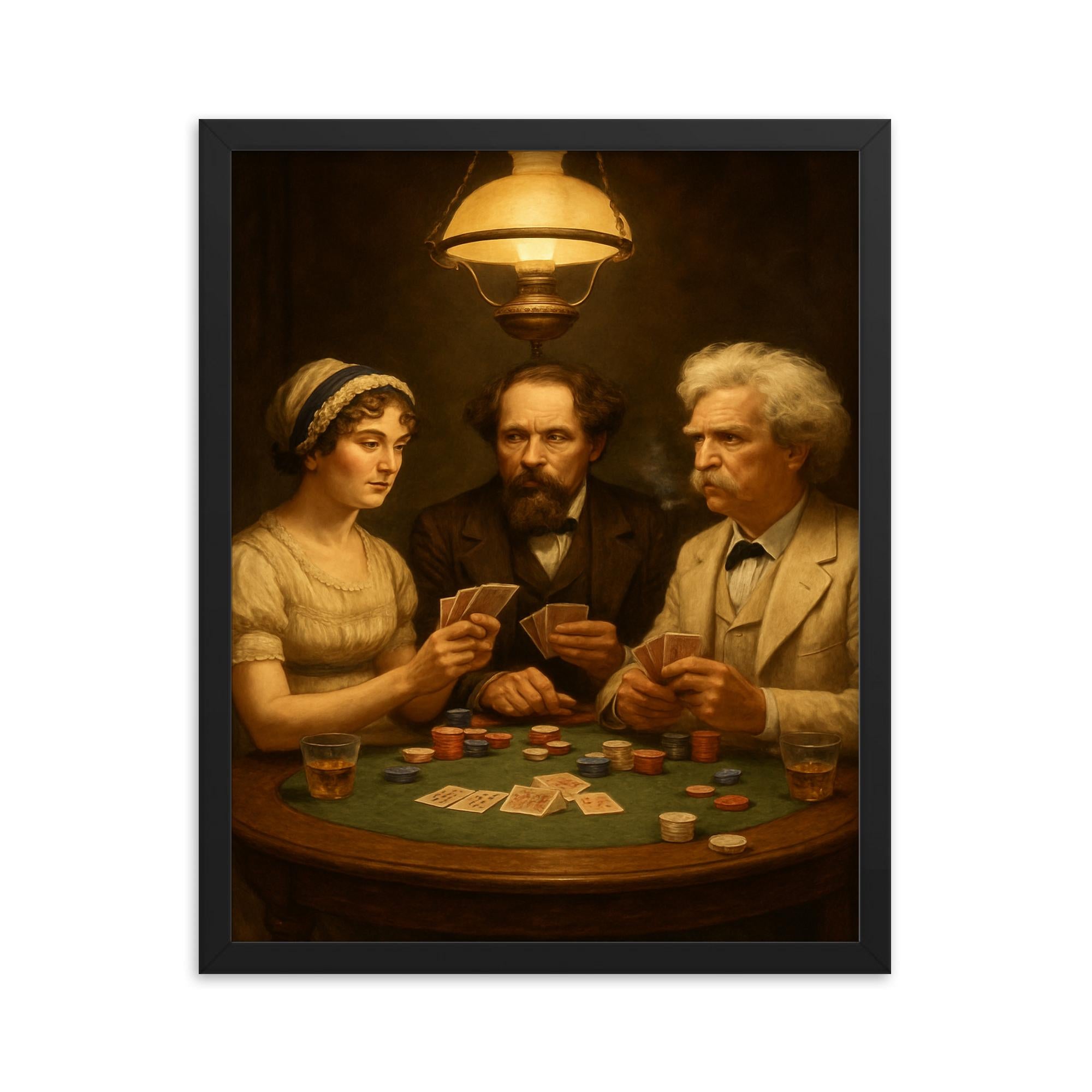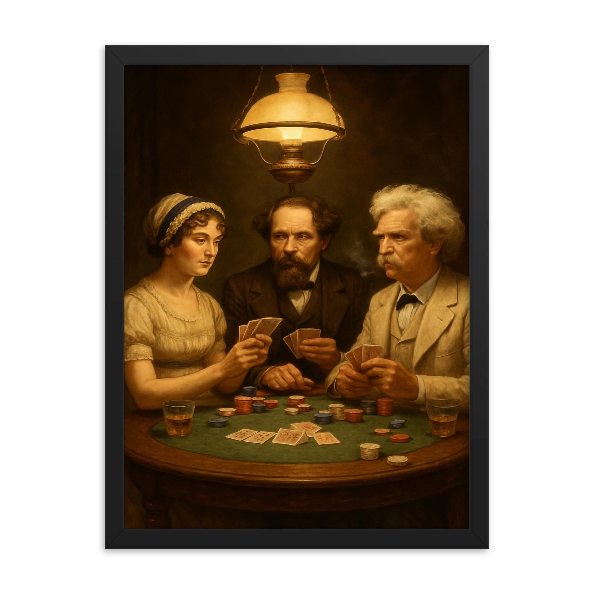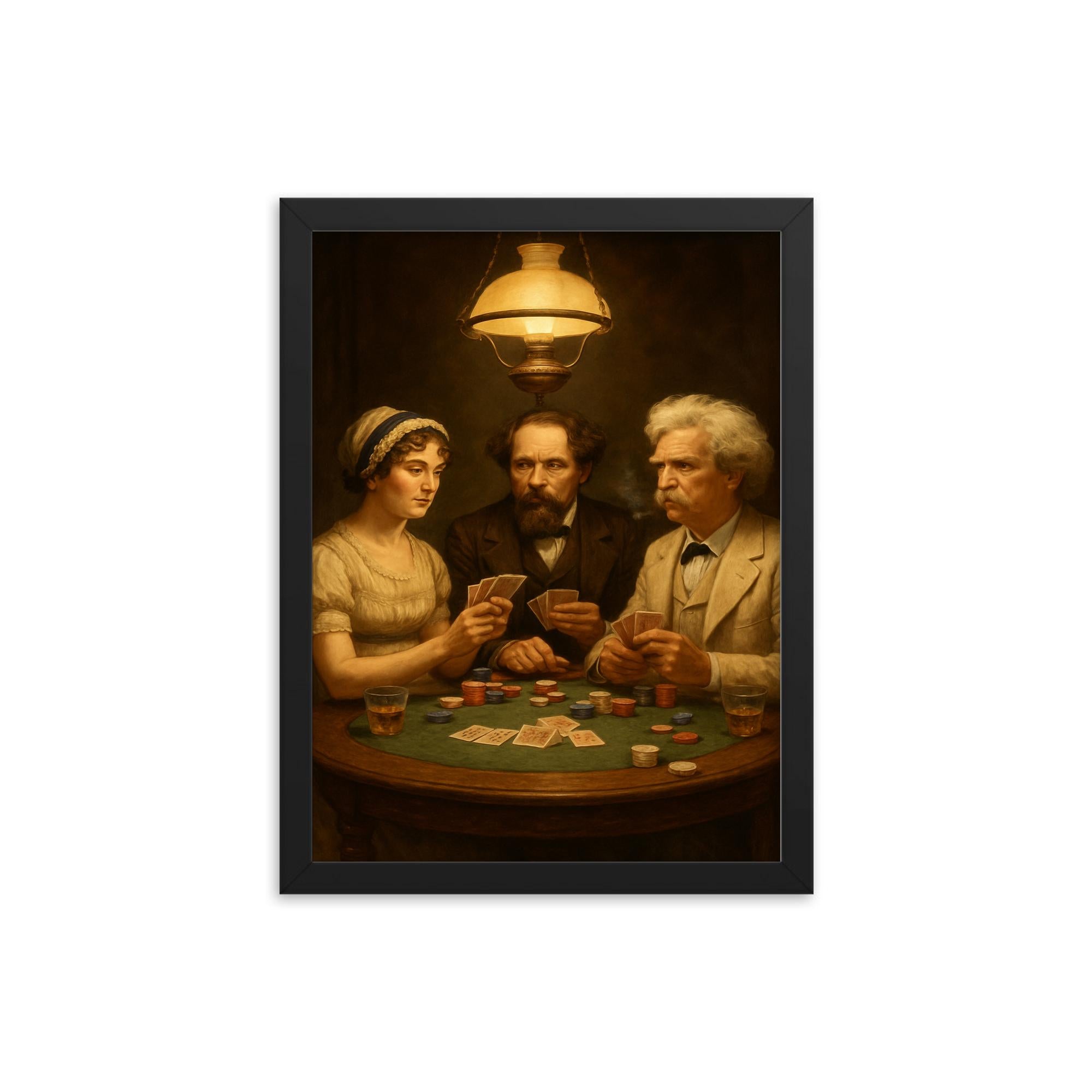 Step into a world where literary legends gather around the table with this striking framed print of Austen, Dickens, and Twain playing poker.