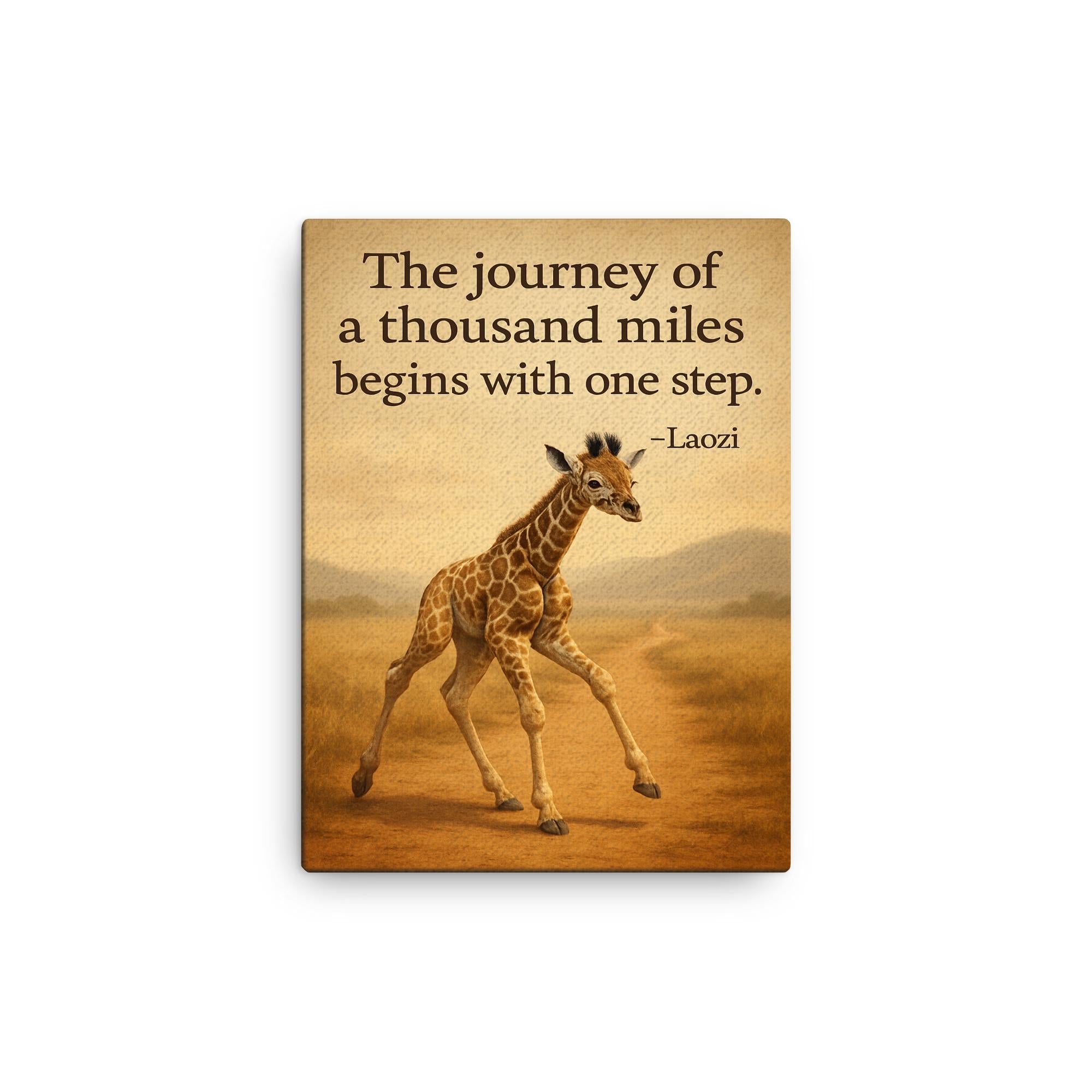 Introducing the Baby Giraffe First Step Journey Canvas Print, a heartwarming piece of wall art capturing the spirit of new beginnings and the courage to take that all-important first step. Featuring the timeless wisdom of Laozi—The journey of a thousand miles begins—this print is more than décor; it's a daily reminder to embrace every adventure.