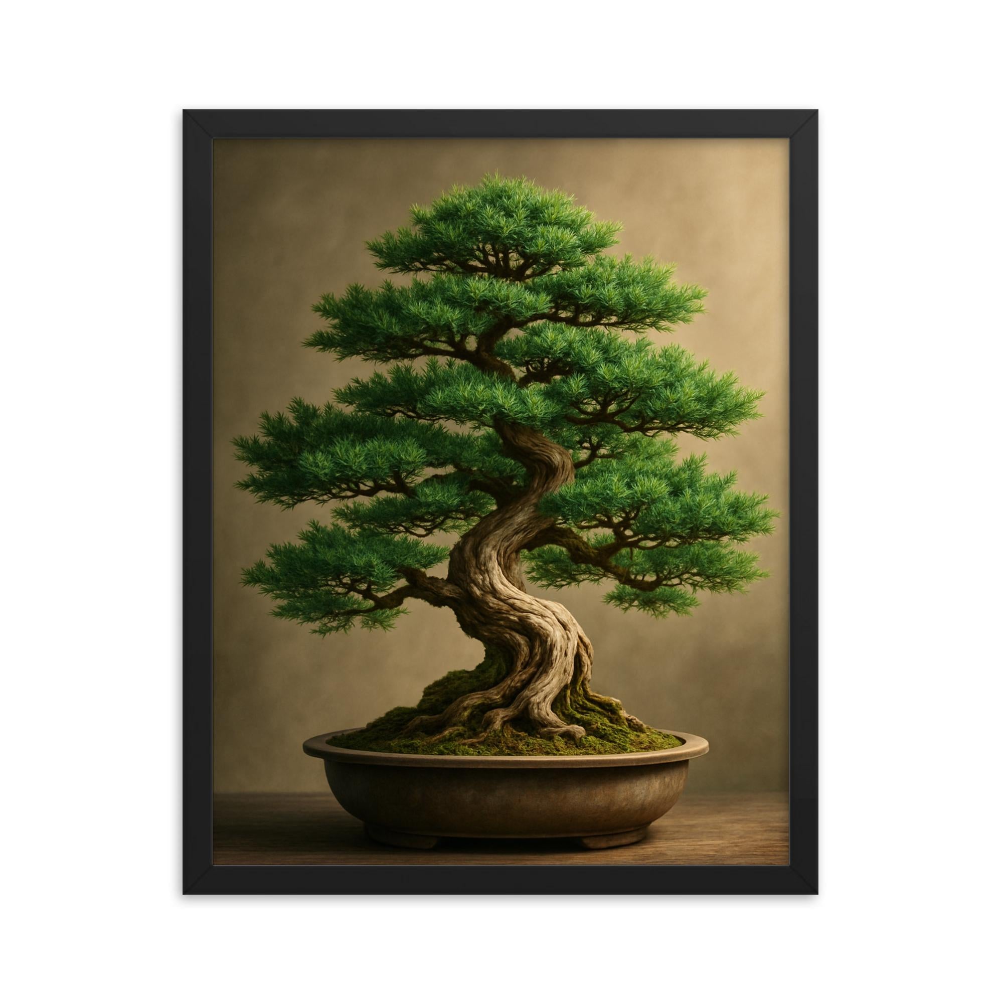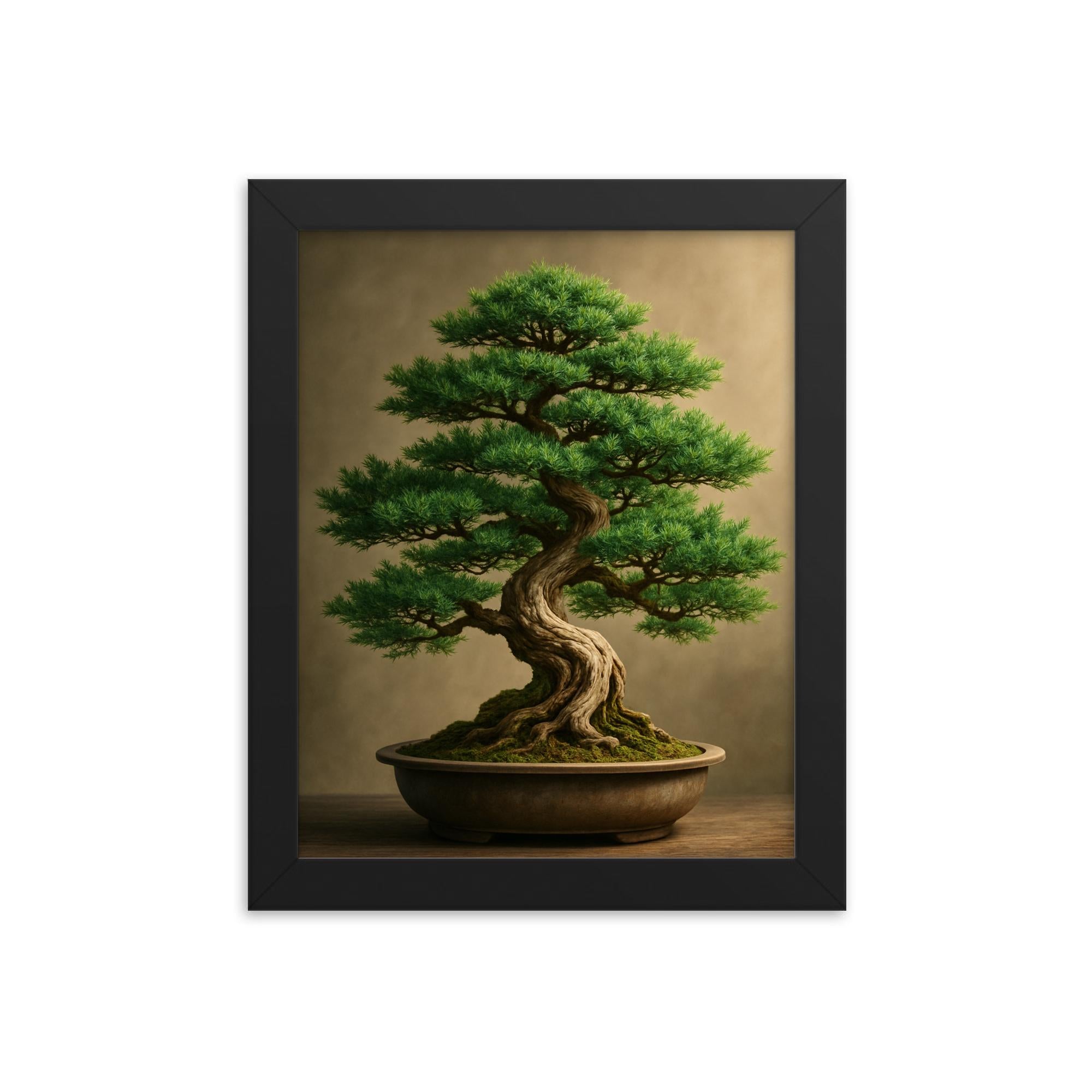 Transform your environment beautifully and effortlessly — welcome home the vibrant juniper bonsai framed print today.