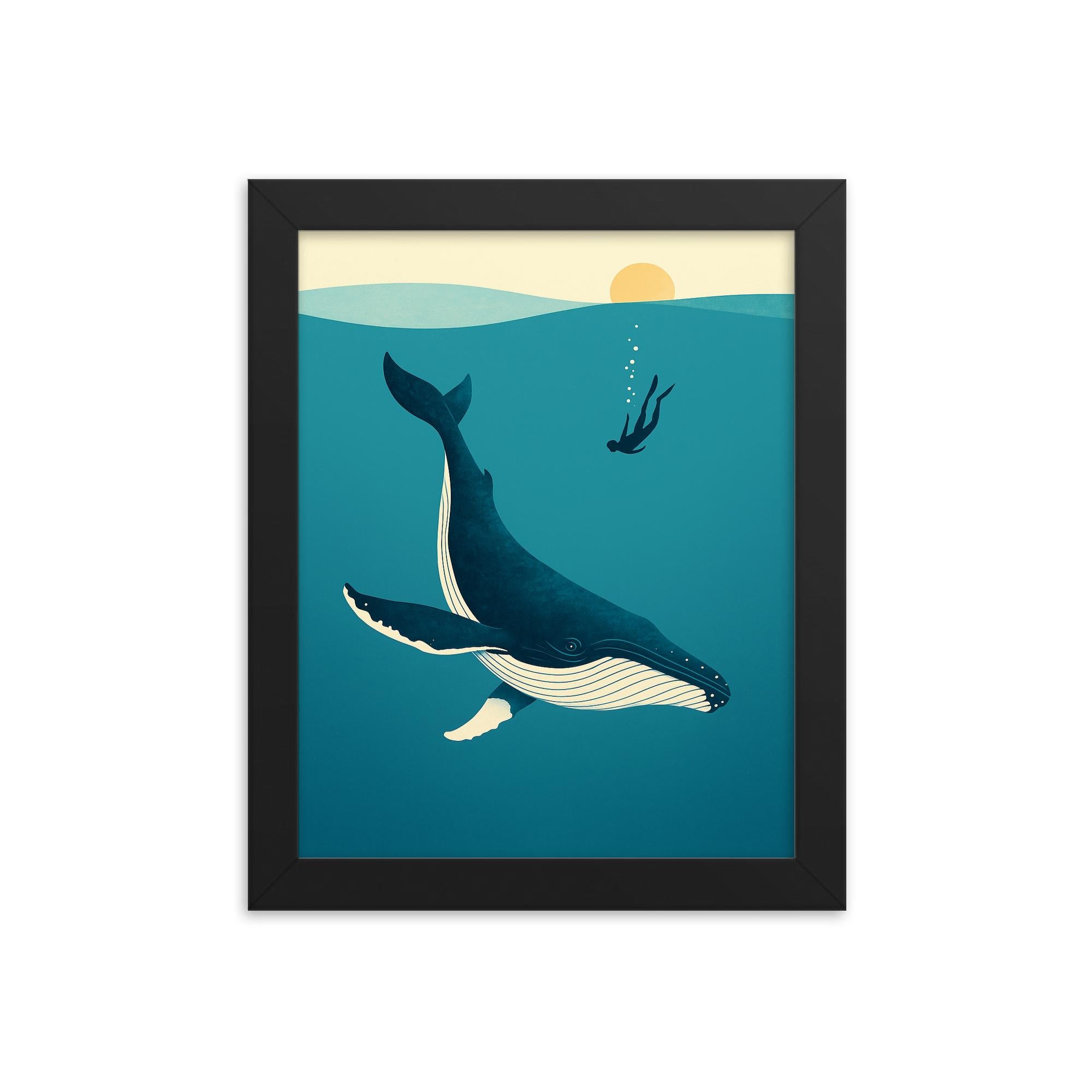 Blue Whale with Diver Framed Print – Minimalist Ocean Wall Art, Modern Marine Decor for Home & Office