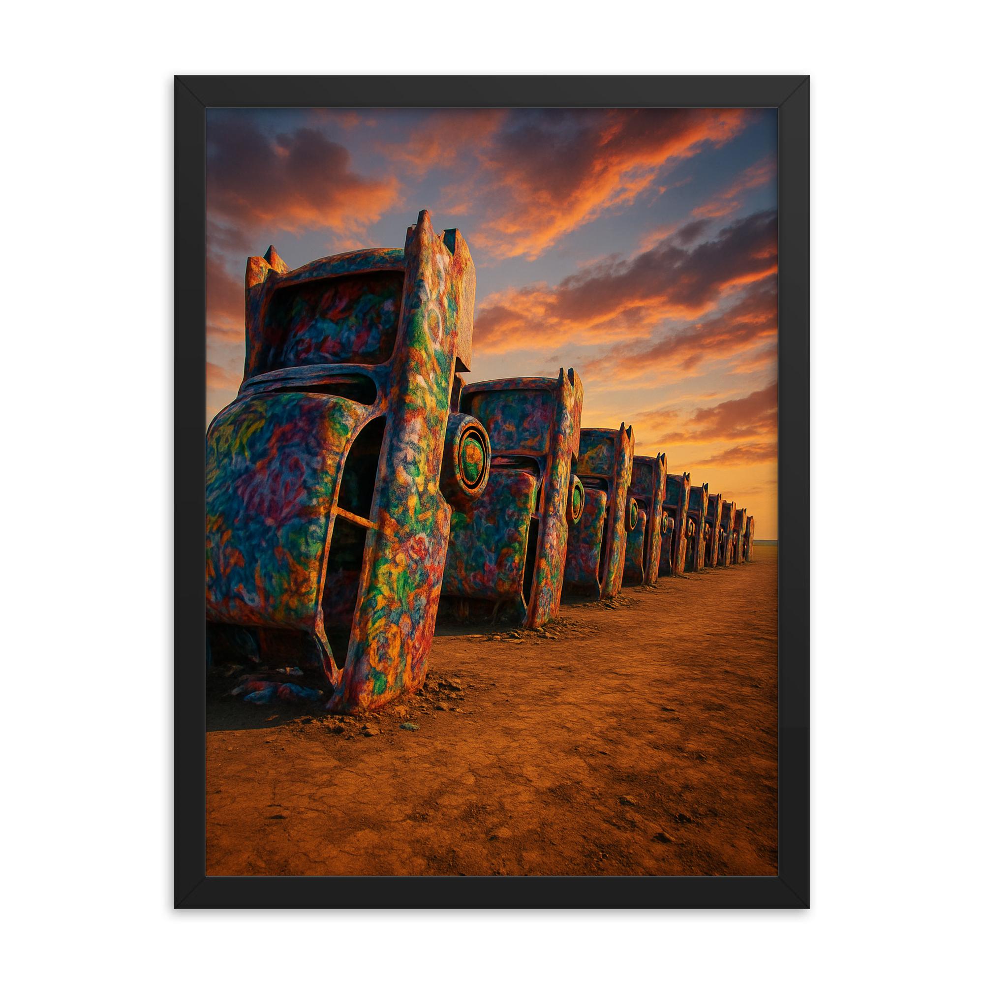 Transform your space with a one-of-a-kind piece of Americana—this exquisite framed print of Cadillac Ranch, Amarillo, USA. Instantly recognizable and endlessly intriguing, Cadillac Ranch captures the spirit of adventure, creativity, and freedom on the open road.