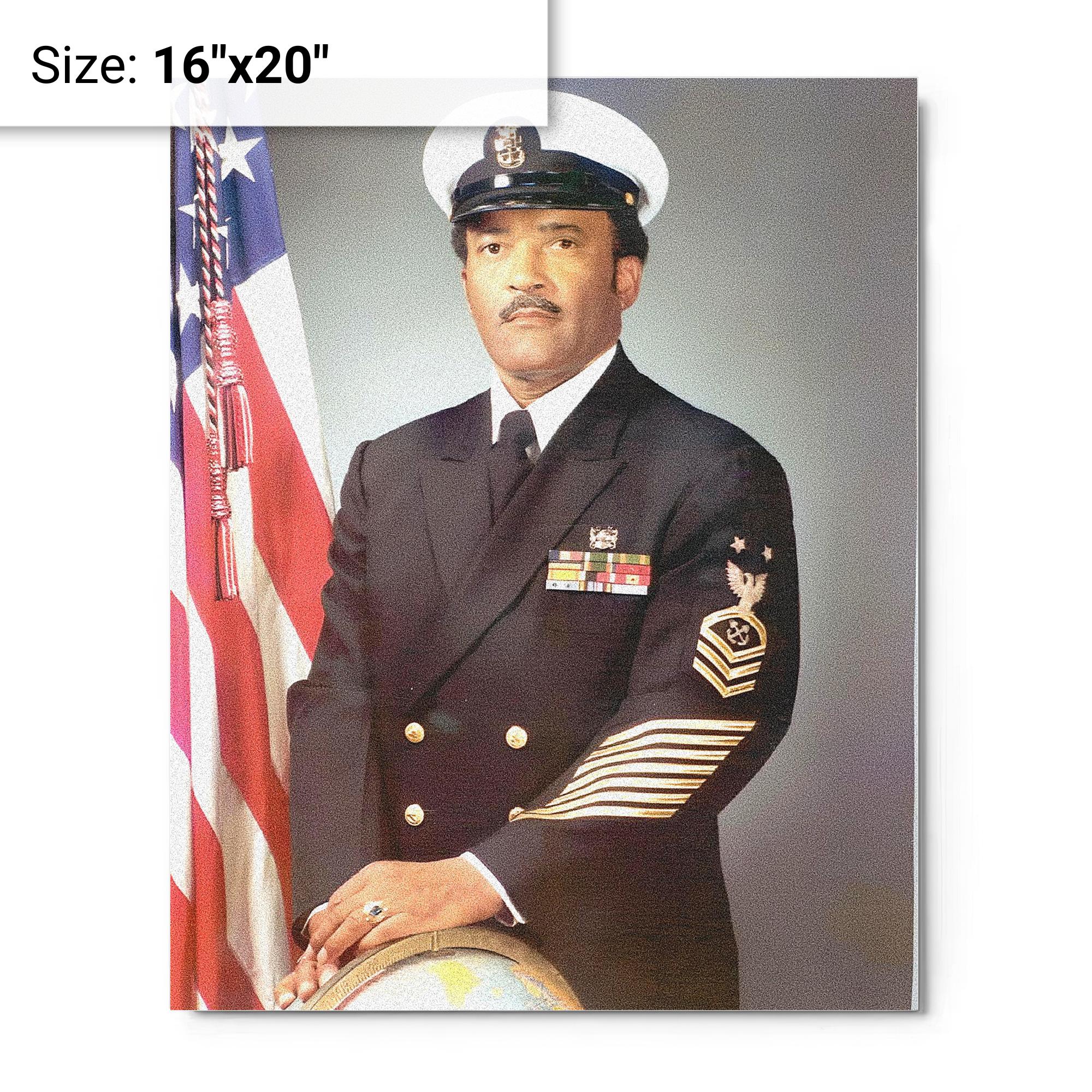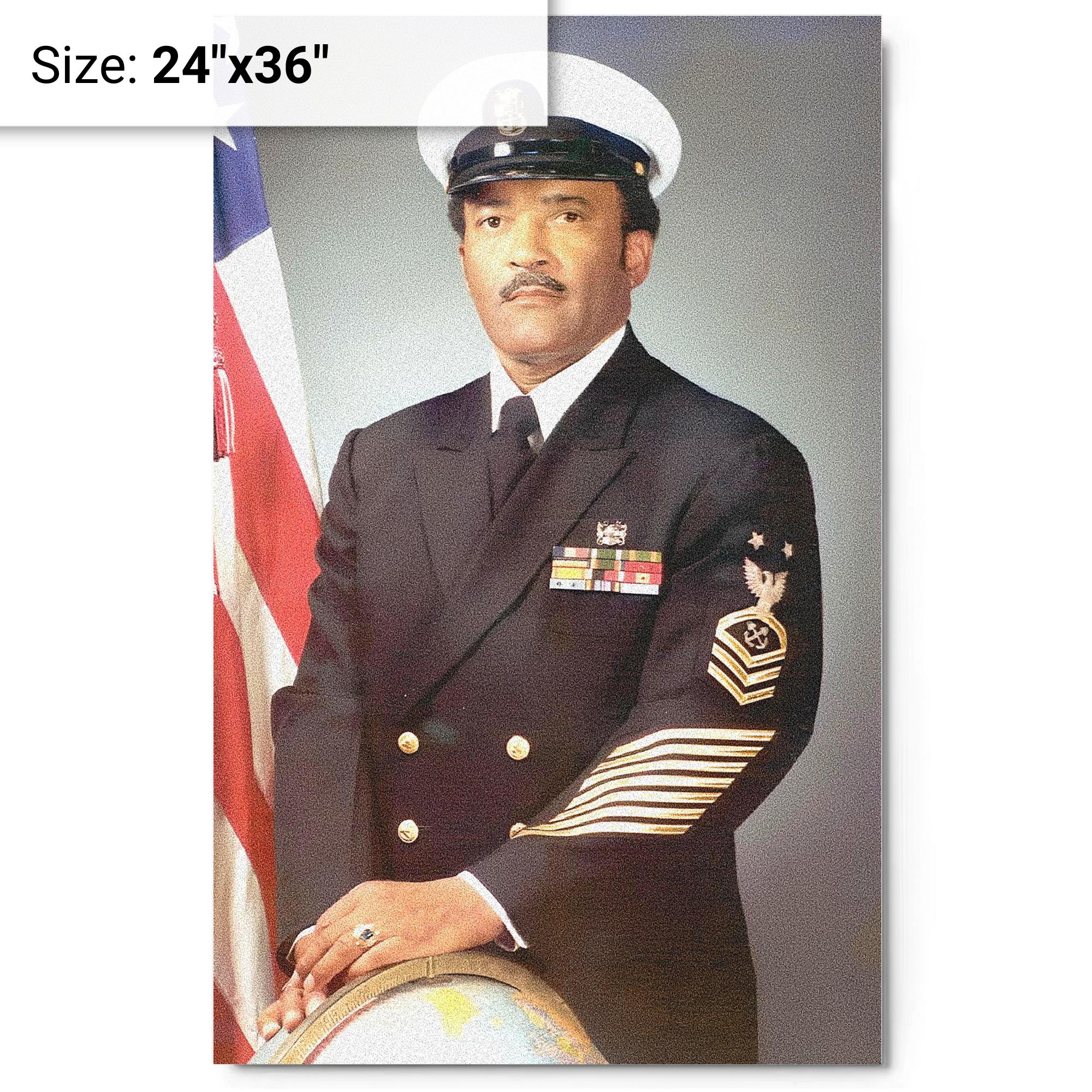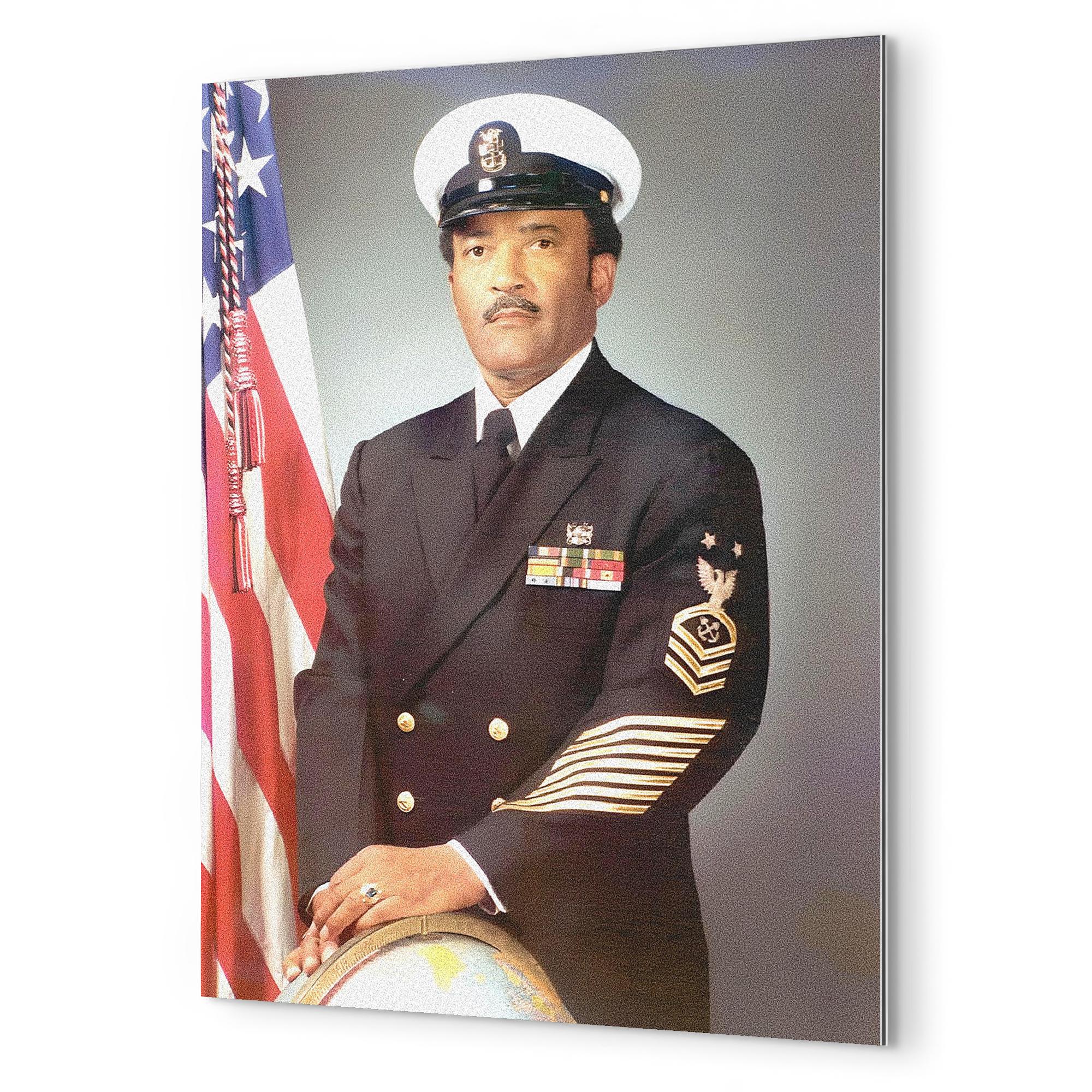 This metal print of Carl Brashear honors the Navy's first African American master diver — a man who lost a leg and fought his way back to service, turning grit into legacy.