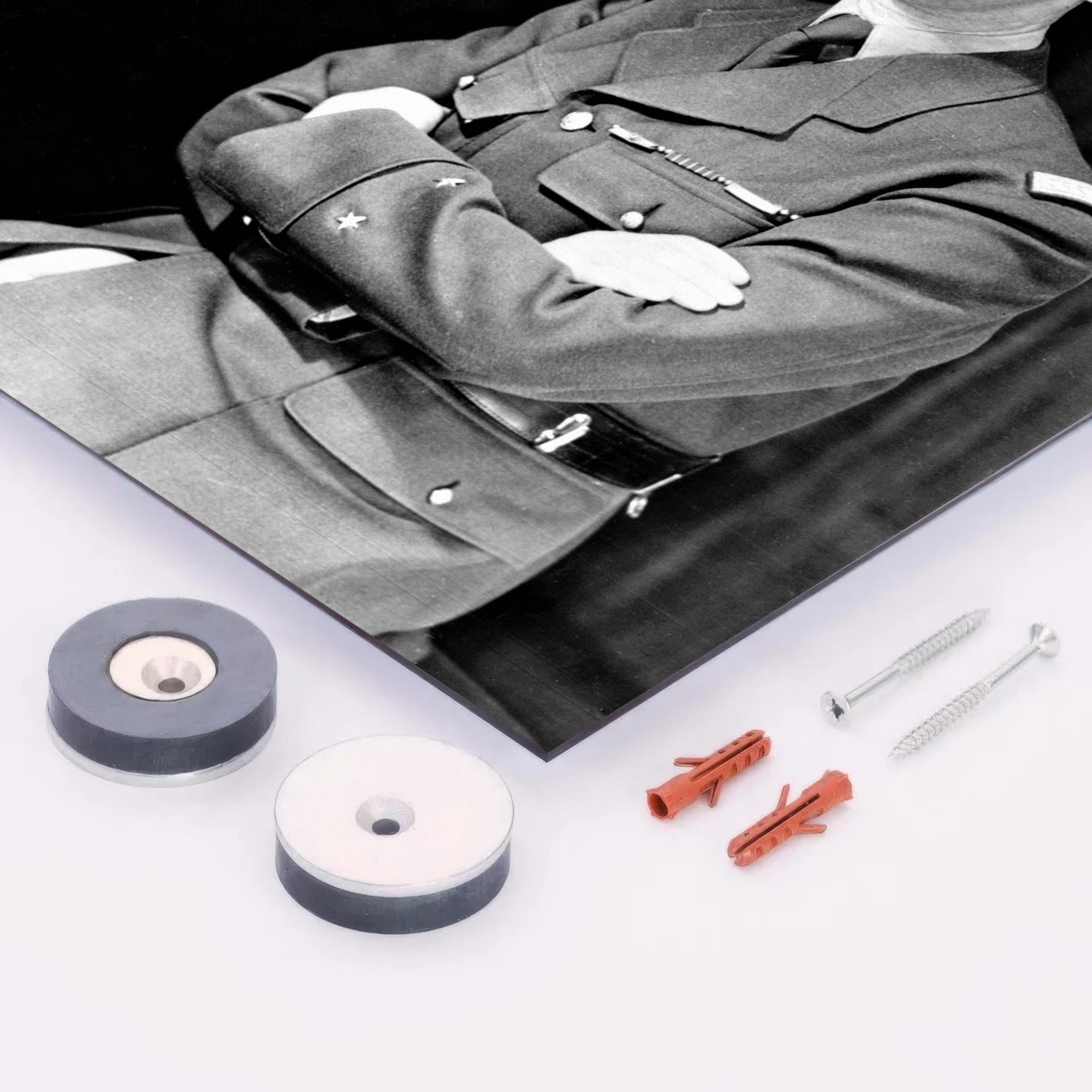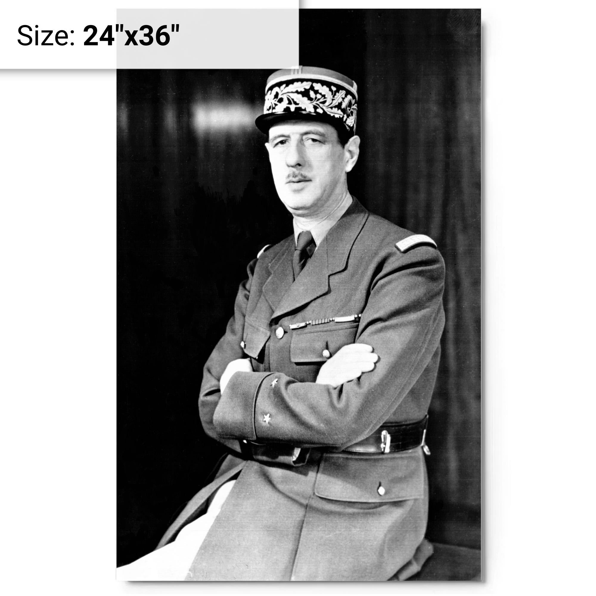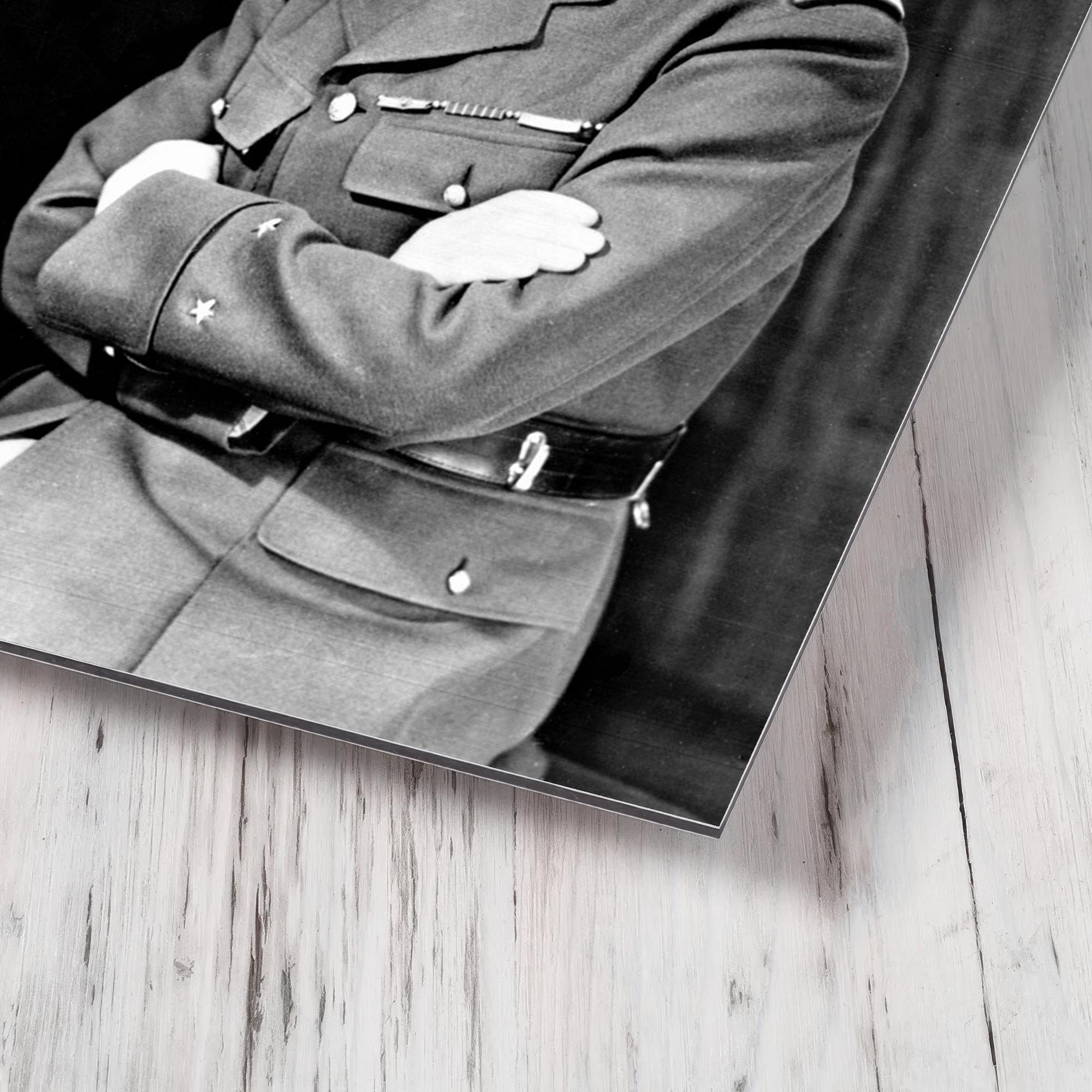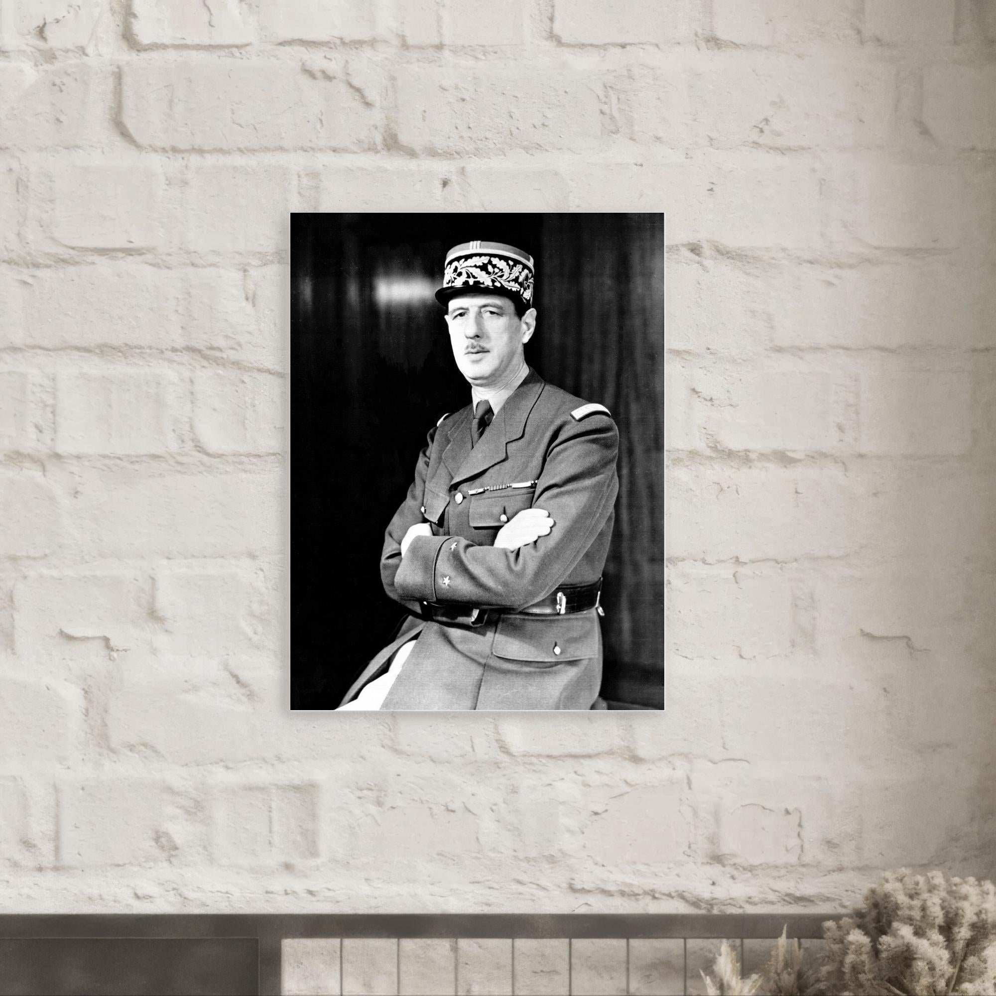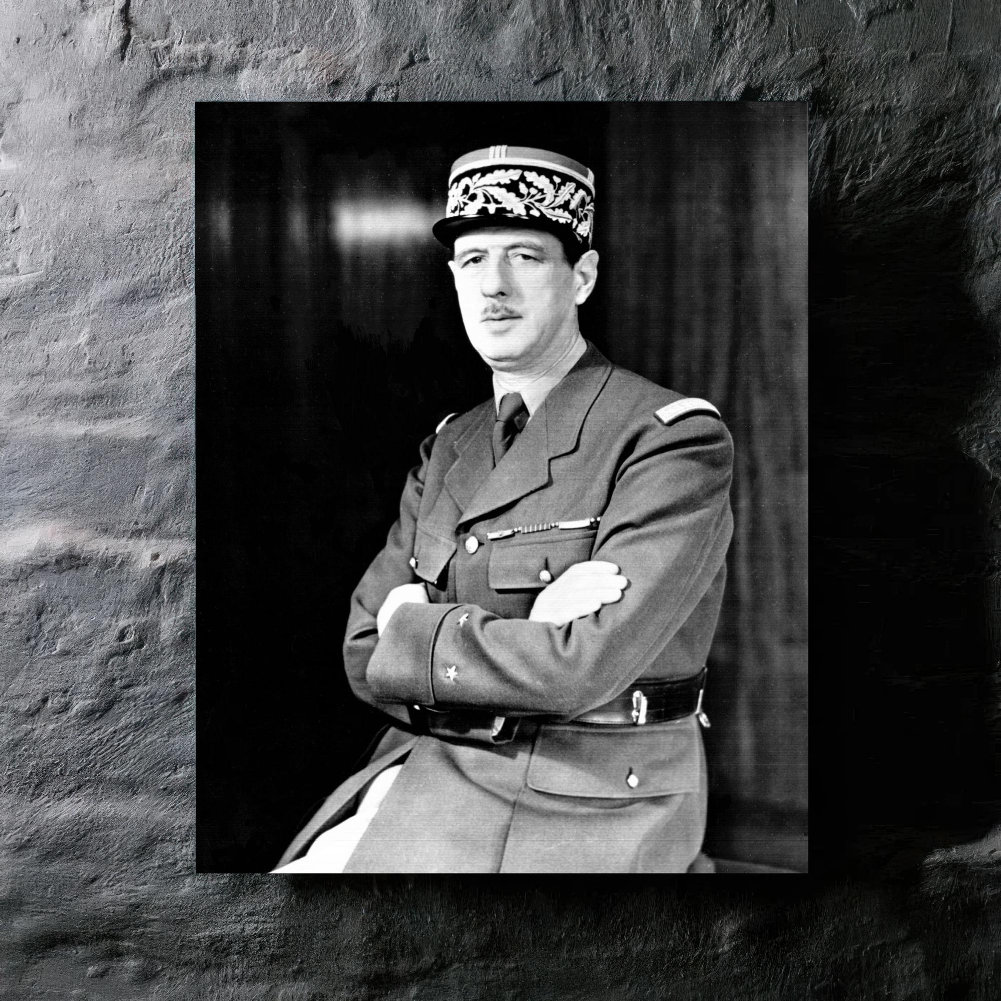 This metal print of Charles de Gaulle carries the quiet authority of a man who helped shape modern France.