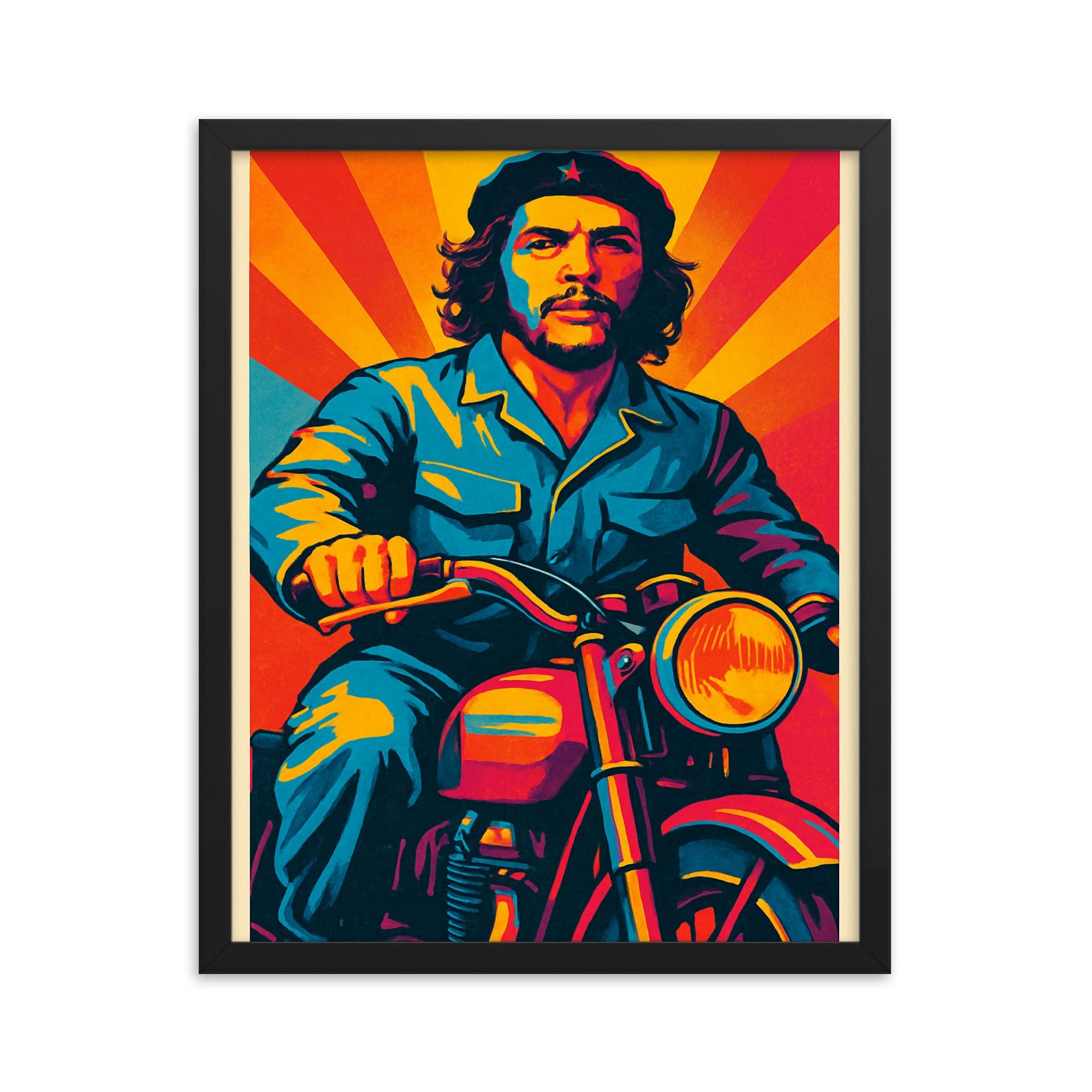 Elevate your space with an iconic statement piece that fuses revolutionary spirit and vibrant pop culture energy. This framed print captures the bold imagery of Che Guevara riding a classic motorcycle, rendered in eye-catching pop art colors that demand attention.