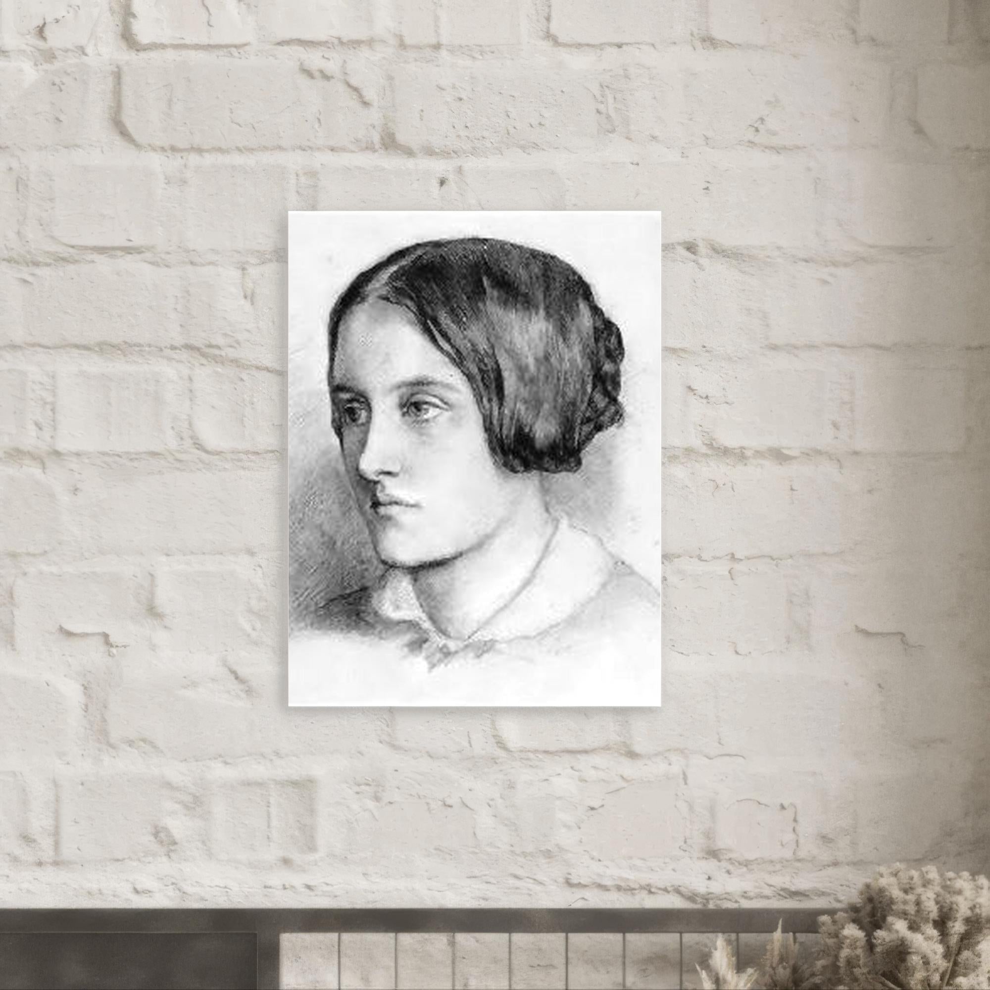 Christina Rossetti’s quiet intensity feels immediate in this metal print, a small, arresting presence that asks you to slow down and listen.