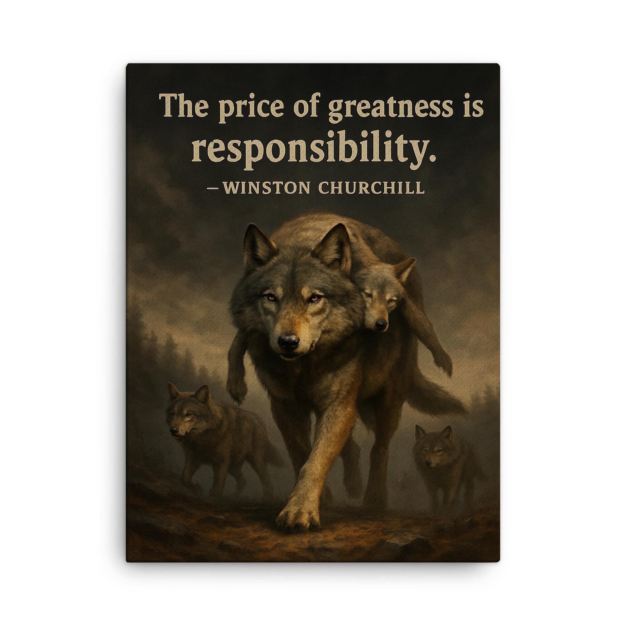 This premium canvas print features Churchill’s iconic declaration: The price of greatness is responsibility—brought to life alongside the awe-inspiring image of an alpha wolf boldly leading its pack to safety. Designed to inspire courage, accountability, and unwavering resolve, this wall art is perfect for visionaries, leaders, and those hungry for greatness.