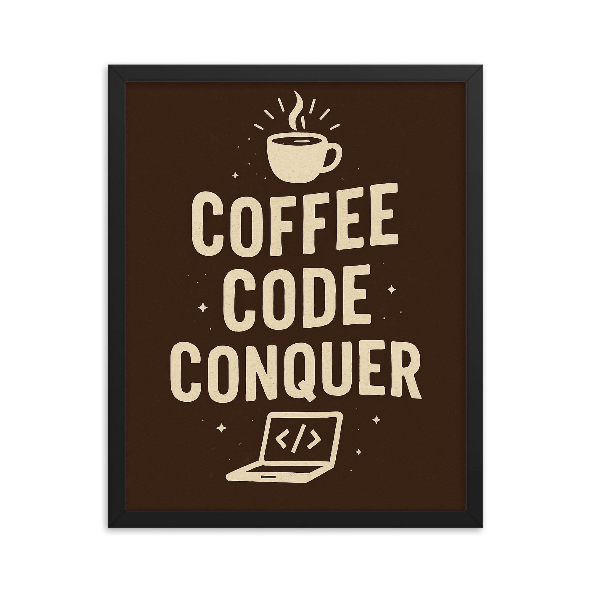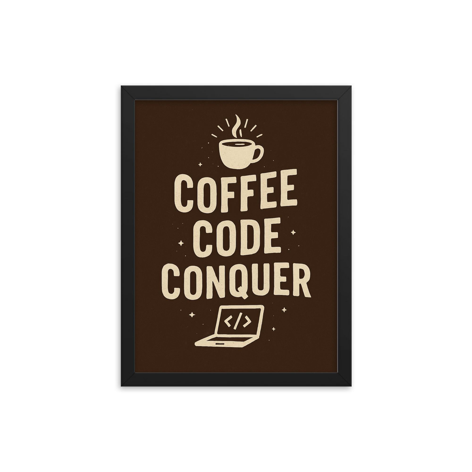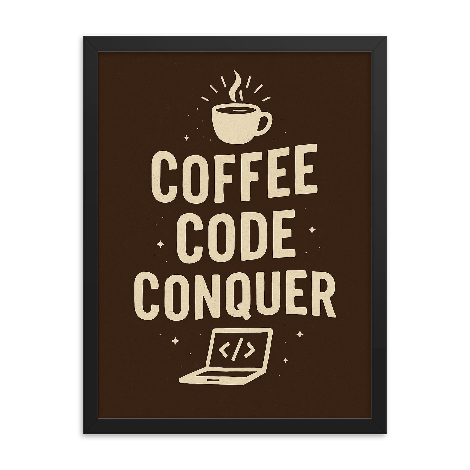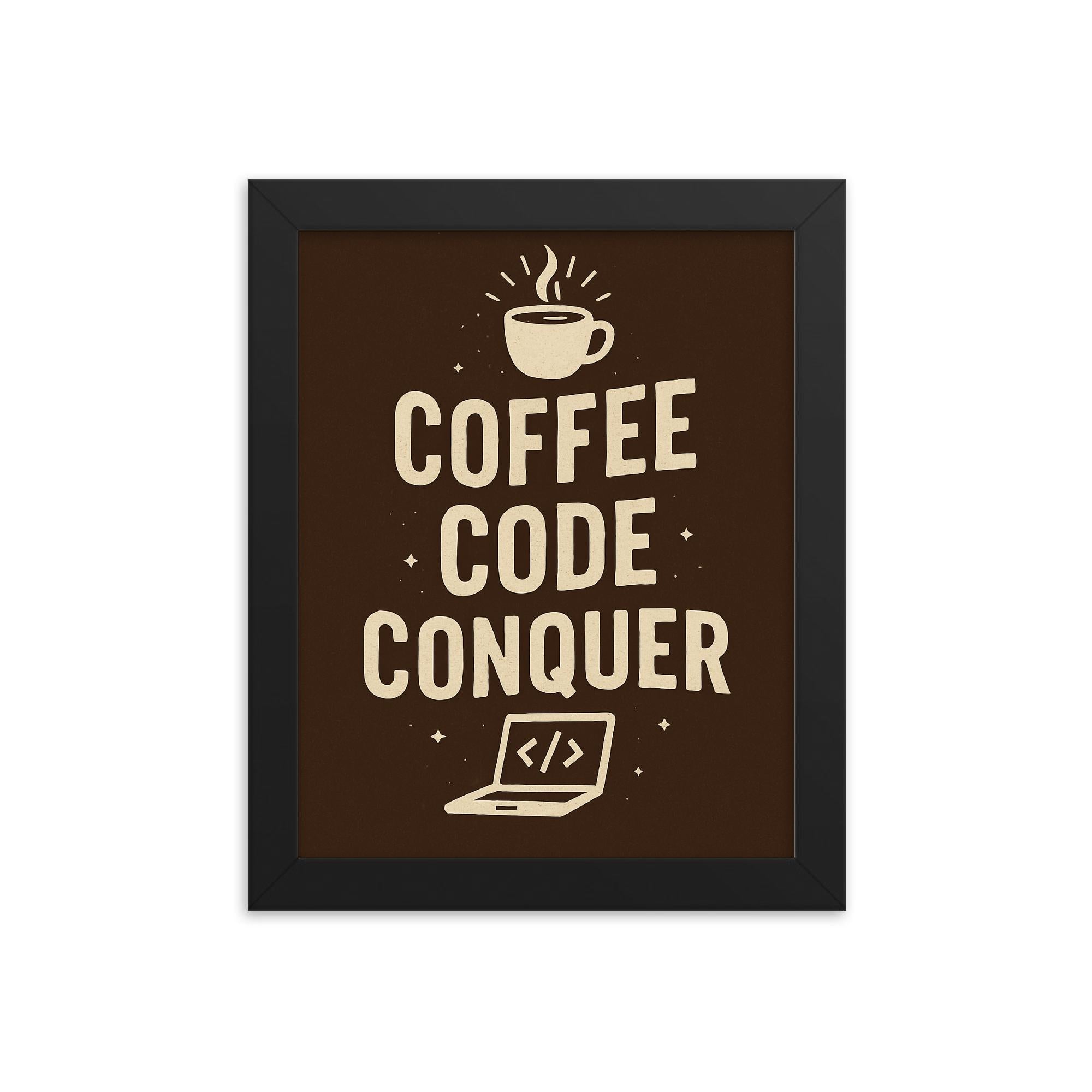 Introducing the “Coffee Code Conquer” Framed Print—a wall art statement for those who thrive on drive, energy, and the sweet fuel of progress.