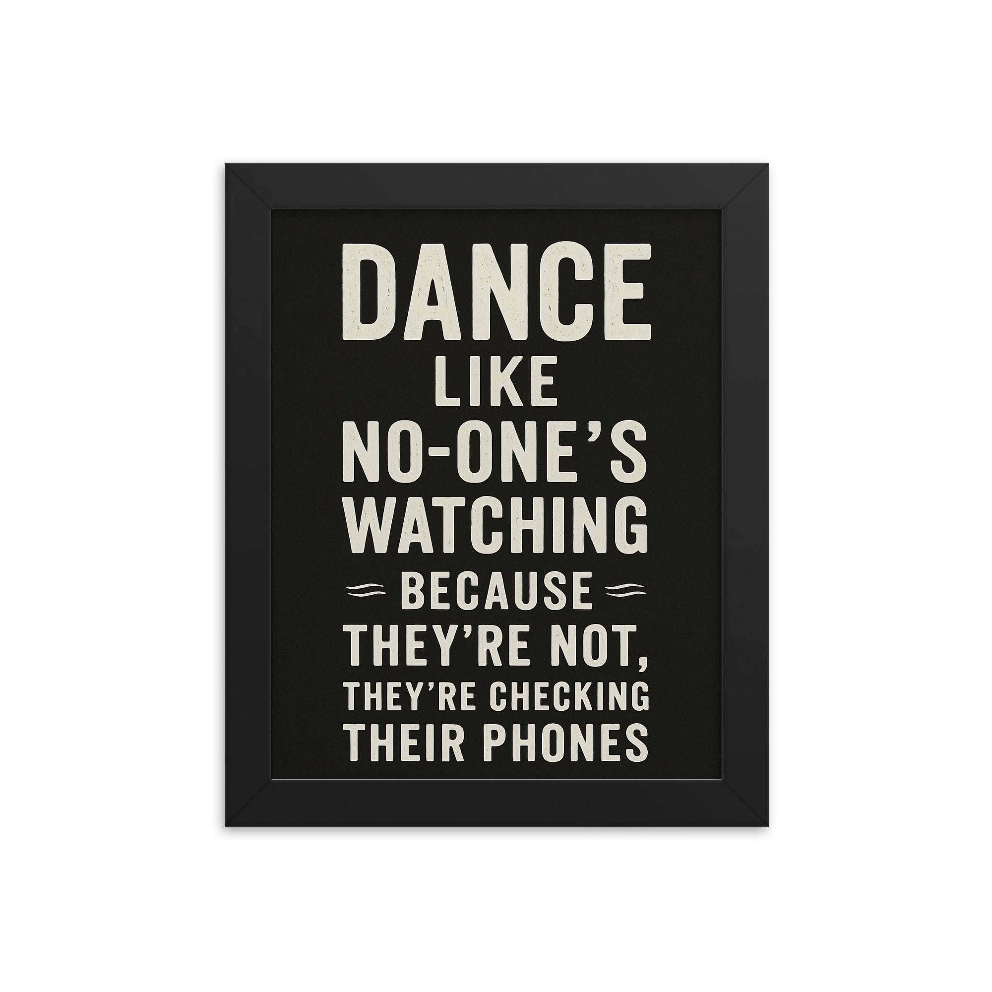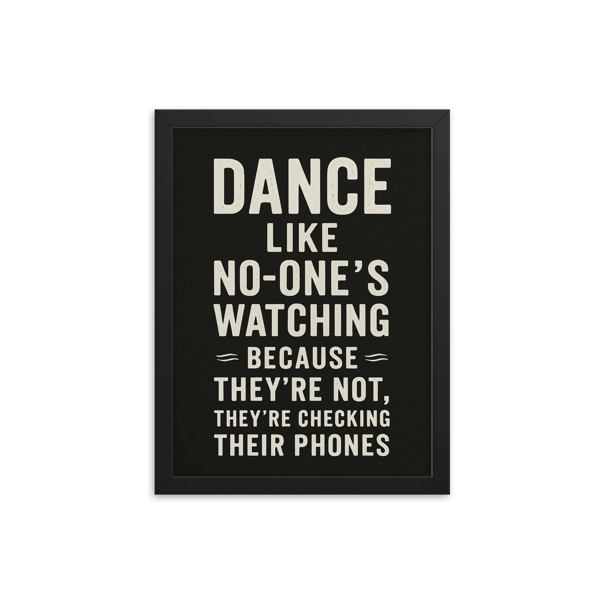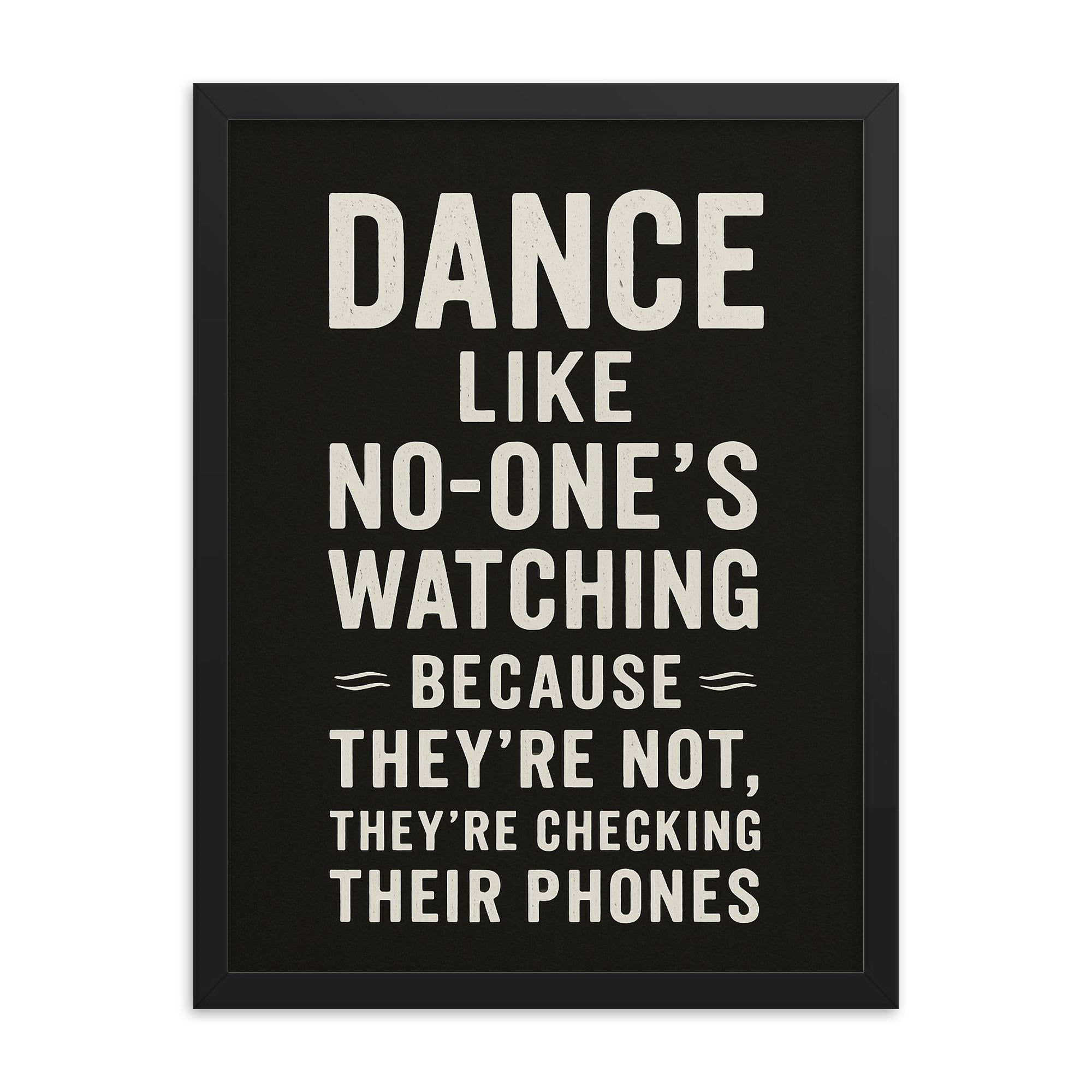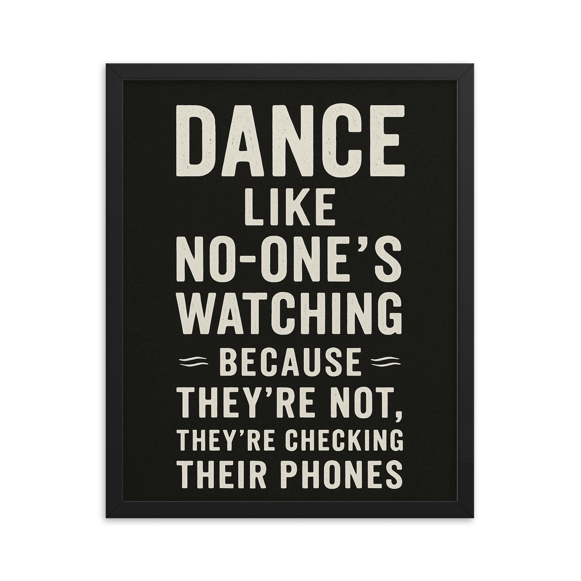 Elevate your space and your mood with this witty and modern framed print: Dance like no one's watching because they're not they're checking their phones.