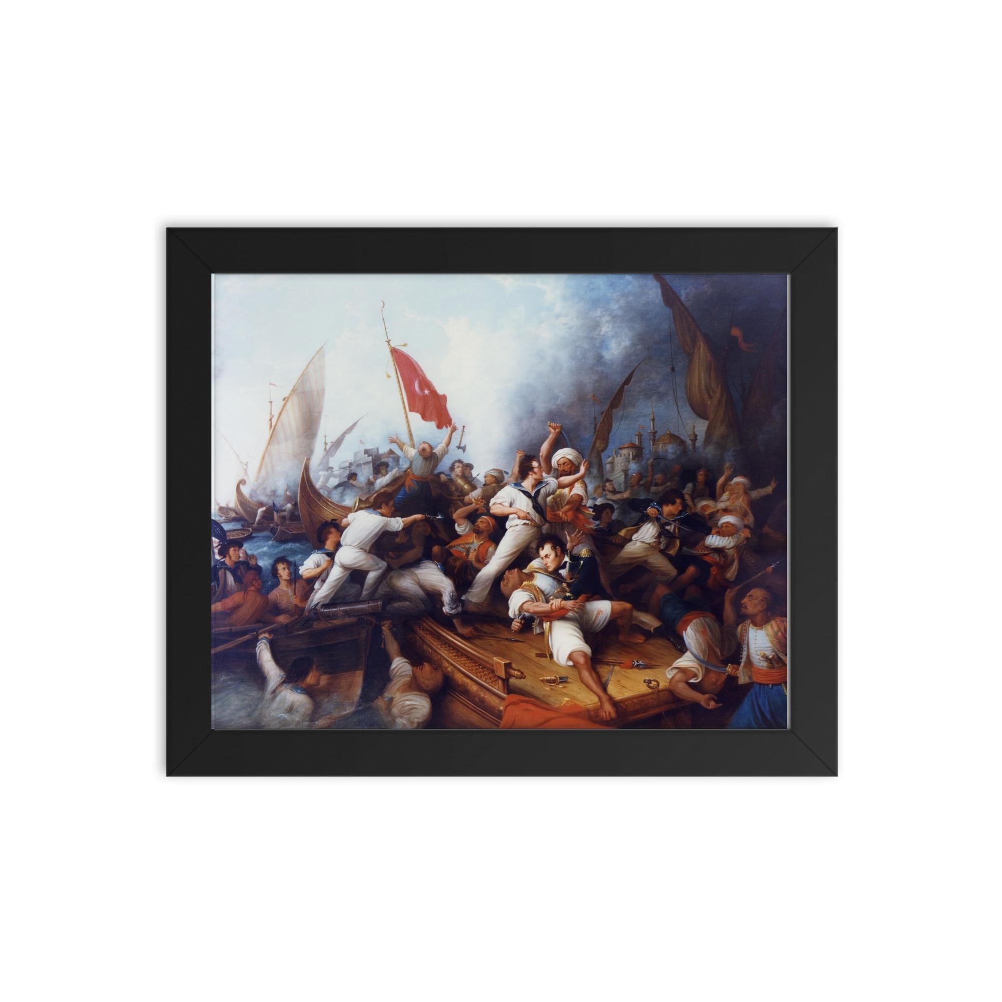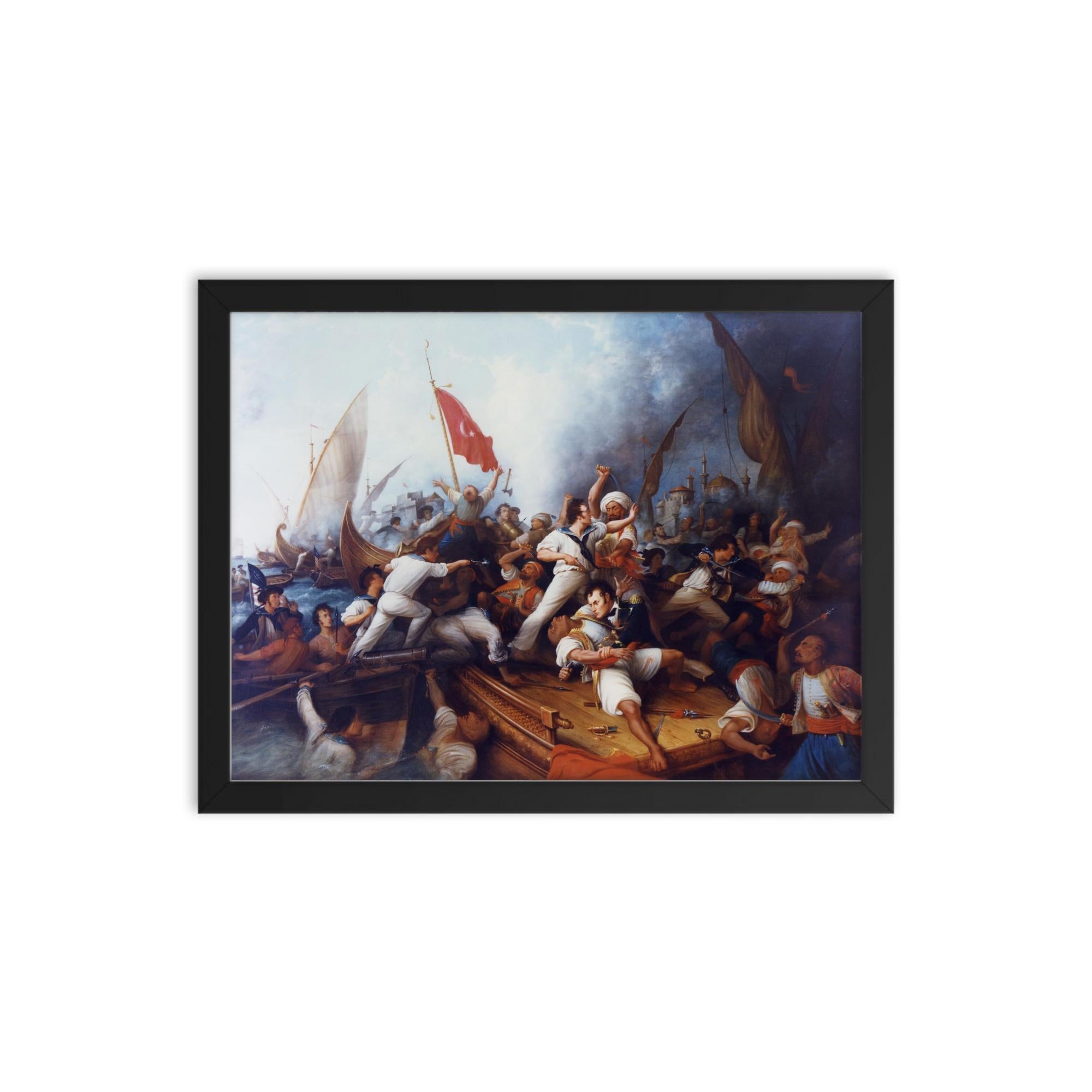 Capture a moment of American naval heroism with this stunning framed wall art: *Decatur Boarding the Tripolitan Gunboat* by renowned artist Dennis Malone Carter (1878).