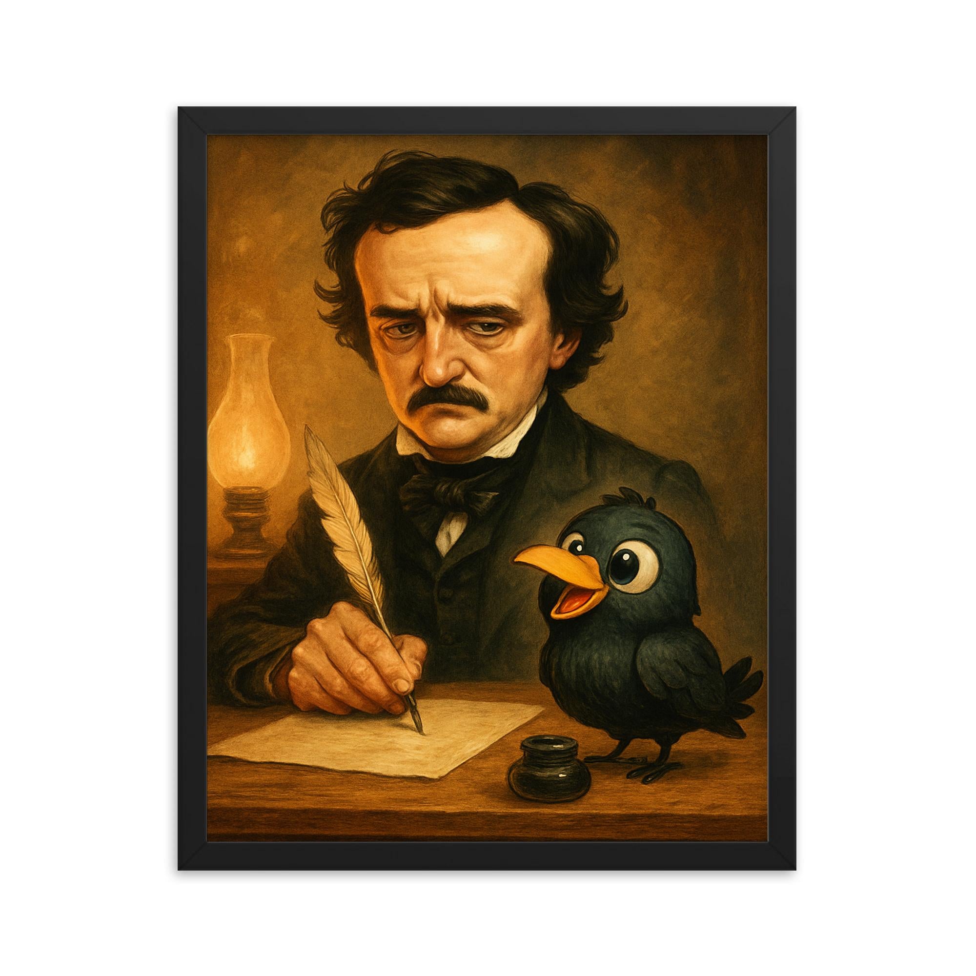 Discover a charming blend of literary history and playful whimsy with this framed print of Edgar Allan Poe trying to write at his desk—while ignoring a cartoonishly cute raven perched nearby.