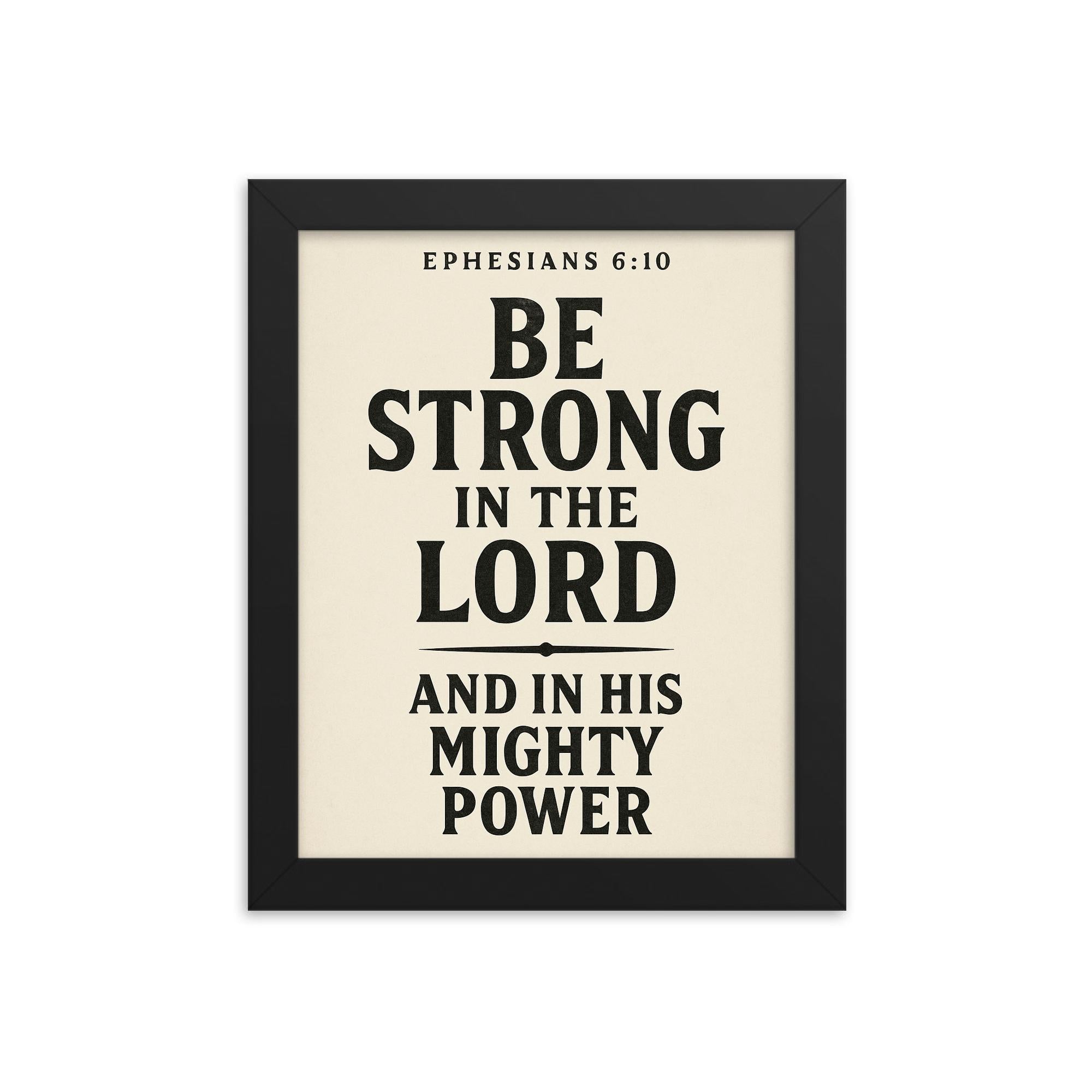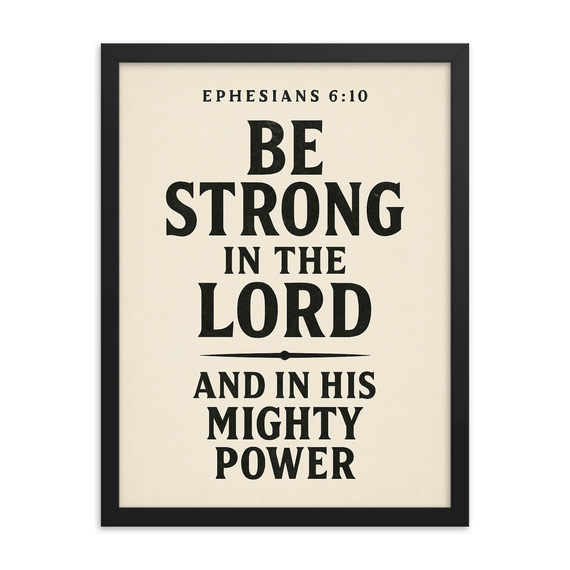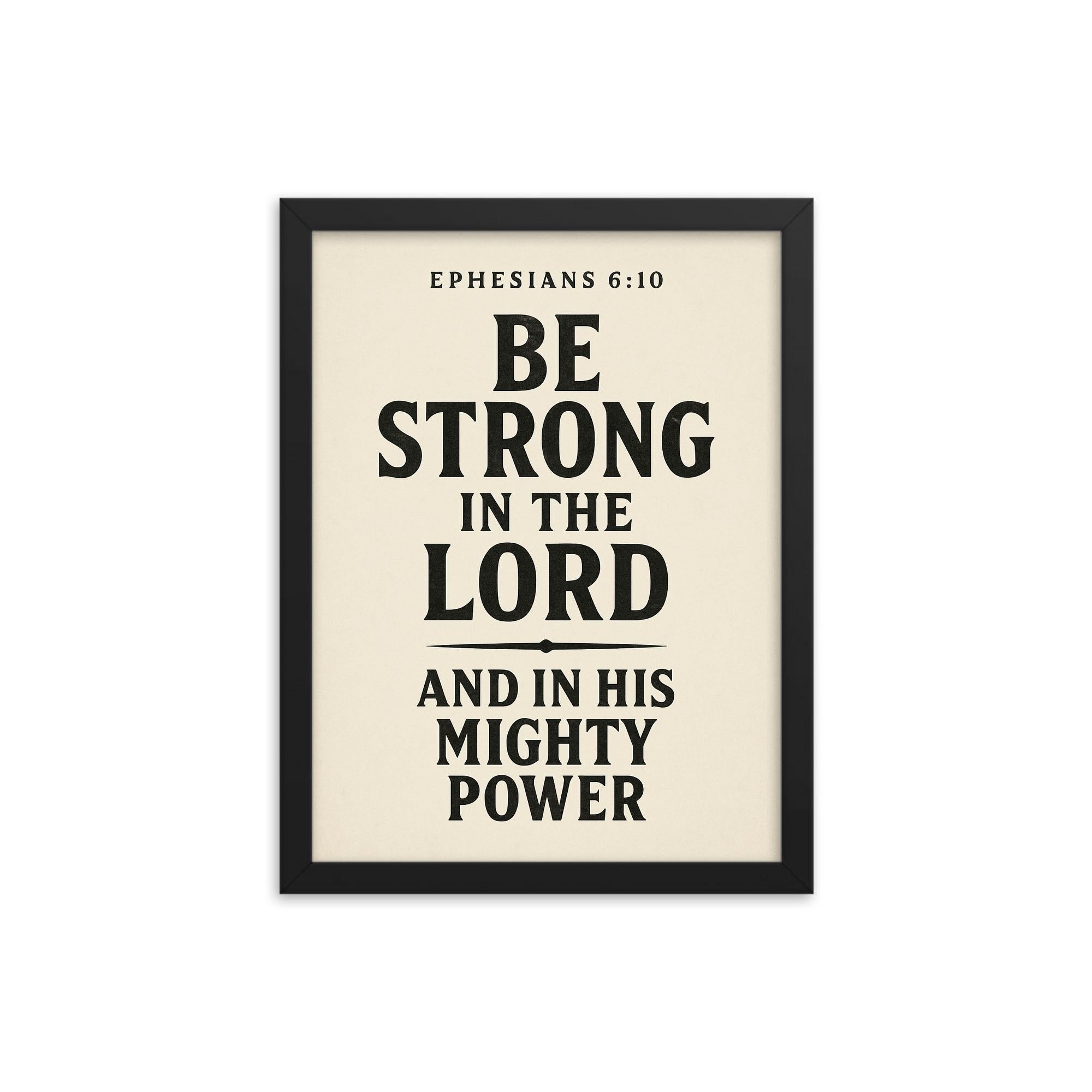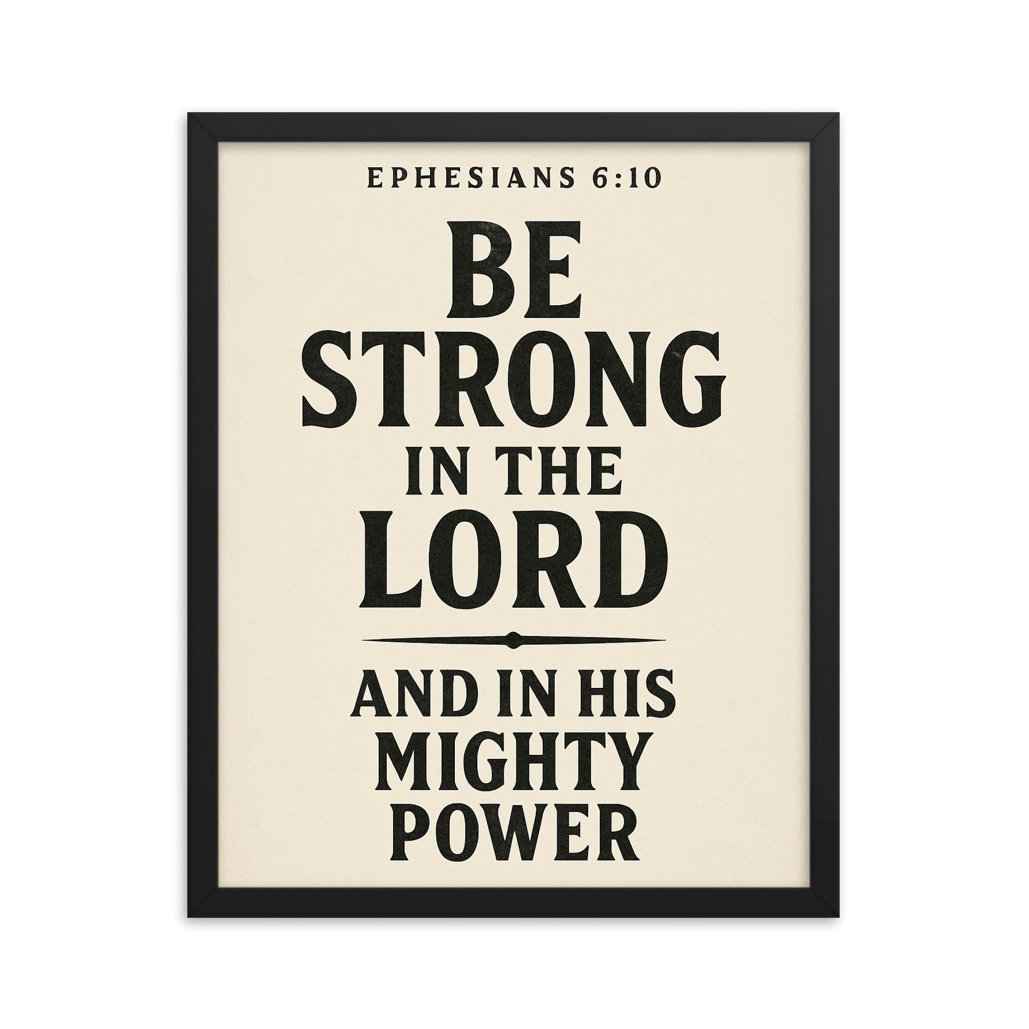 Elevate your space with inspiring faith and timeless strength through this beautifully crafted framed print of Ephesians 6:10 – Be strong in the Lord and in his mighty power.