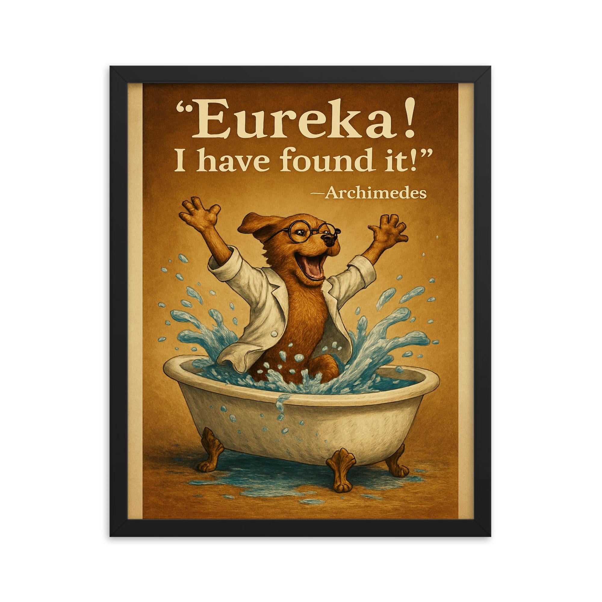 Excited Scientist Dog Archimedes Eureka Bathtub Framed Print – Whimsical Water Displacement Wall Art for Science Lovers