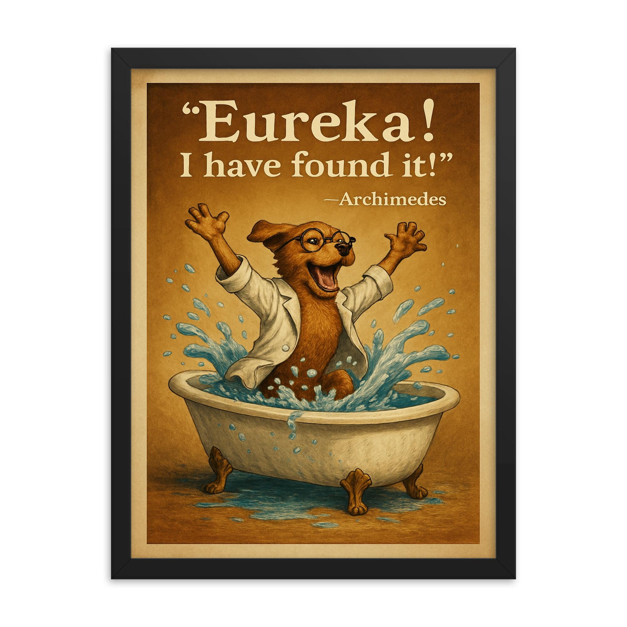 Bring Genius and Joy Home with the "Excited Scientist Dog Archimedes Eureka Jumping from Bathtub" Framed Print Unleash a celebration of curiosity and creativity in your space with this charming framed print—a perfect tribute to one of history’s great discoveries, reimagined through the playful lens of man’s best friend! Perfect for science lovers, dog enthusiasts, teachers, students, or anyone who wants a smile on their wall, this artwork radiates both inspiration and fun. Whether for your home, office, lab, or classroom, it’s guaranteed to spark conversations and invite admiration. Why You’ll Love This Wall Art: • Instantly captivating—this print combines the timeless spirit of scientific discovery with delightful canine energy • Versatile gift—thoughtful for graduations, birthdays, housewarmings, or appreciating the science or dog lover in your life • Elevates any space—turn boring walls into a celebration of imagination, wit, and knowledge Quality and Durability, Redefined Crafted with care, each print is professionally mounted in a sleek, modern frame made from lightweight yet robust samba wood. The shatter-resistant plexiglass glazing ensures maximum protection and unbeatable longevity—your art stays flawless, beautiful, and safe whether hung in bustling classrooms, lively living rooms, or energetic offices. Ready to hang right out of the box, this framed print makes transforming your space effortless. No fuss, no stress—just pure happiness delivered to your door. Order now and let the spirit of discovery and playful charm uplift your world! Let this unique scientist dog wall art be the conversation starter you’ve been searching for—and a daily reminder that genius can leap out of the bath (or imagination) at any moment.