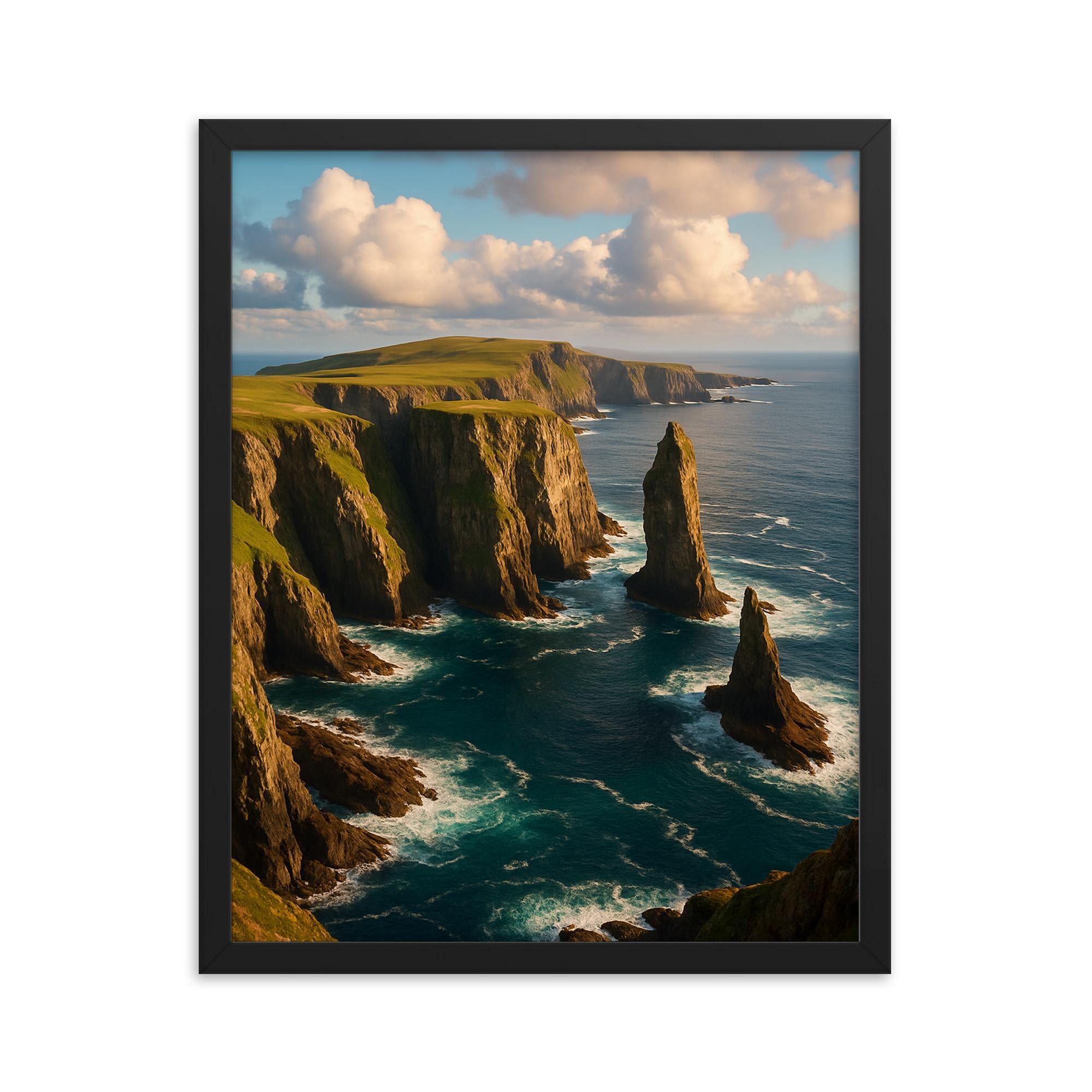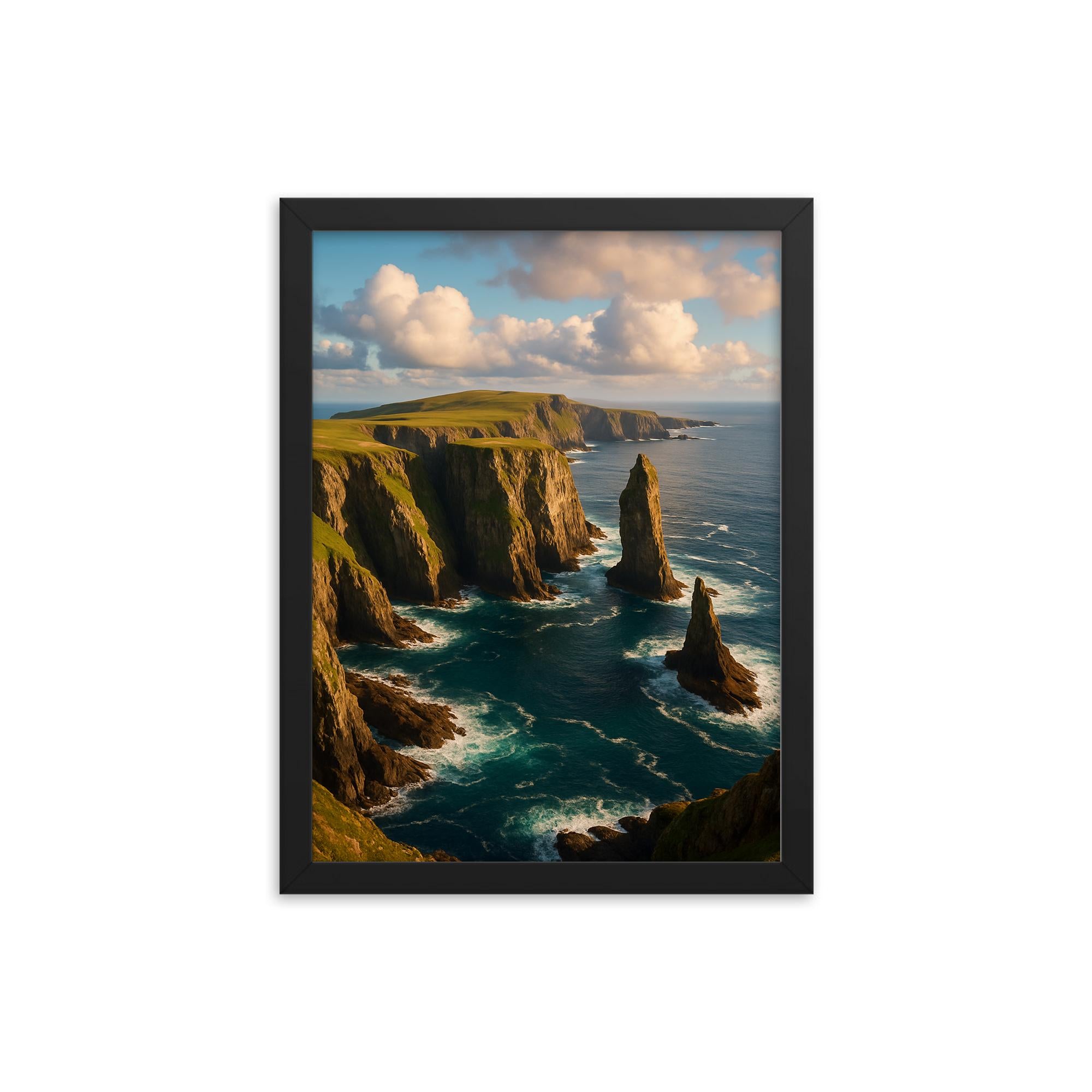 Transform your living space with the breathtaking beauty of the Fair Isle Sea Cliffs Scotland framed print — an exquisite piece of wall art that brings the rugged charm of Scotland’s coastline into your home.