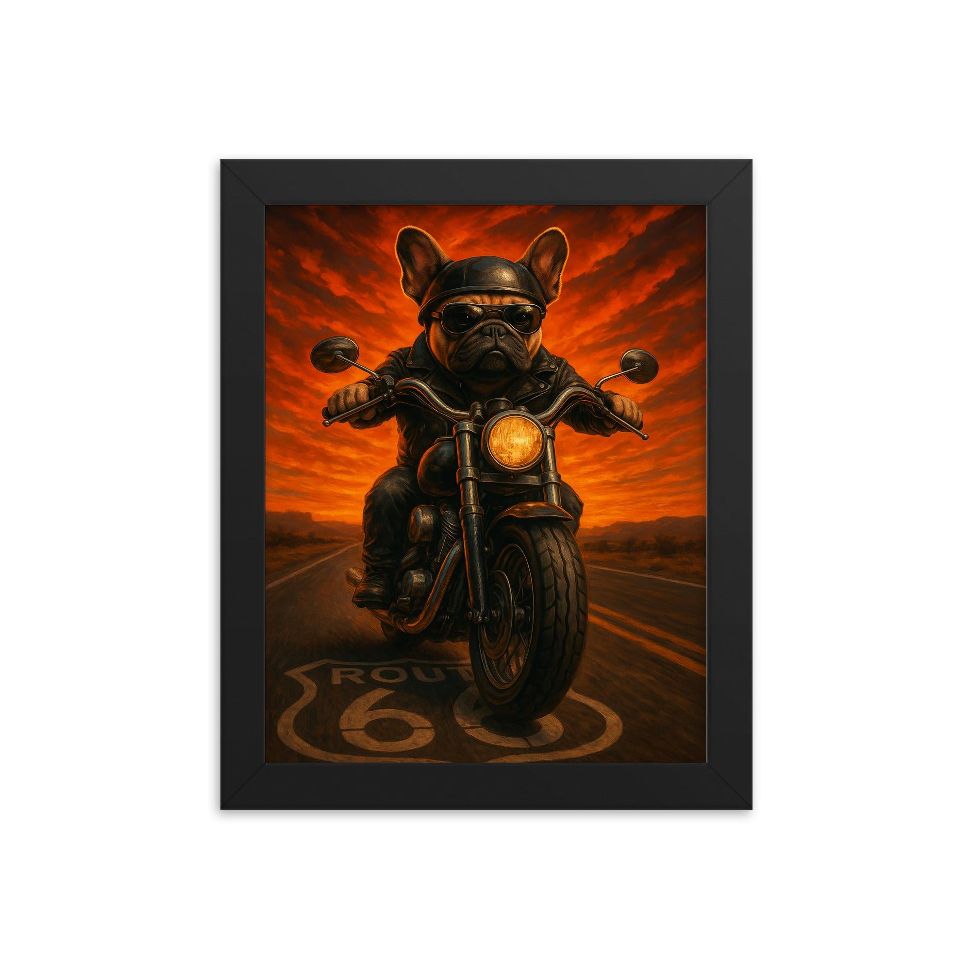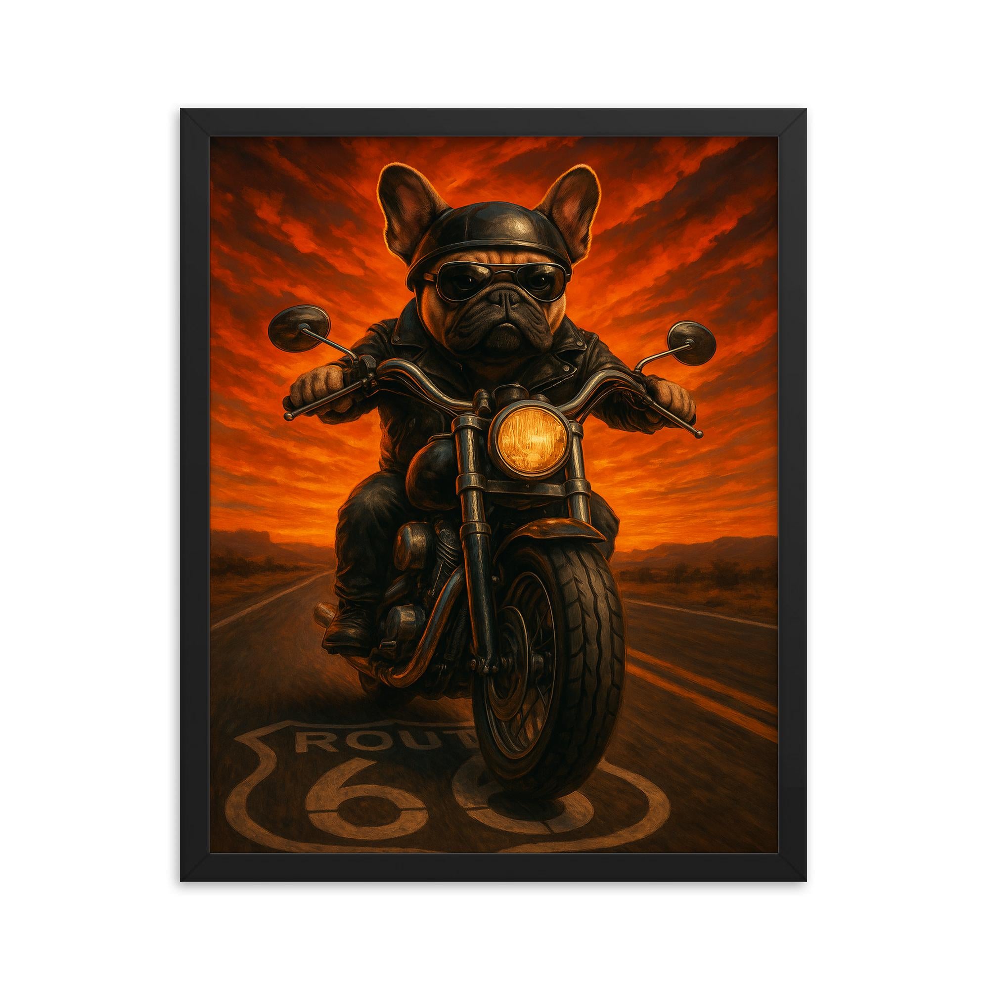 Bring the spirit of adventure and the charm of a classic American highway into your home with this striking framed print of a French Bulldog biker roaring down Route 66 against a fiery sunset.