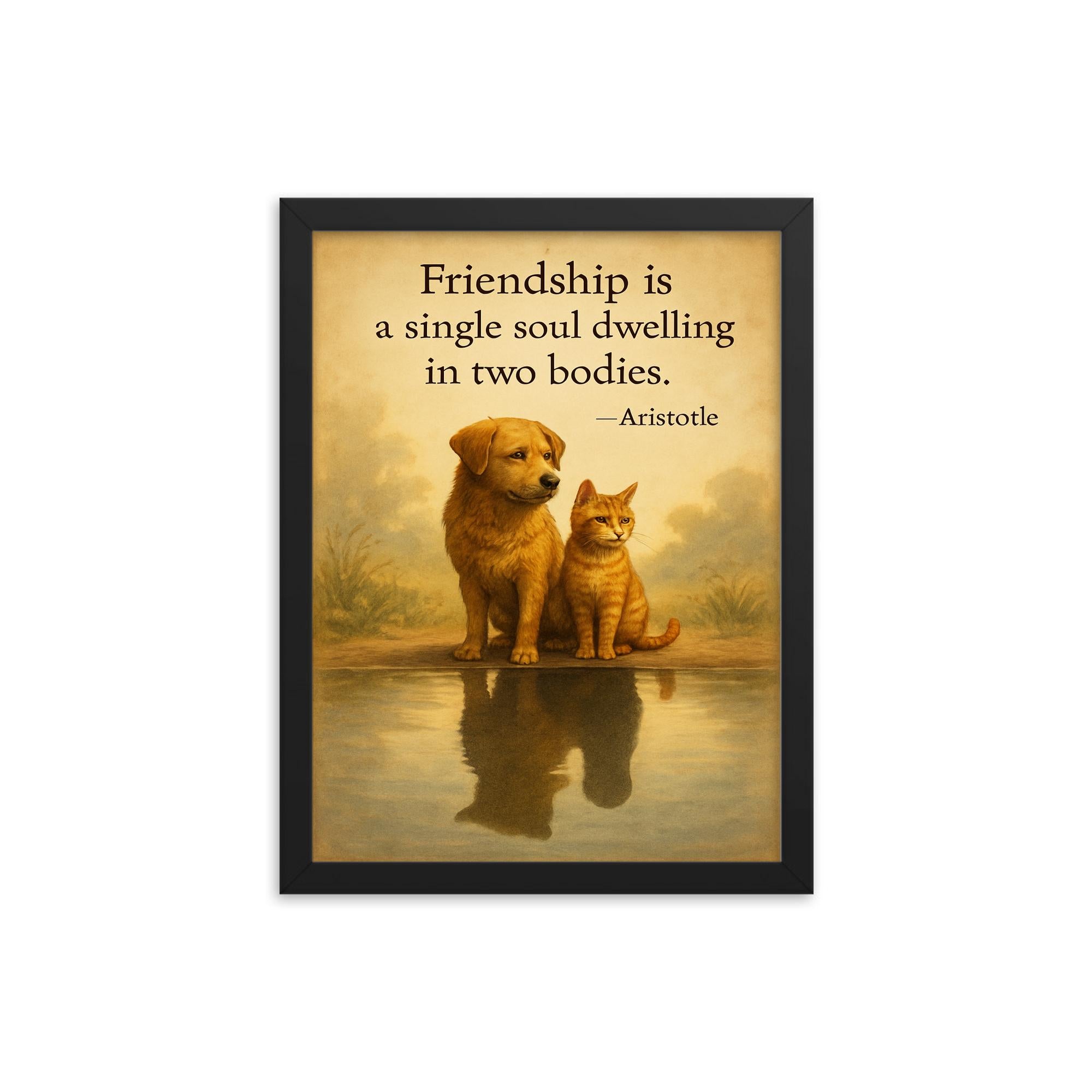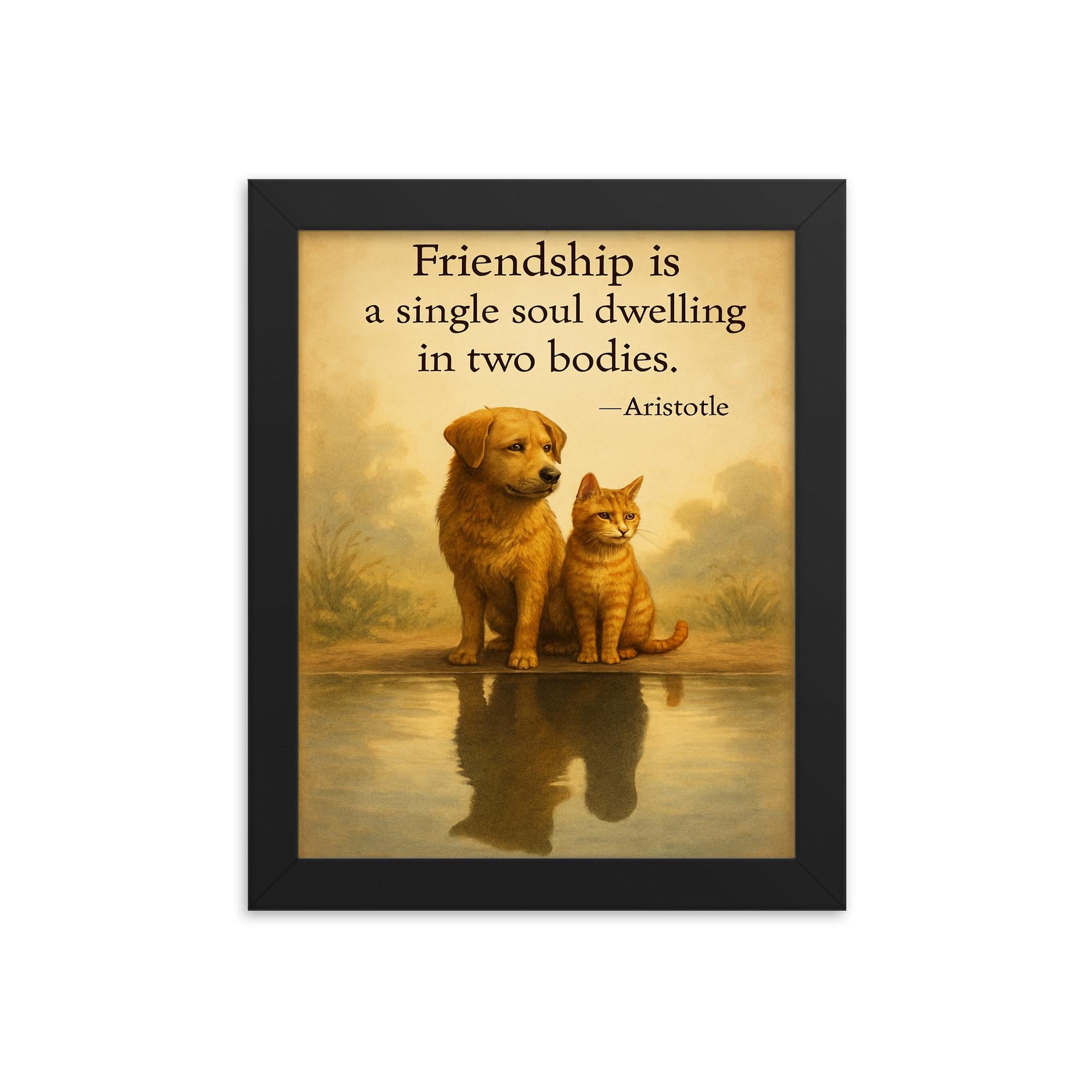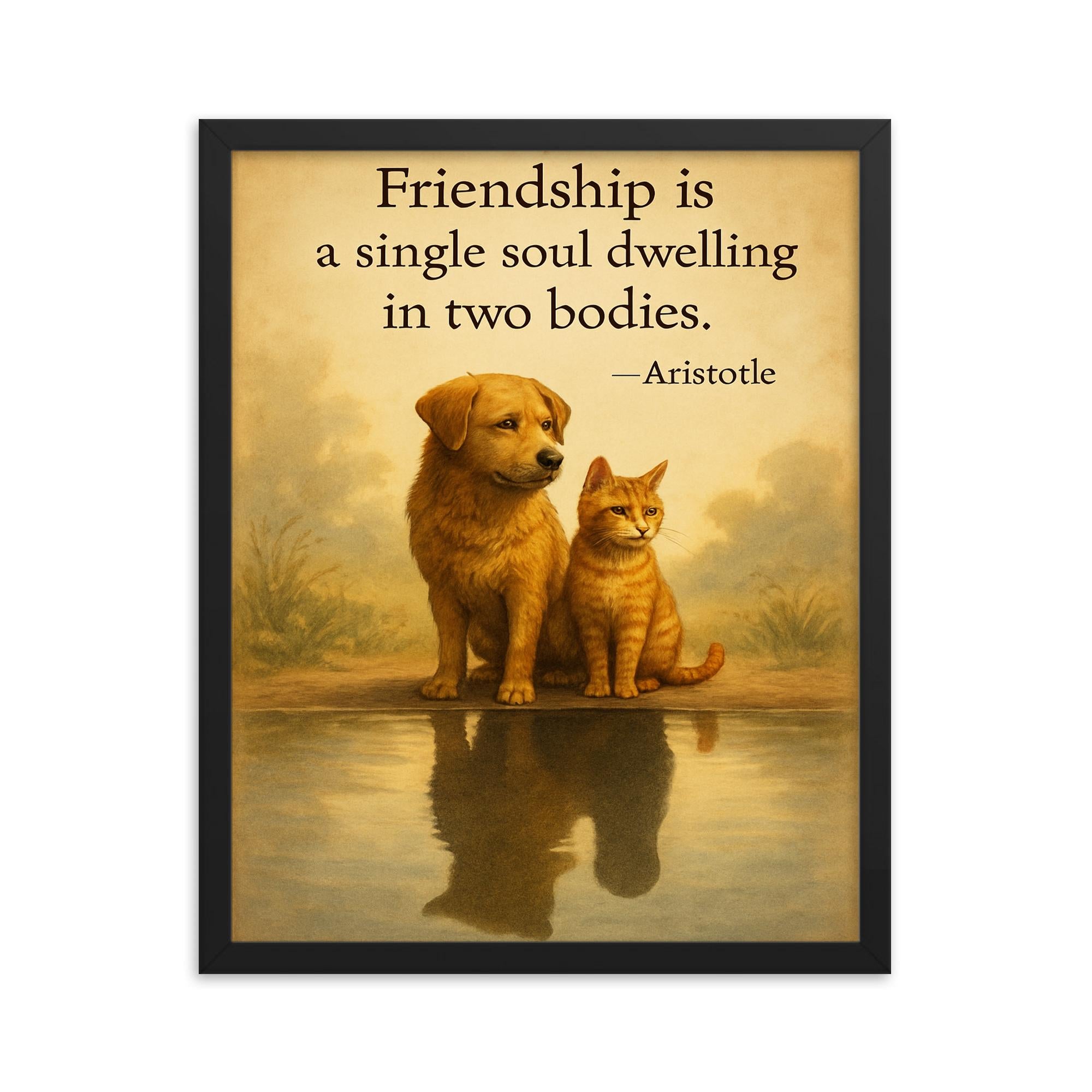 Celebrate the beauty of true friendship with our exquisite framed print, inspired by Aristotle’s timeless wisdom: *"Friendship is a single soul dwelling in two bodies."* This uplifting wall art features two animals in a shared reflection, capturing the magic of togetherness and the inspiration found in mutual connection.