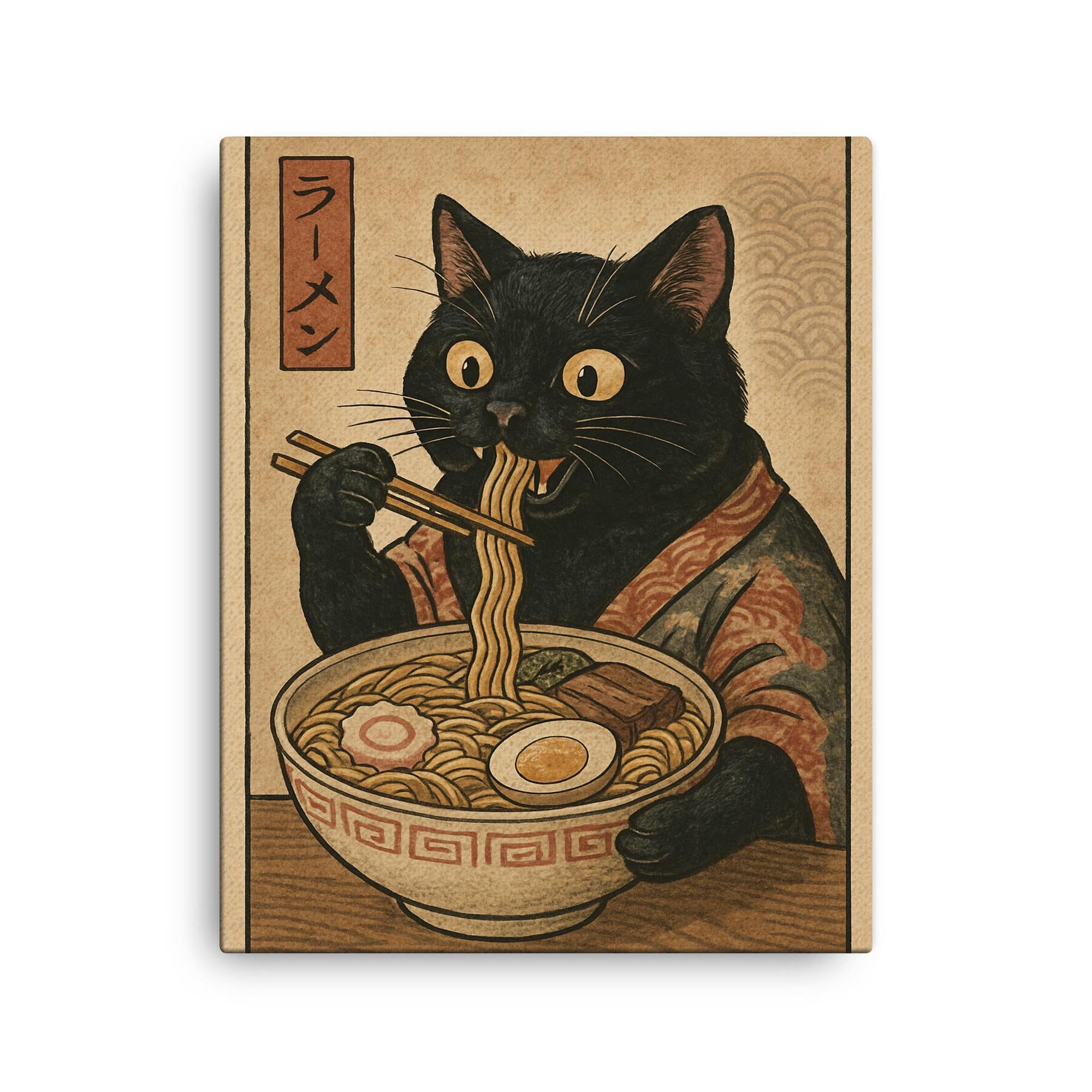 Add a splash of whimsy and cultural charm to your space with this delightful canvas print featuring a funny black cat enjoying ramen noodles, inspired by vintage Japanese woodblock art.