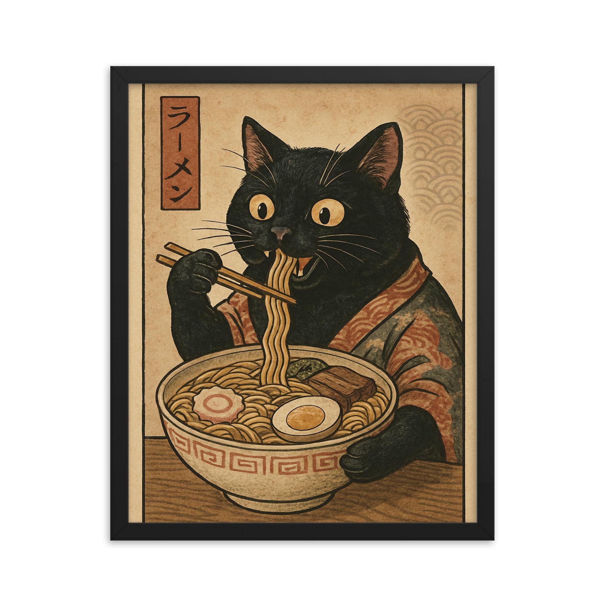 Bring a playful twist of culture and charm to your walls with this framed print featuring a funny black cat enjoying ramen noodles, rendered in the style of a vintage Japanese woodblock print.
