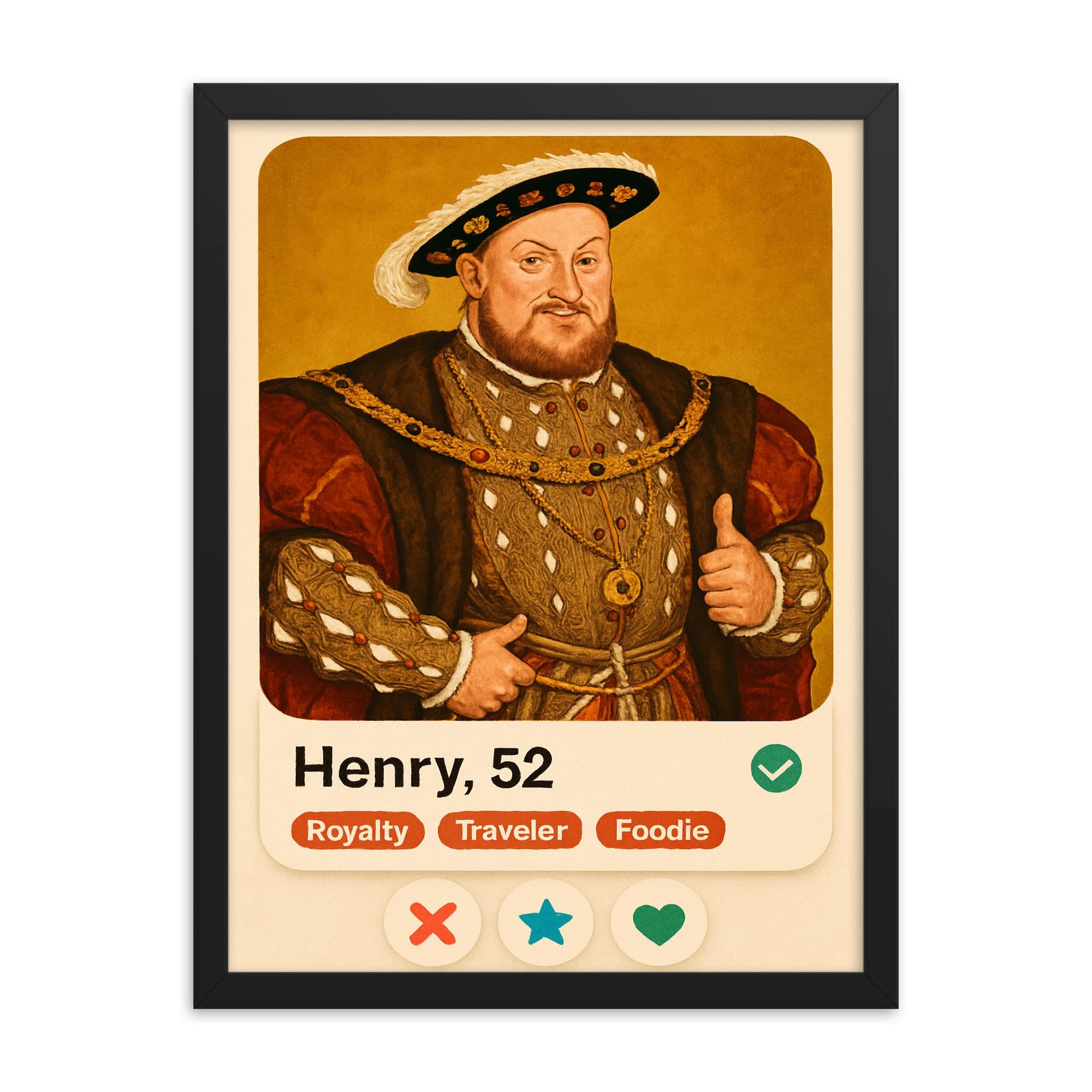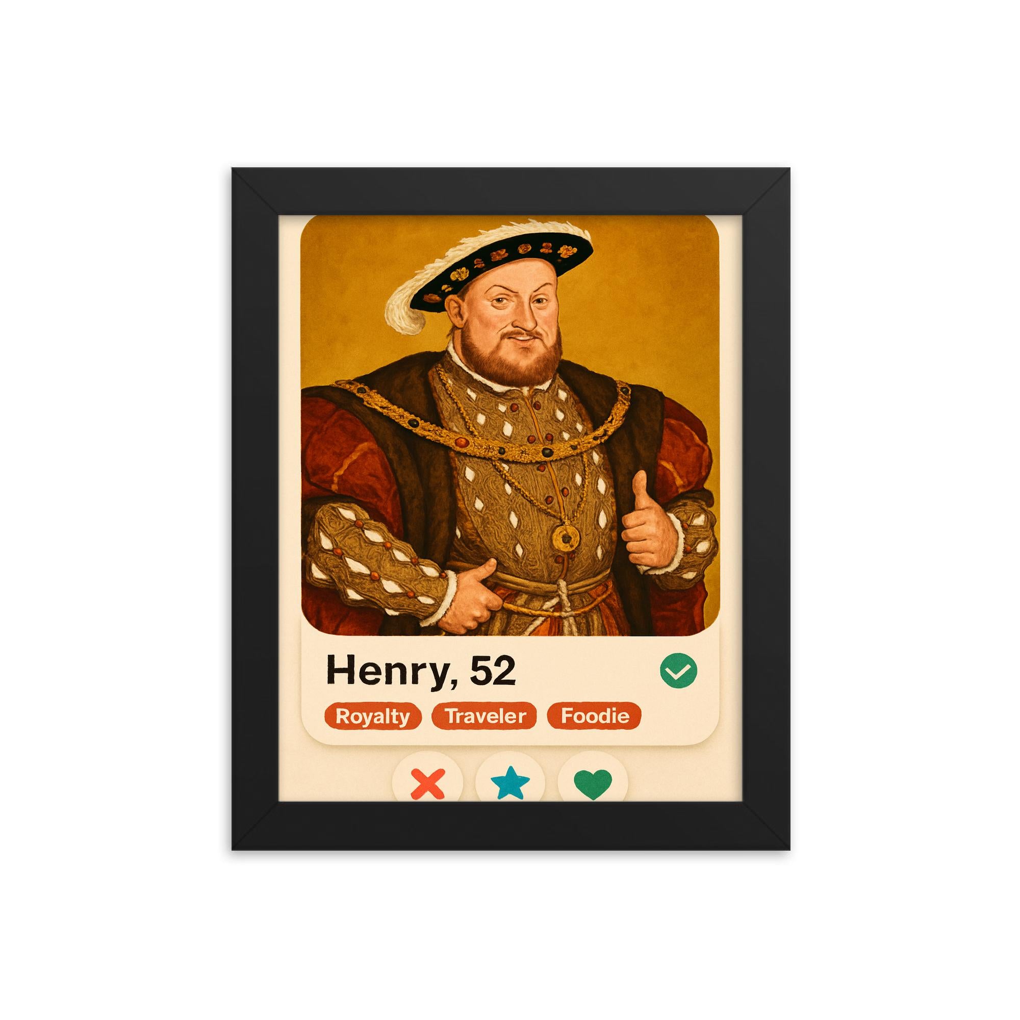 Inject a dose of royal humor into your space with this framed print featuring the hilarious "Funny Dating App Profile of Henry VIII." Perfect for history buffs, humor lovers, and anyone who enjoys a clever twist on classic tales, this wall art is guaranteed to spark conversation and smiles wherever it hangs.