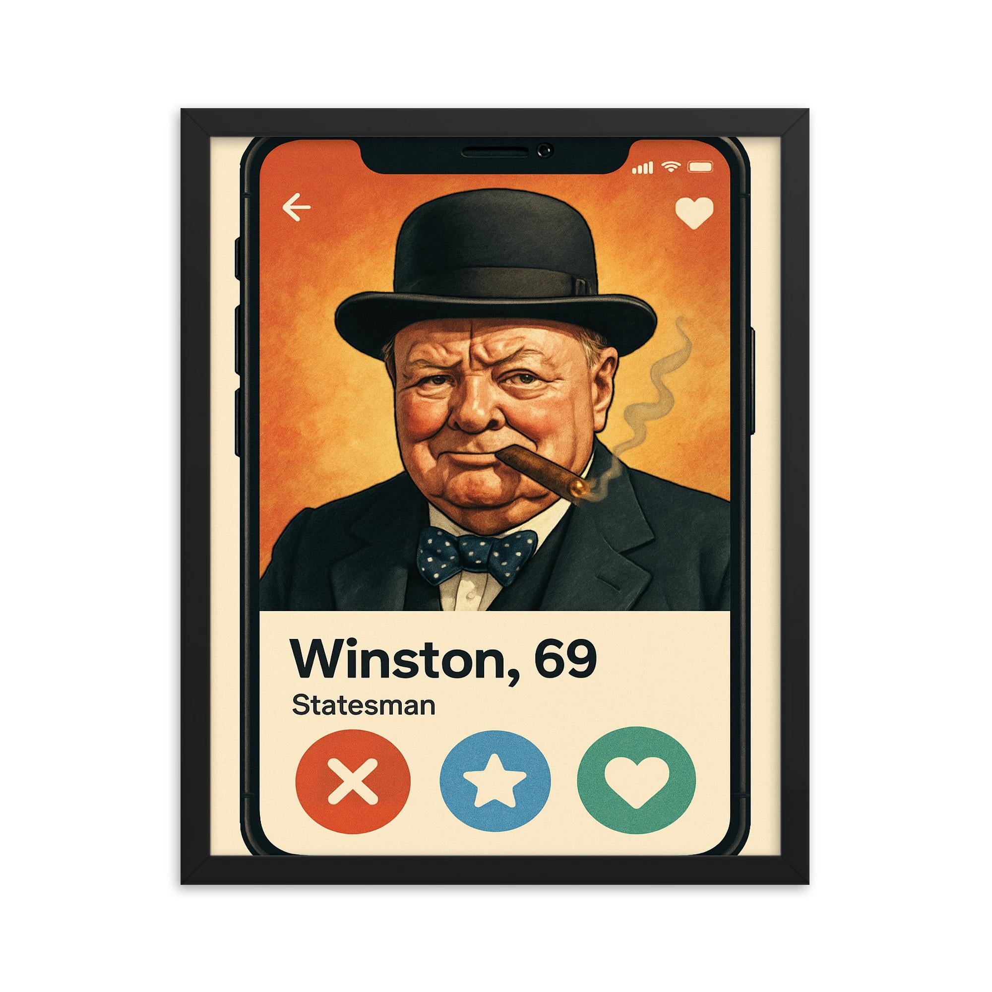 Add a touch of wit and history to your space with this uniquely entertaining framed print of the Funny Dating App Profile of Winston Churchill