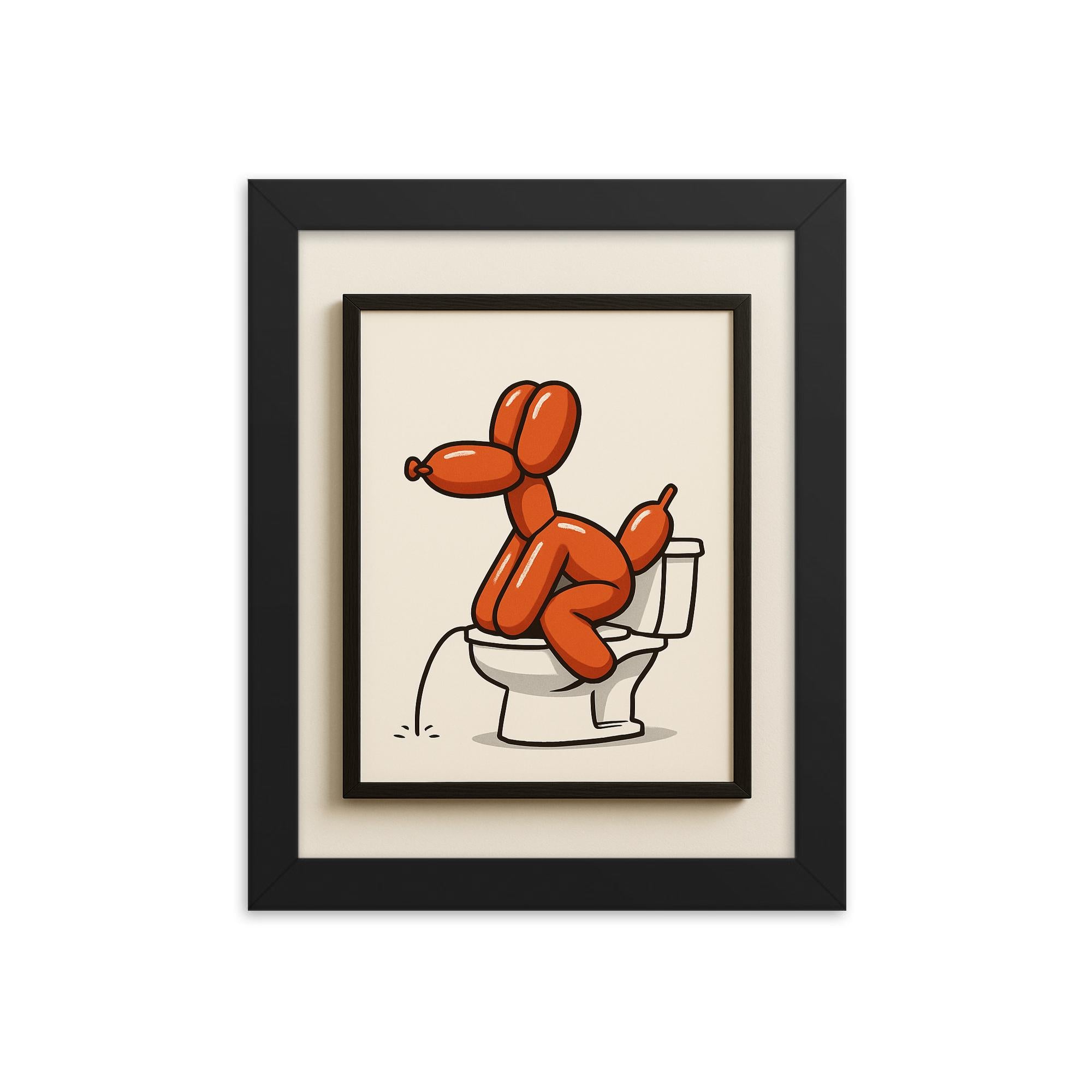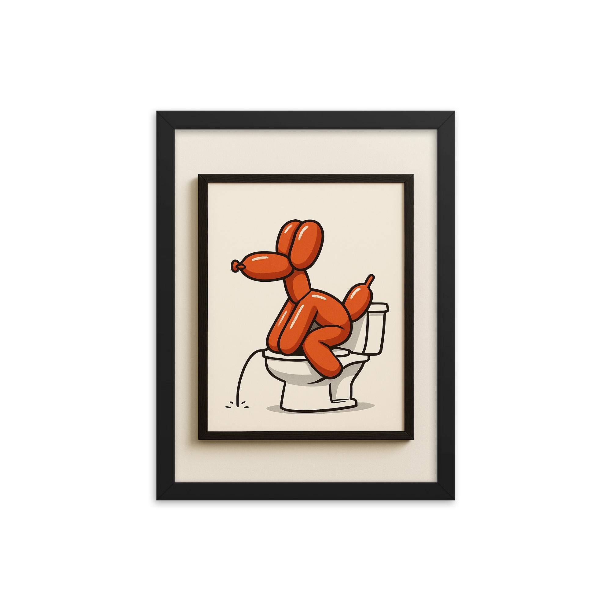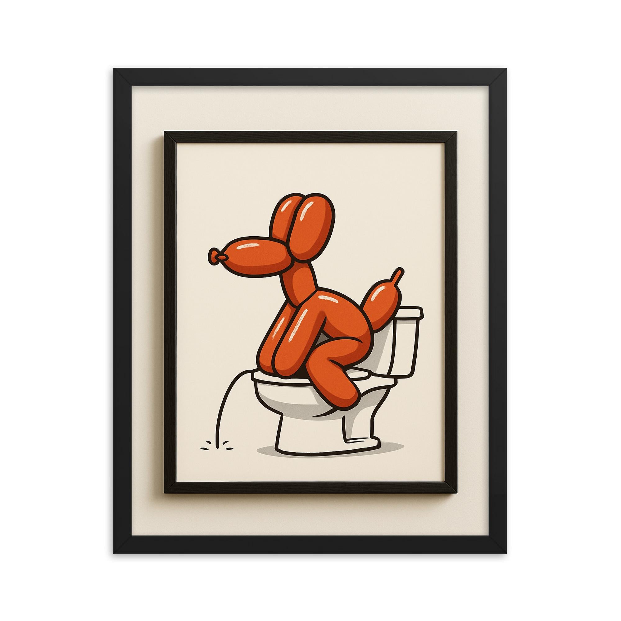 Inject a playful twist into your bathroom or any living space with this hilarious and minimalistic framed print featuring a balloon dog on a quirky bathroom adventure.