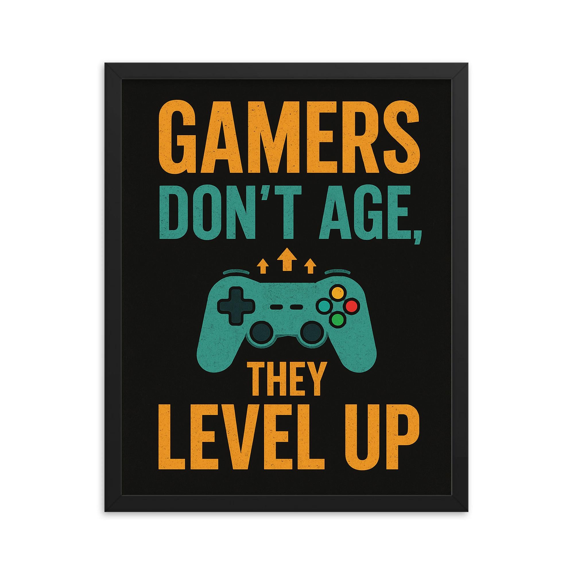 Gamers Don’t Age They Level Up Framed Print – Unique Video Game Wall Art, Cool Decor for Gaming Room, Perfect Gift for Gamers