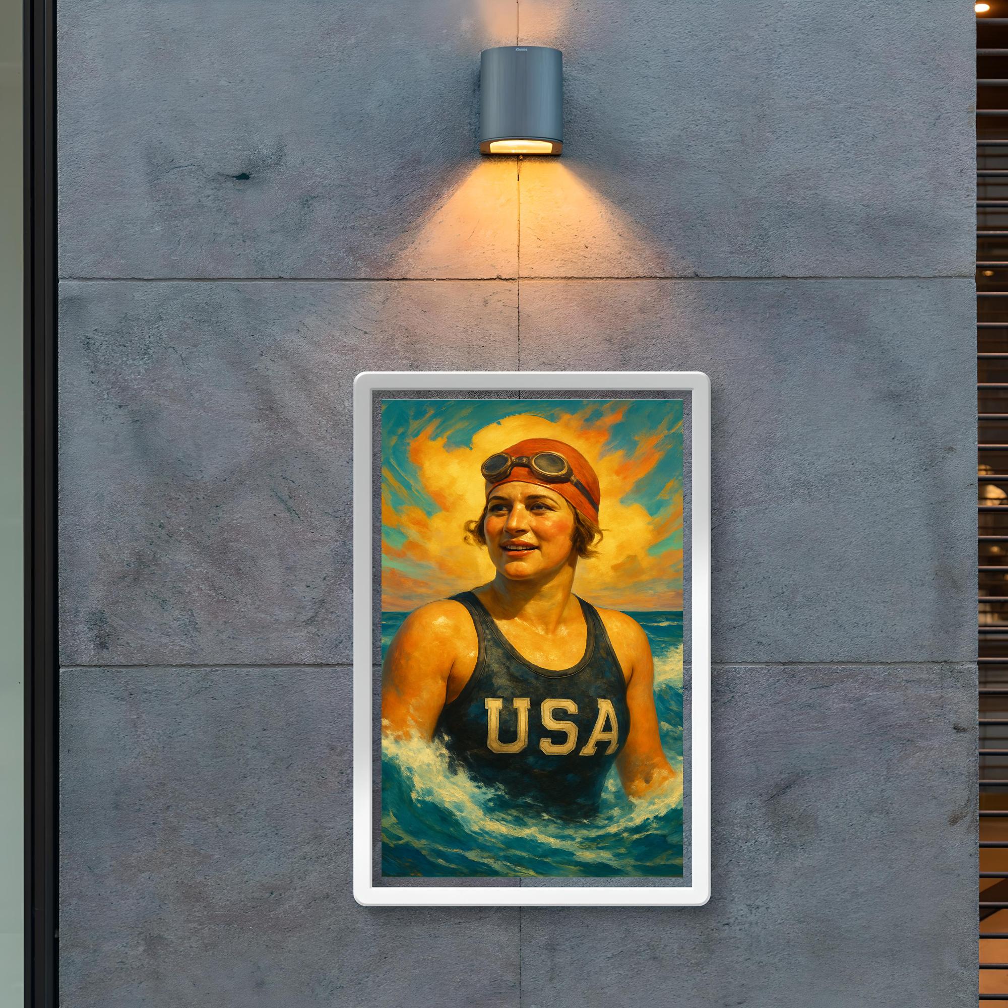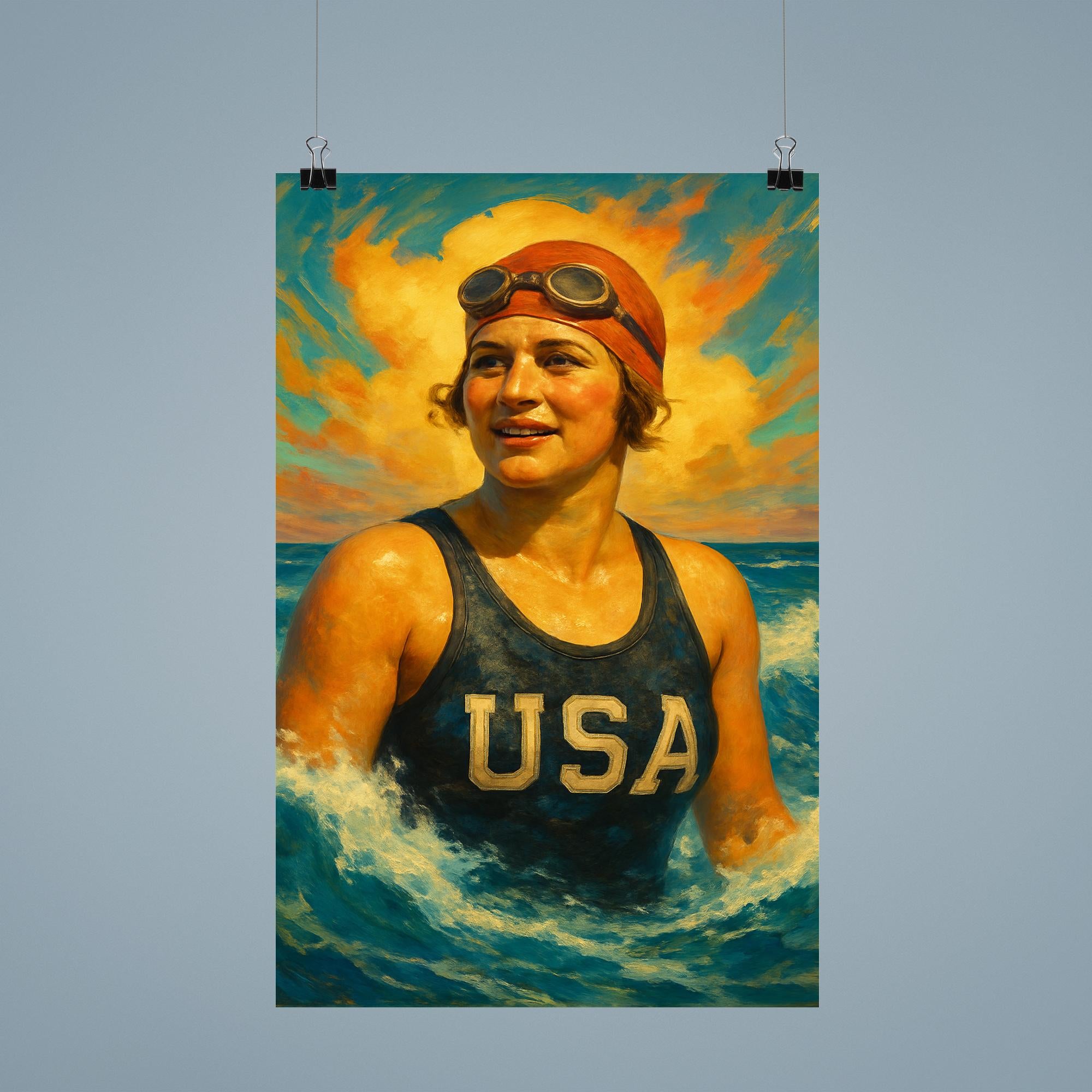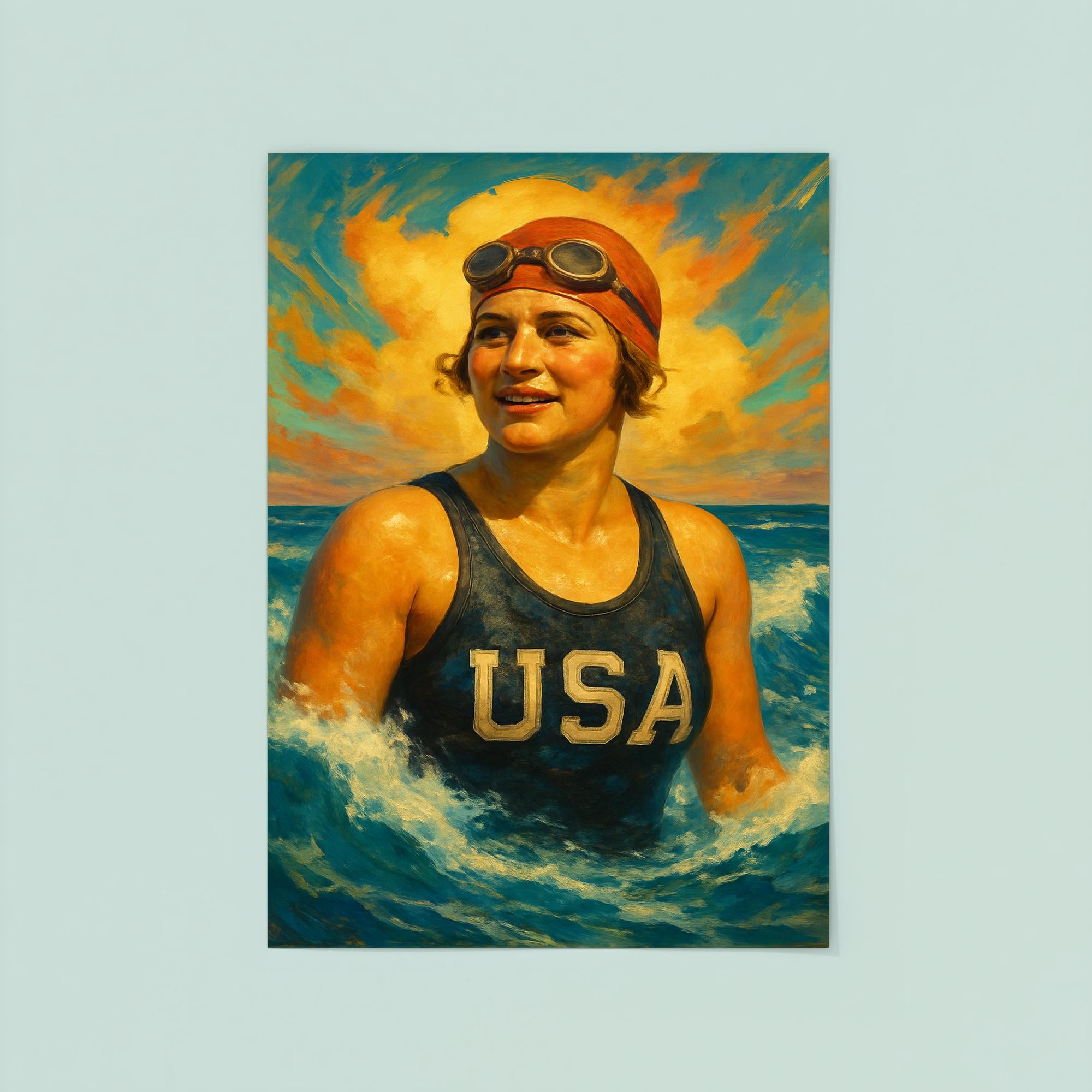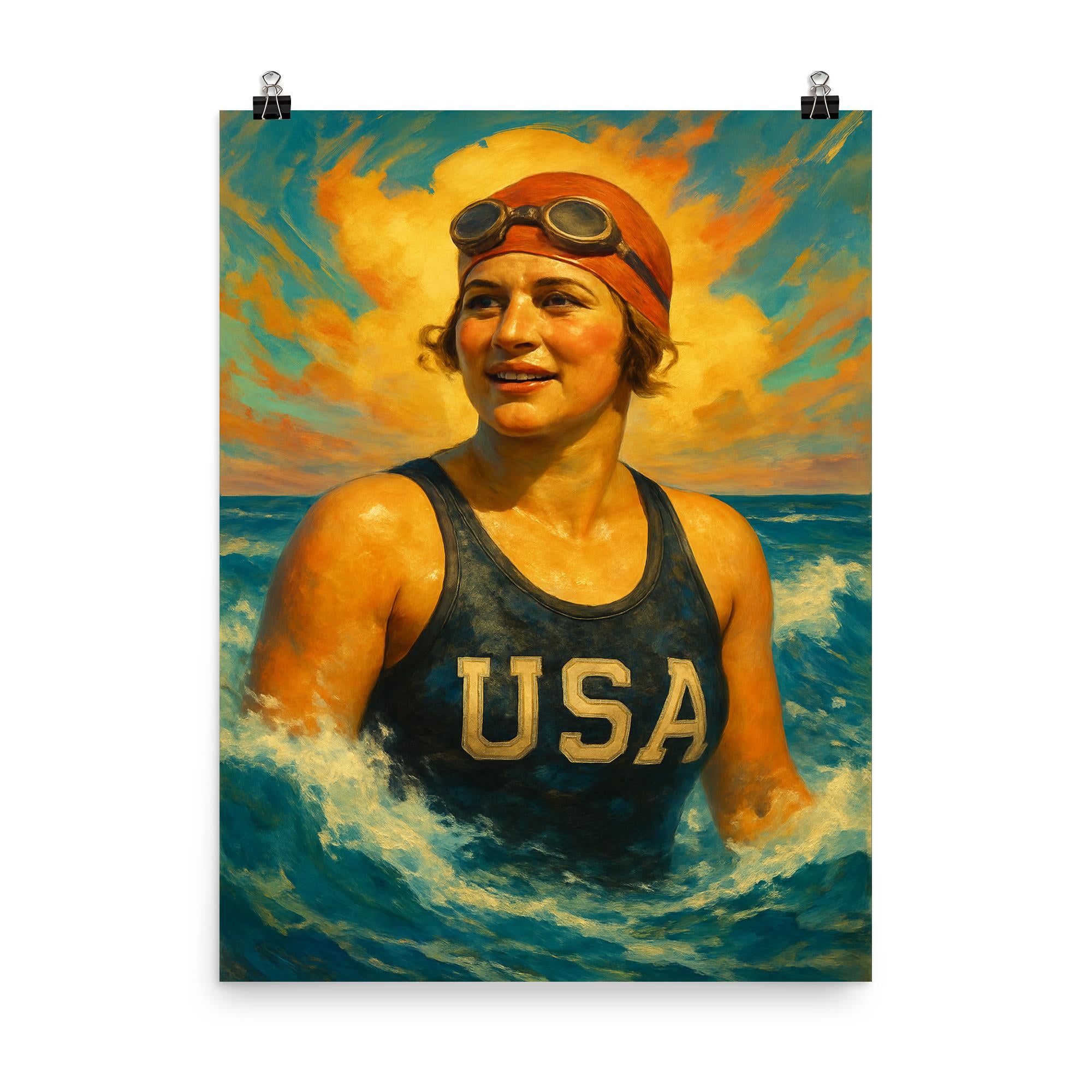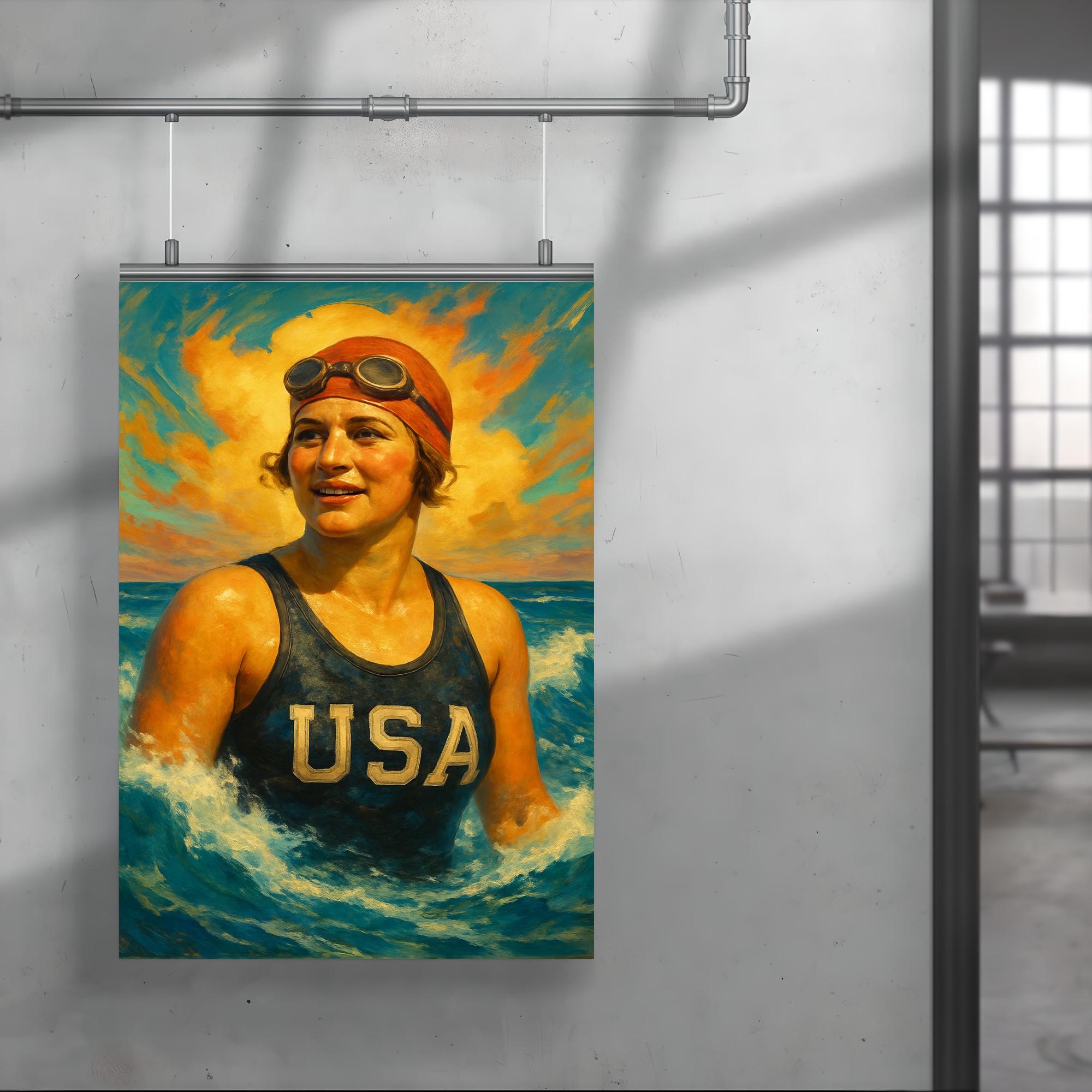 Celebrate the fearless spirit of Gertrude Ederle with this striking poster, capturing the essence of a trailblazing swimmer who defied the odds and made history. Whether displayed in your home or office, this powerful tribute inspires courage, determination, and the pursuit of greatness every time you see it.