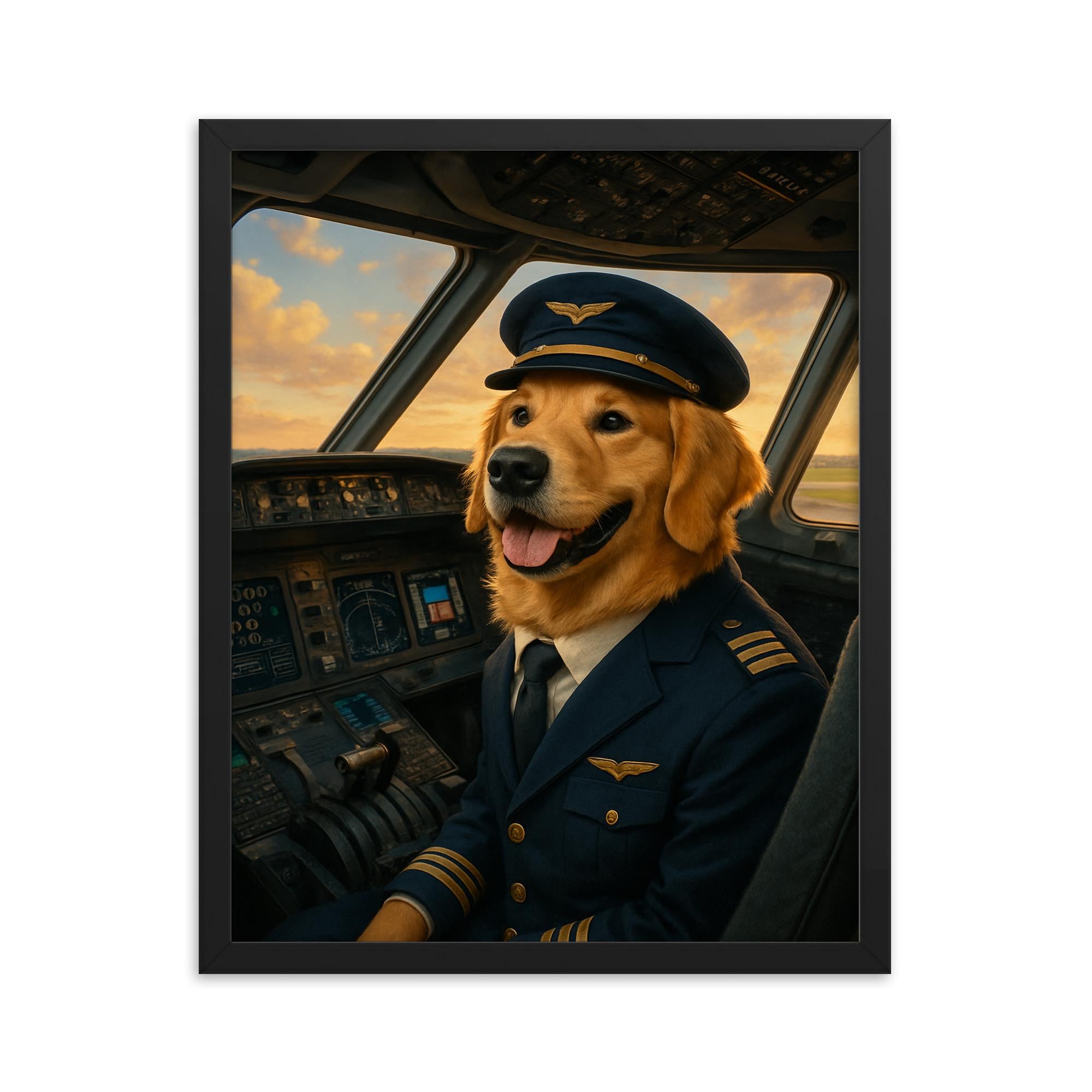 Transform your space with this charming framed print of a Golden Retriever airline pilot in the cockpit, ready for takeoff.