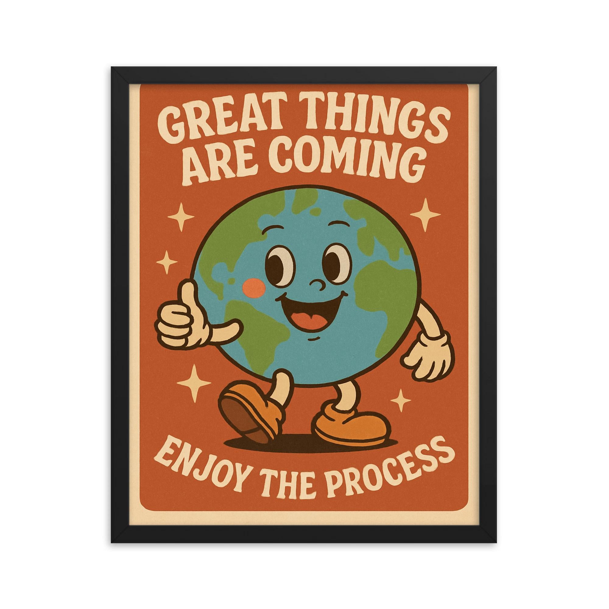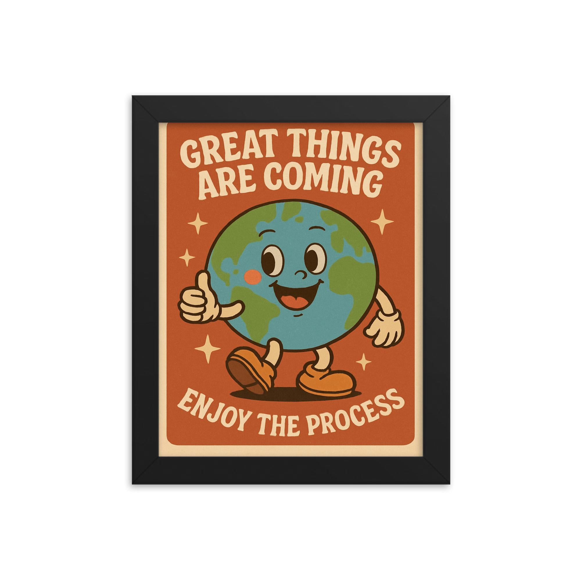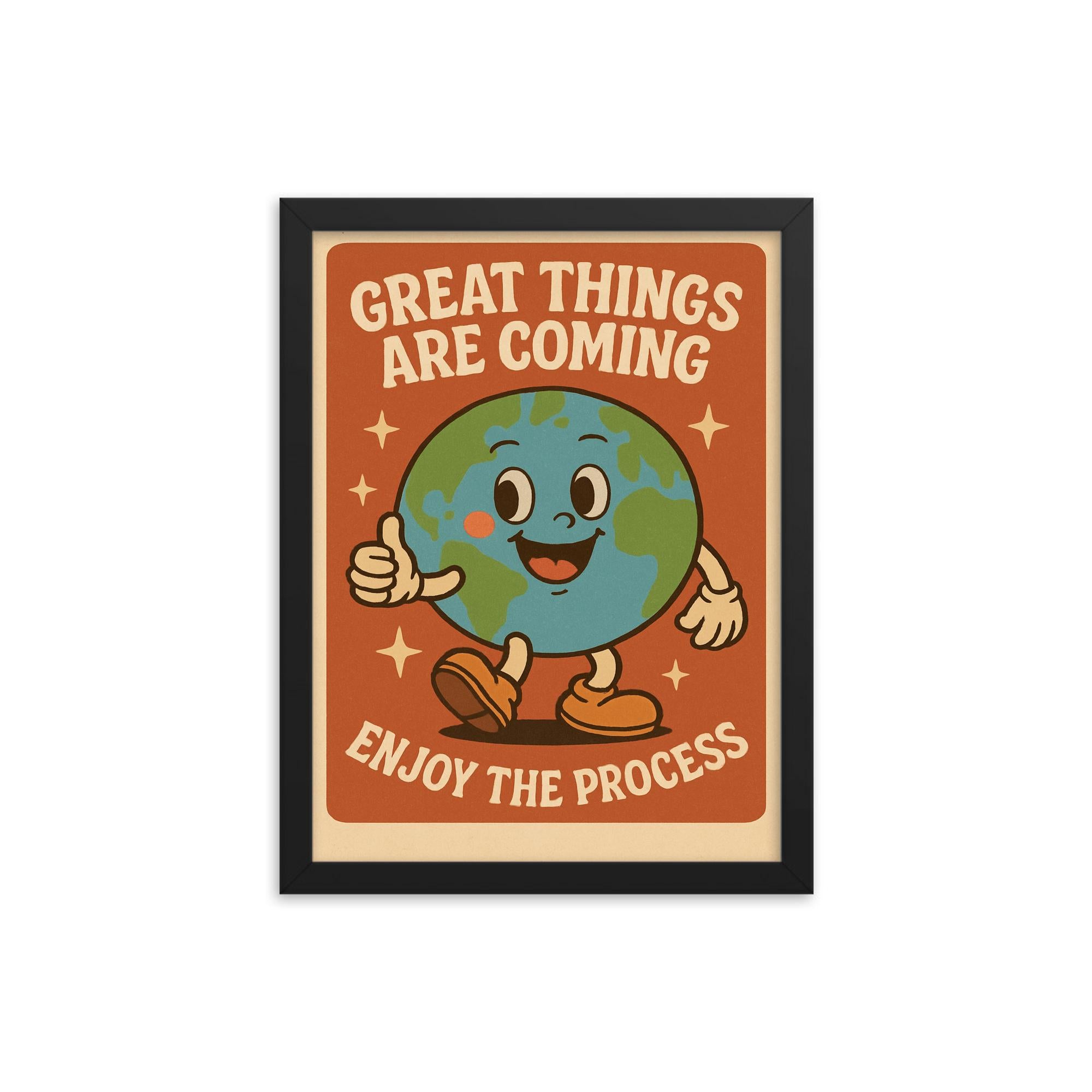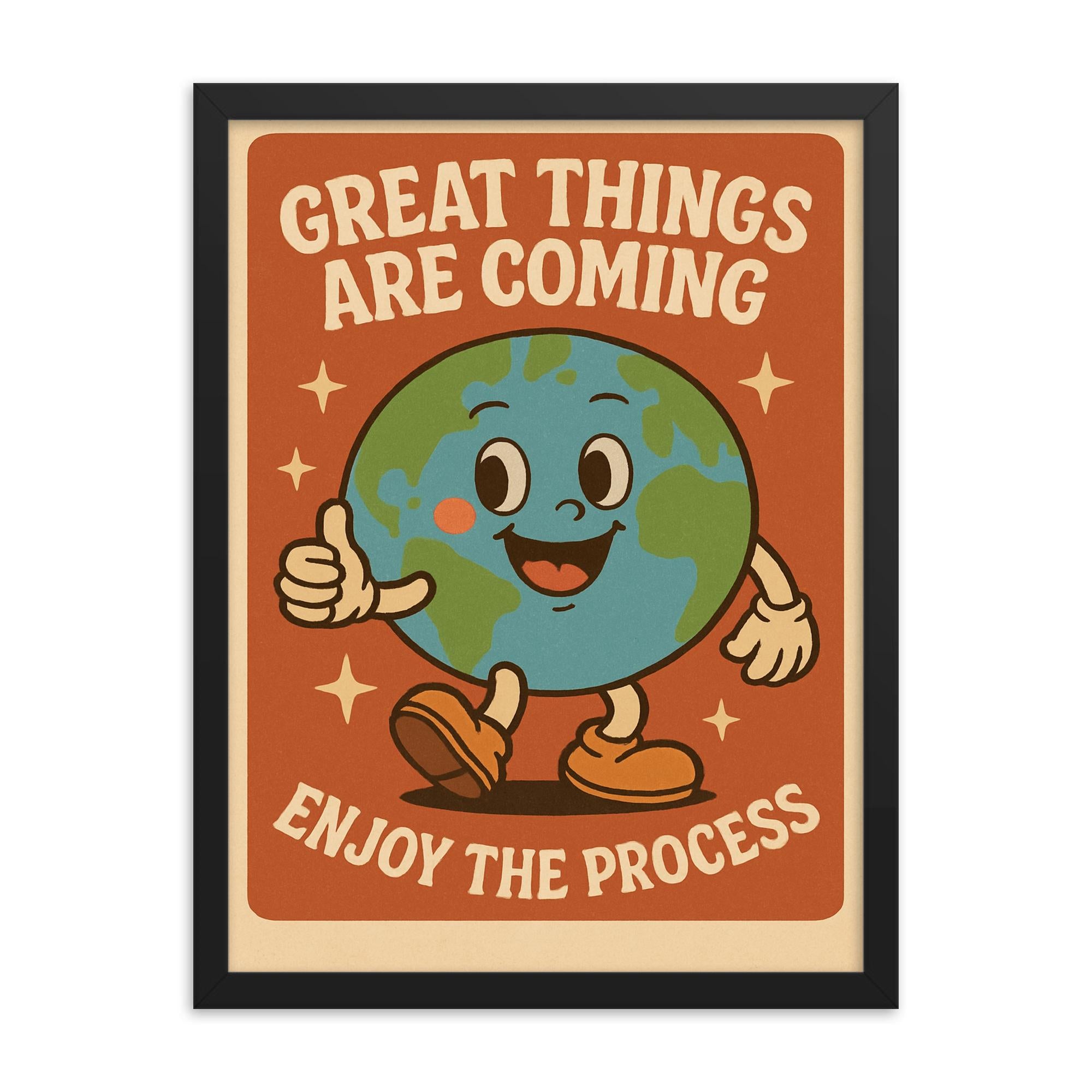 This framed print features a delightful retro cartoon earth design paired with the uplifting message: Great things are coming enjoy the process